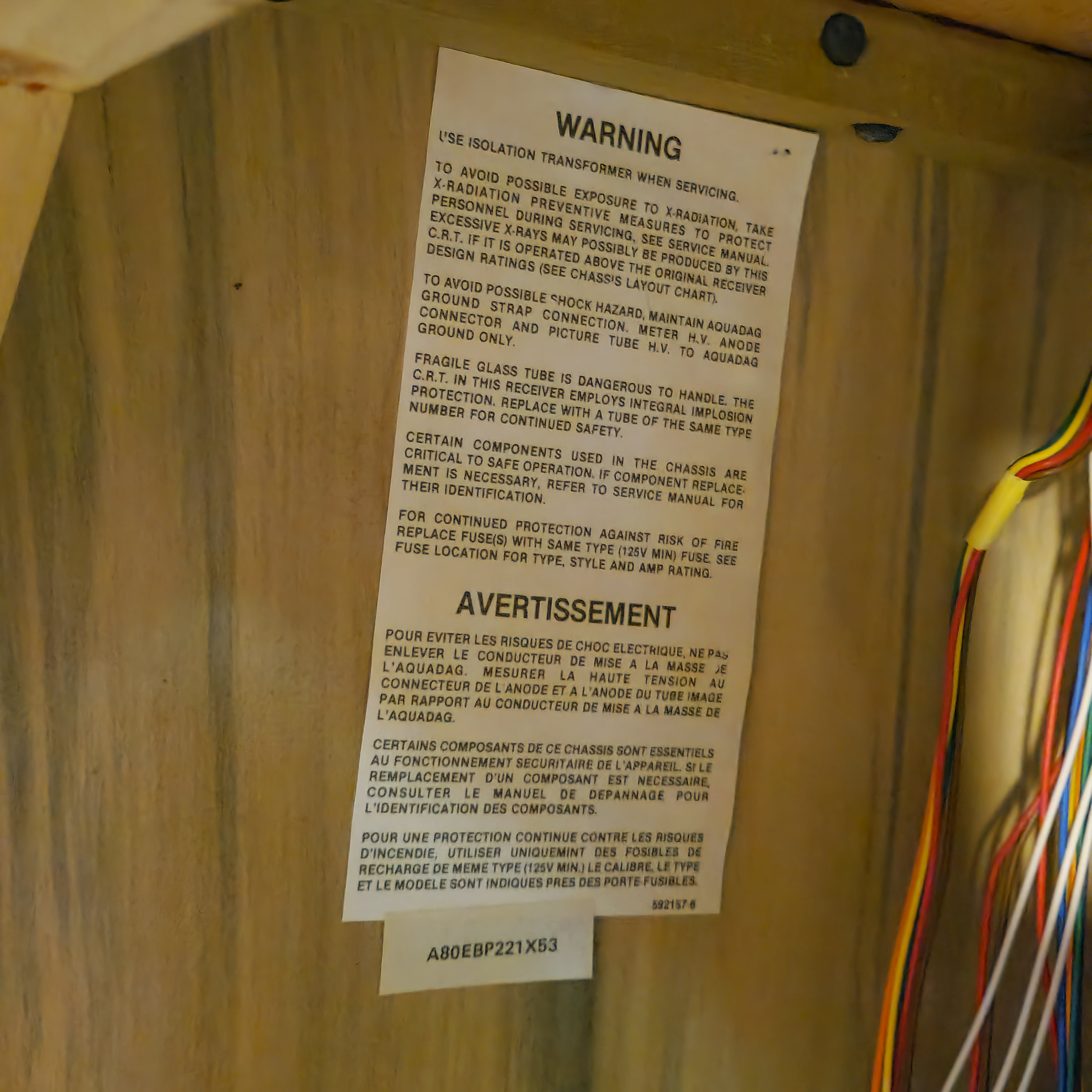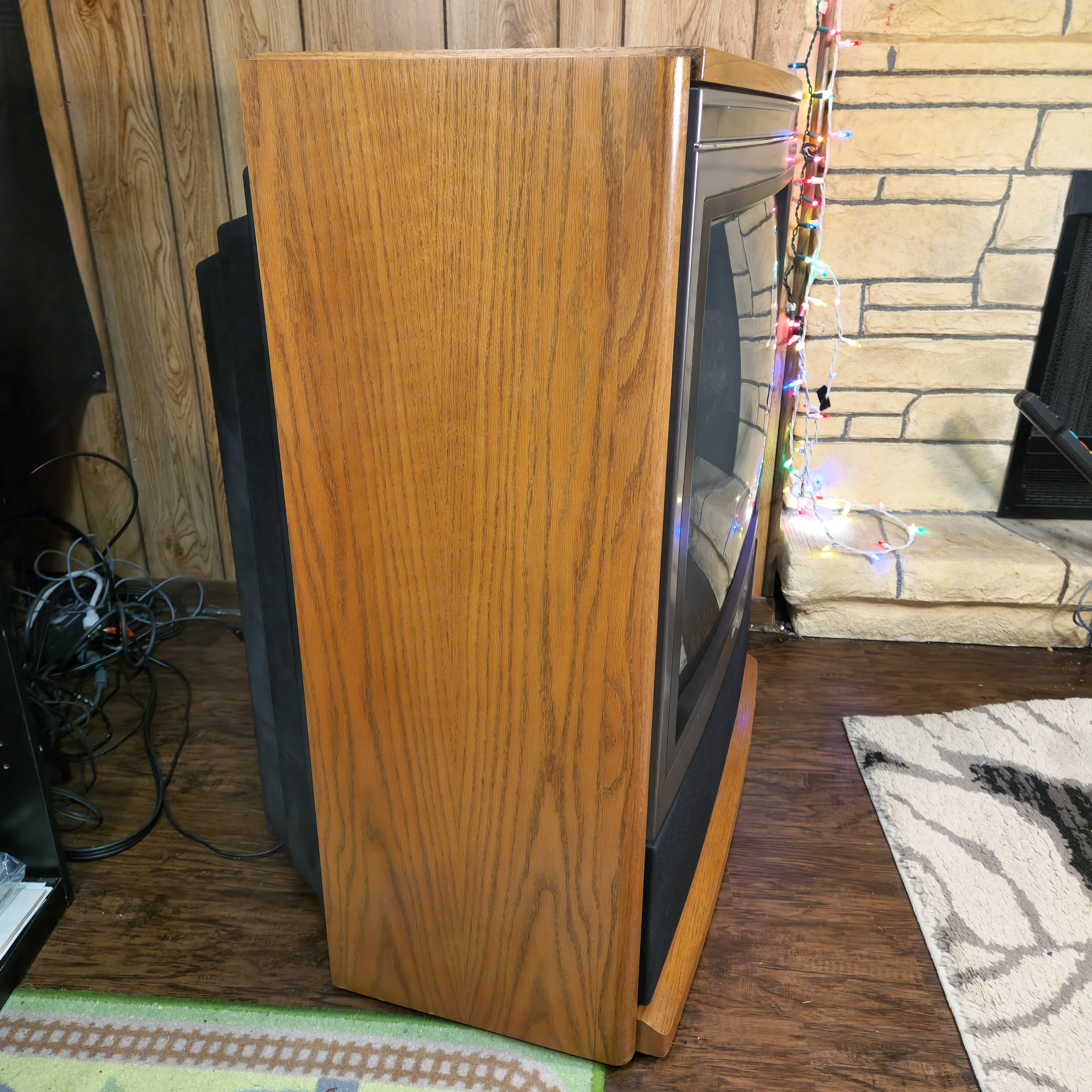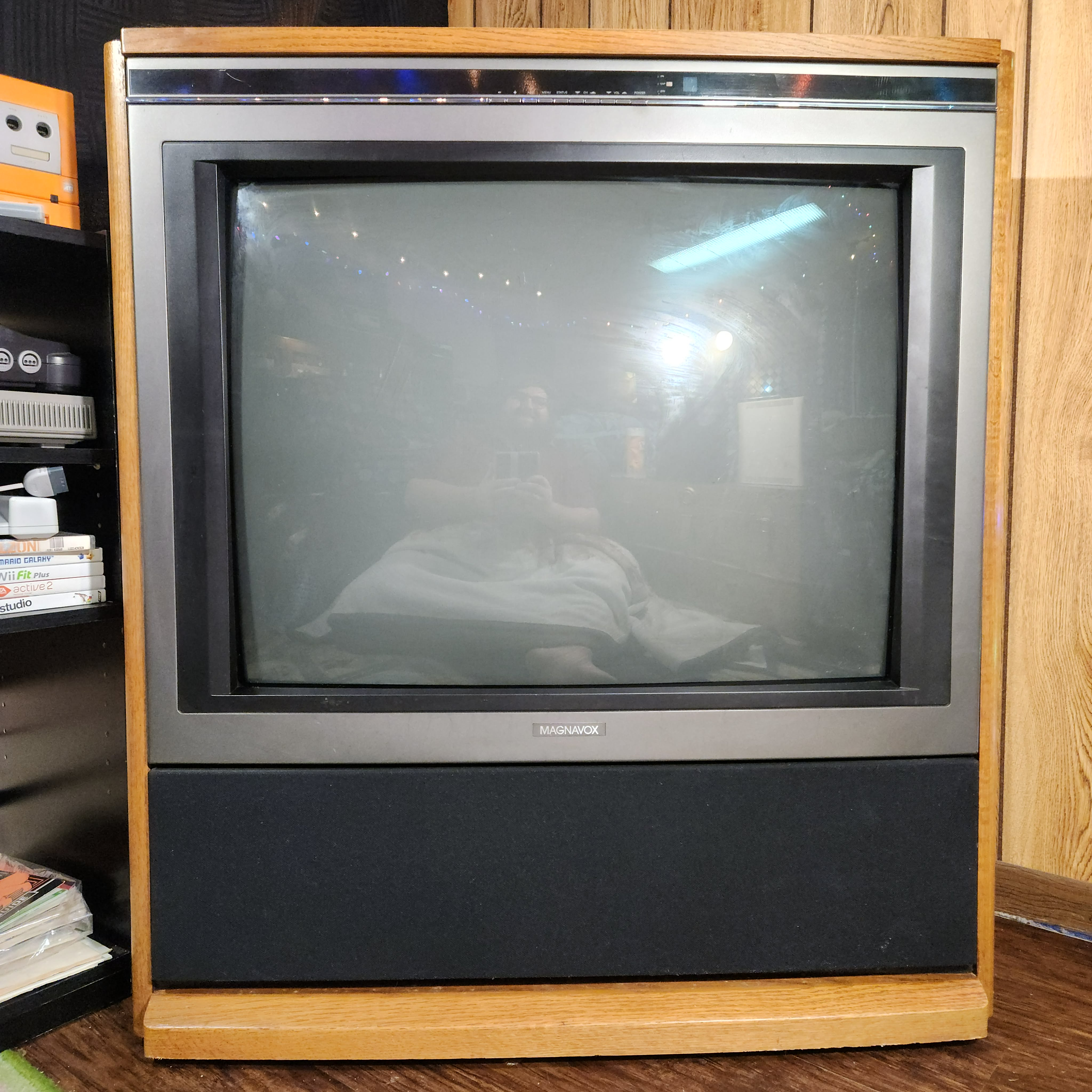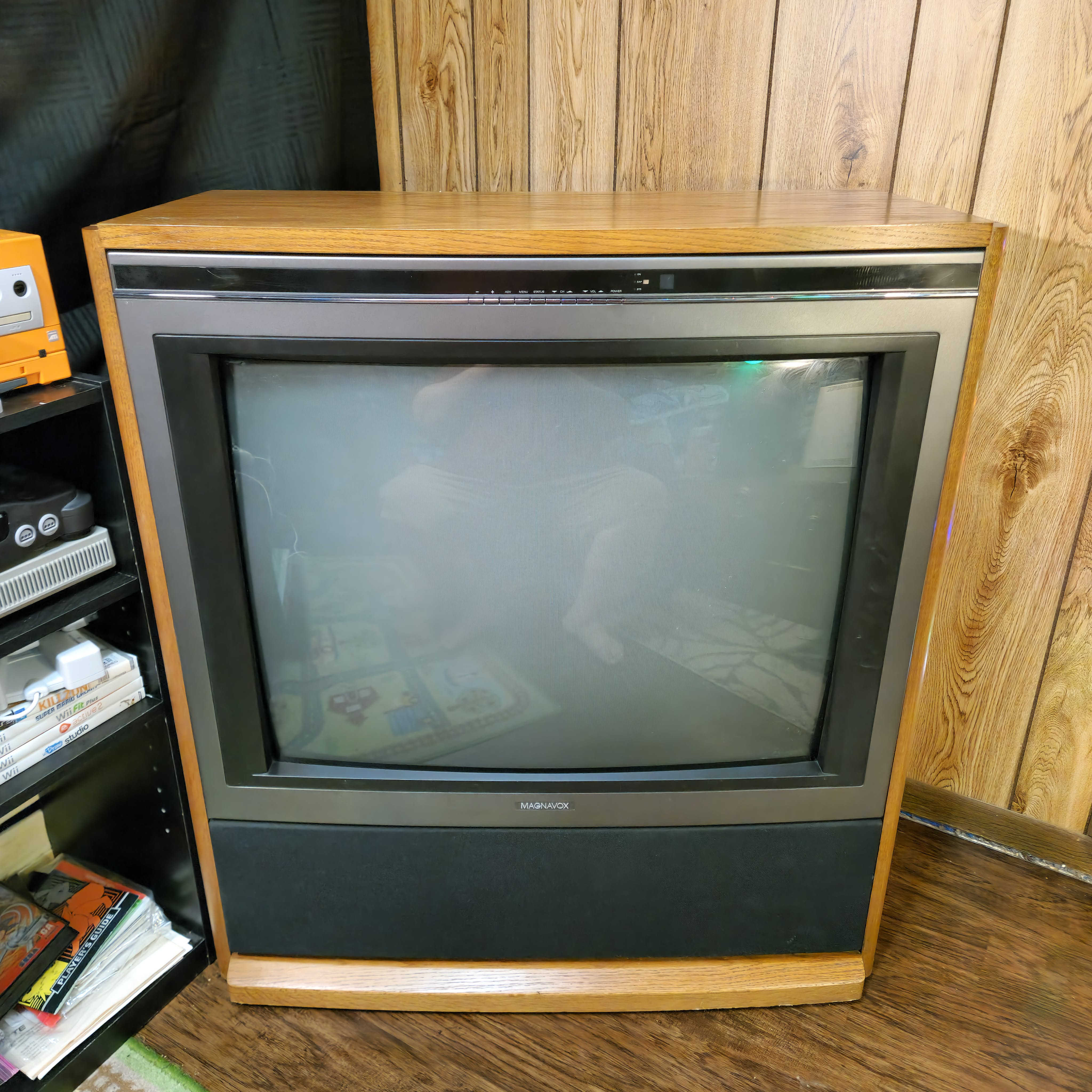 31" console TV by Magnavox, made by Philips in 1991. Manufactured with components sourced from Mexico with the picture tube made in Germany in the USA. Has RF, composite, and s-video inputs with 25W stereo surround sound.