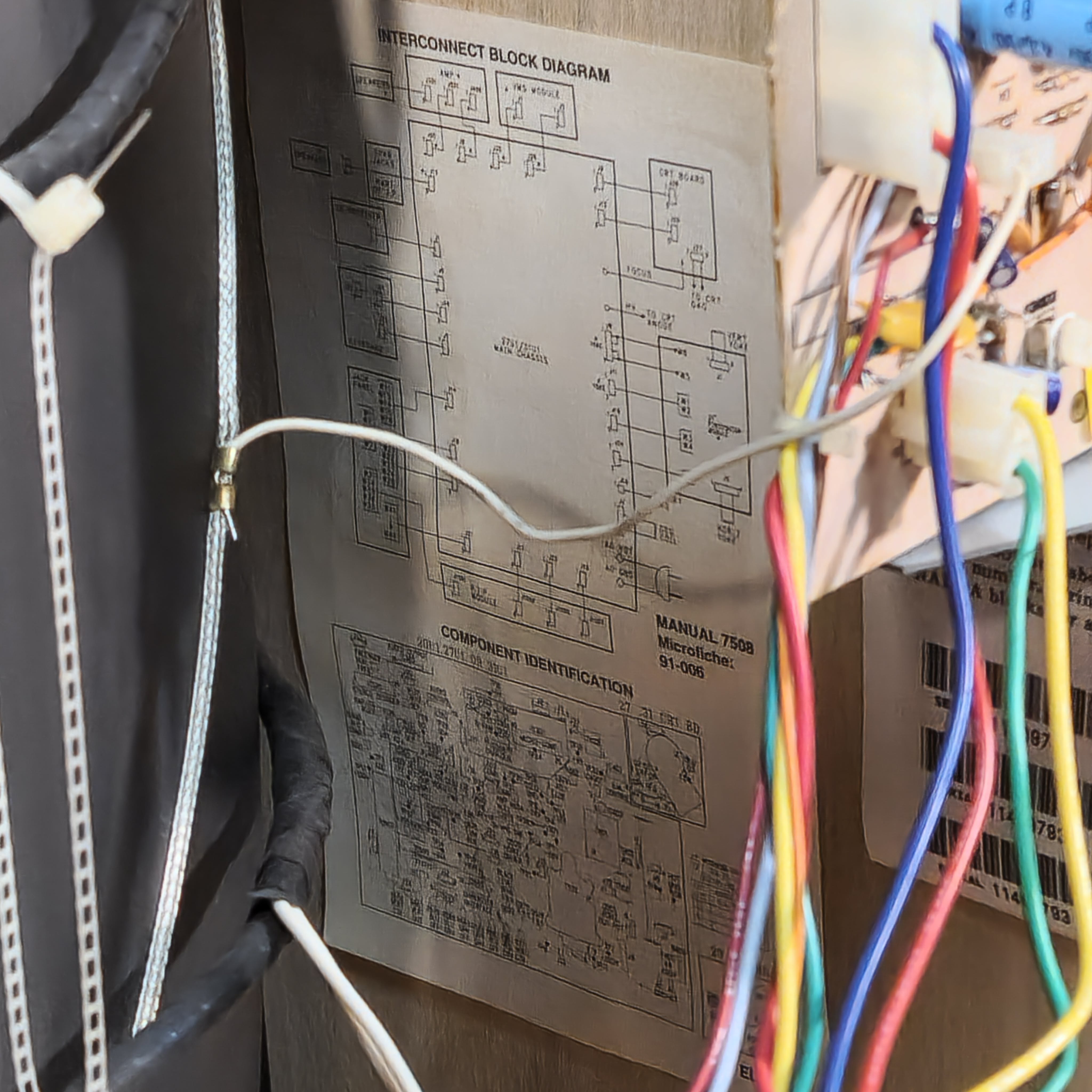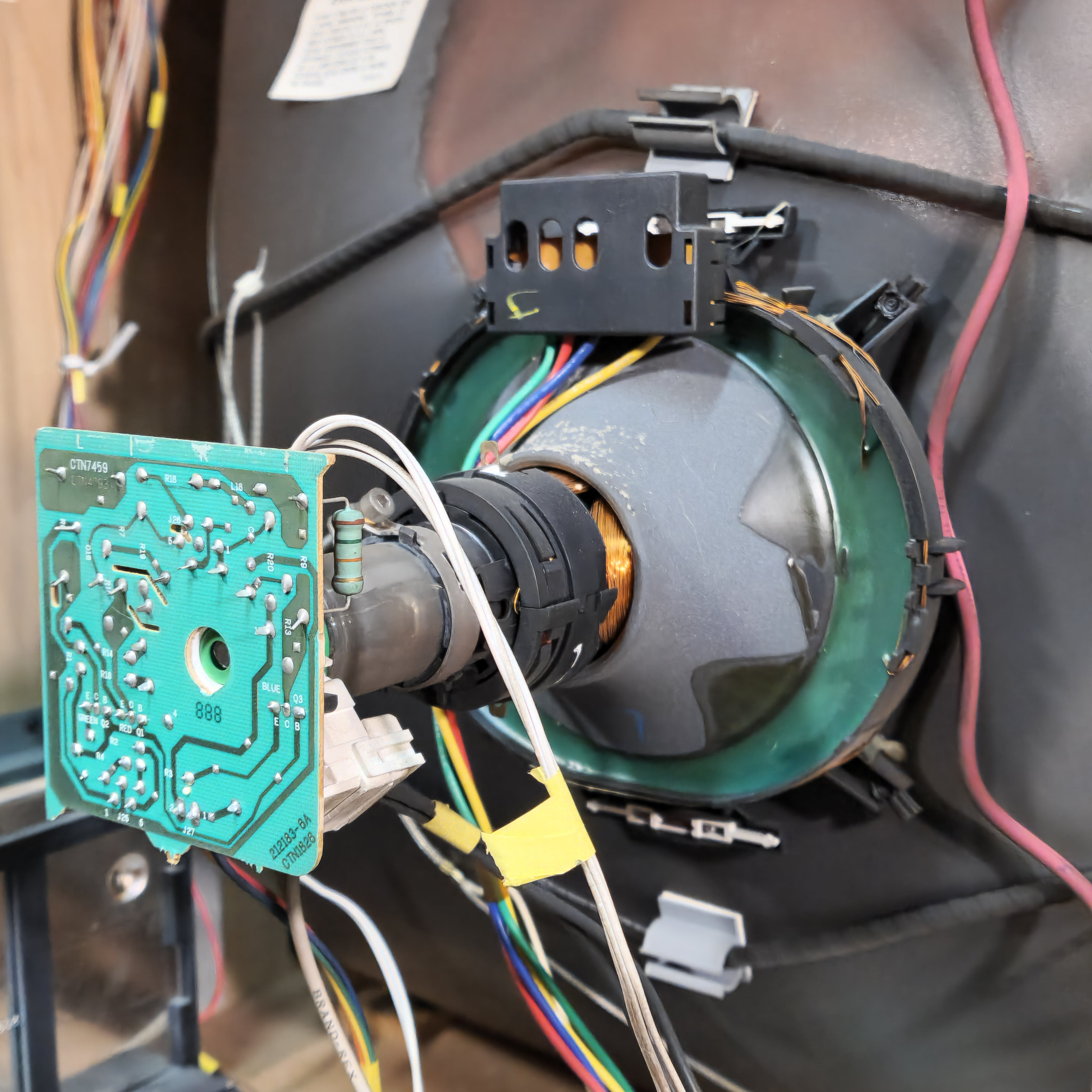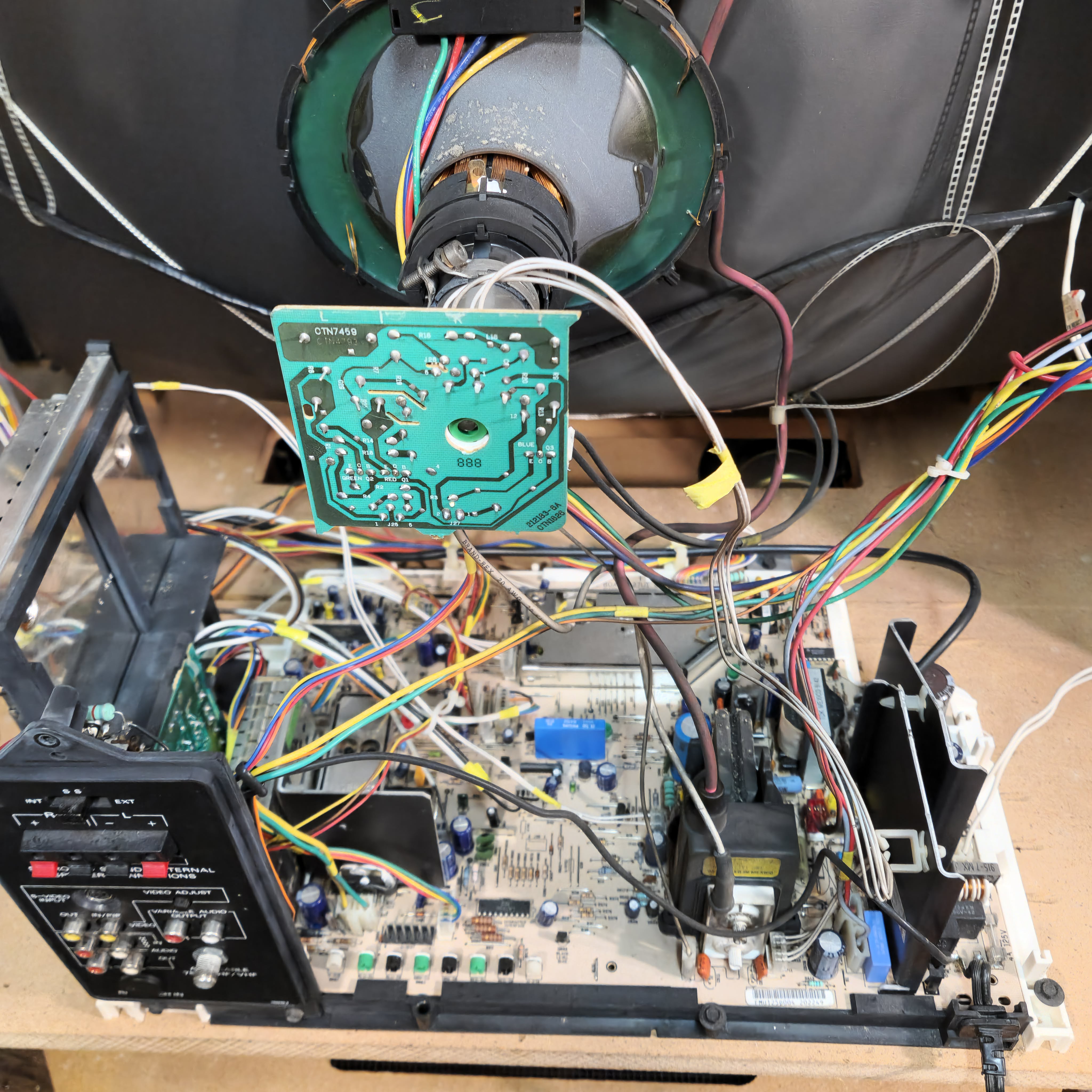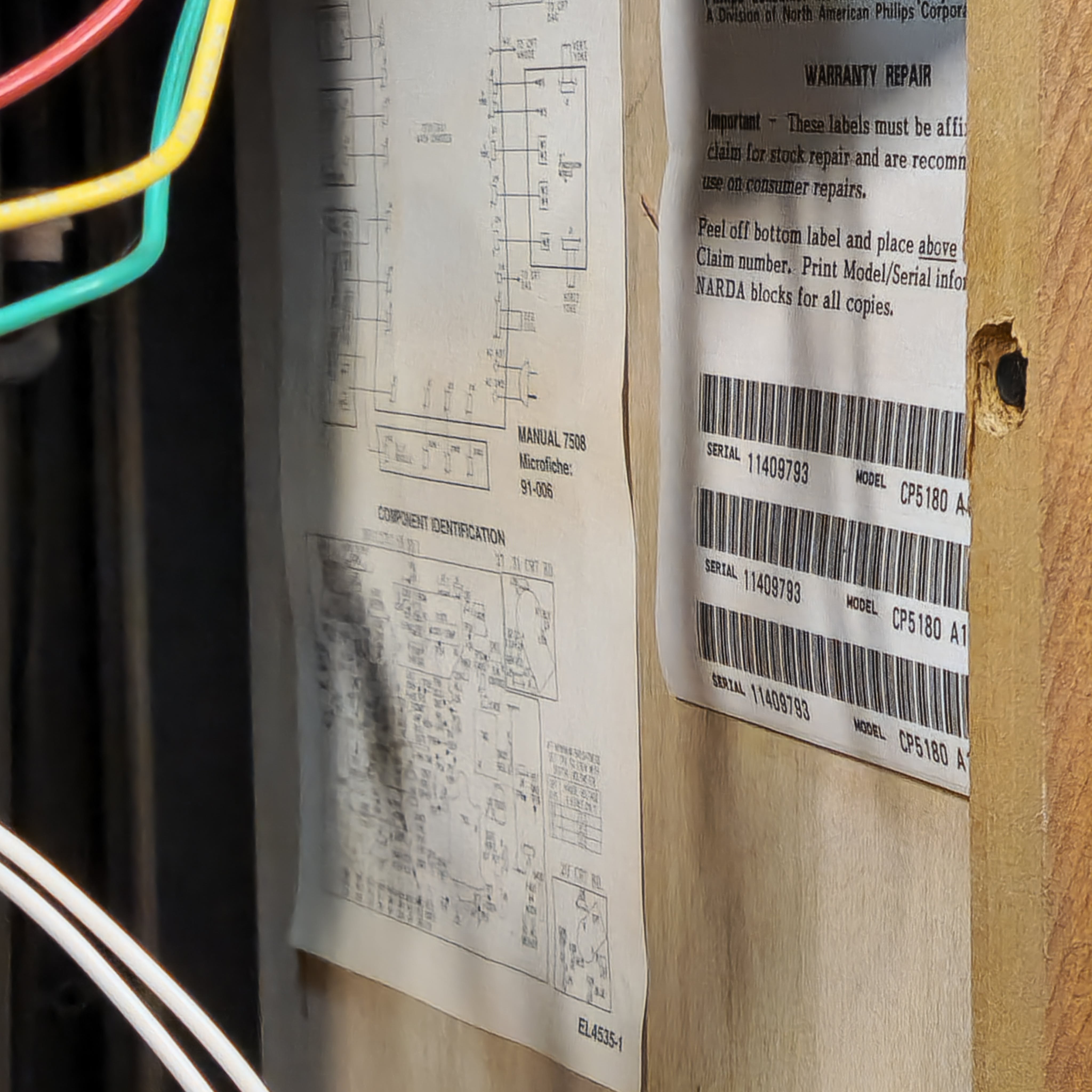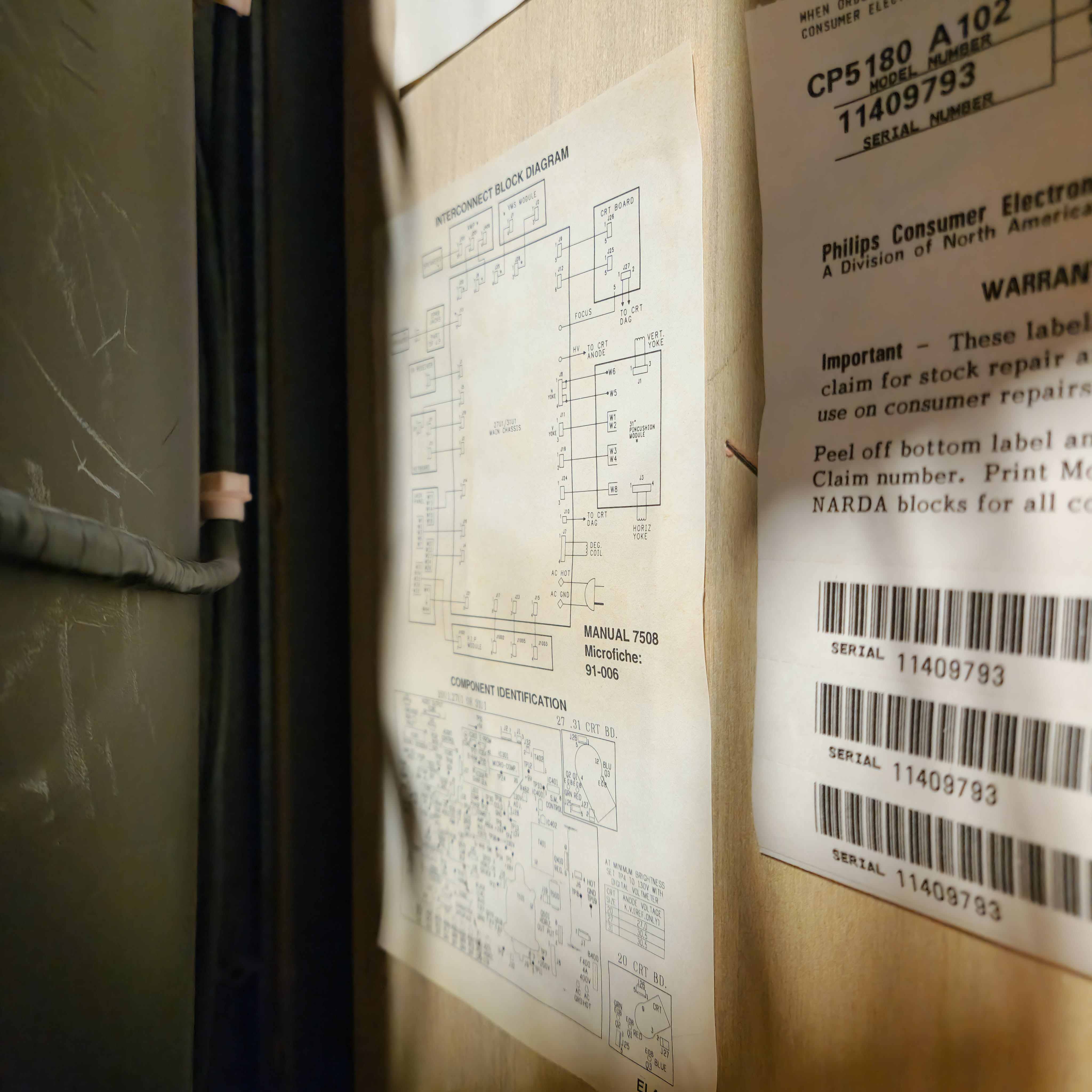 31" console TV by Magnavox, made by Philips in 1991. Manufactured with components sourced from Mexico with the picture tube made in Germany in the USA. Has RF, composite, and s-video inputs with 25W stereo surround sound.