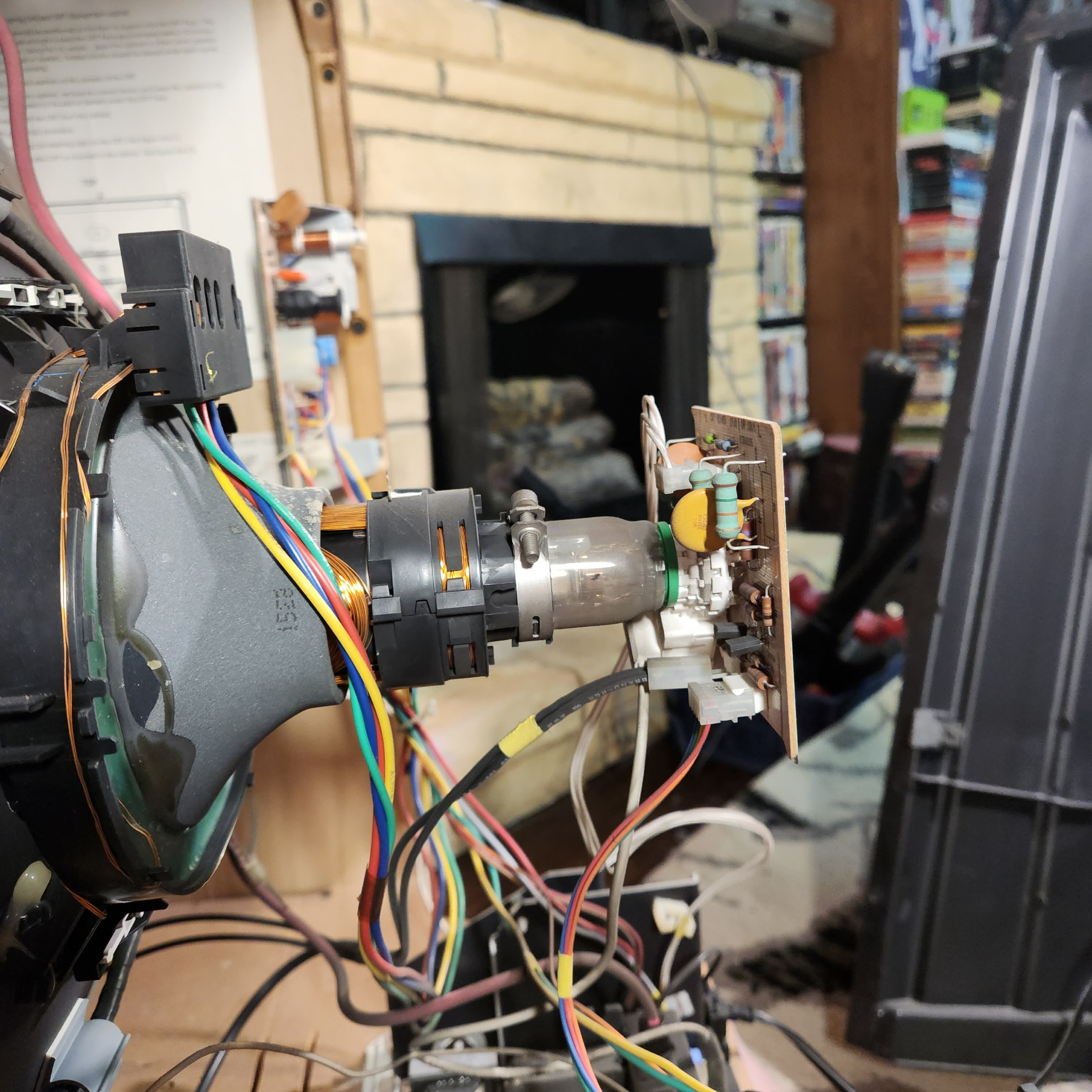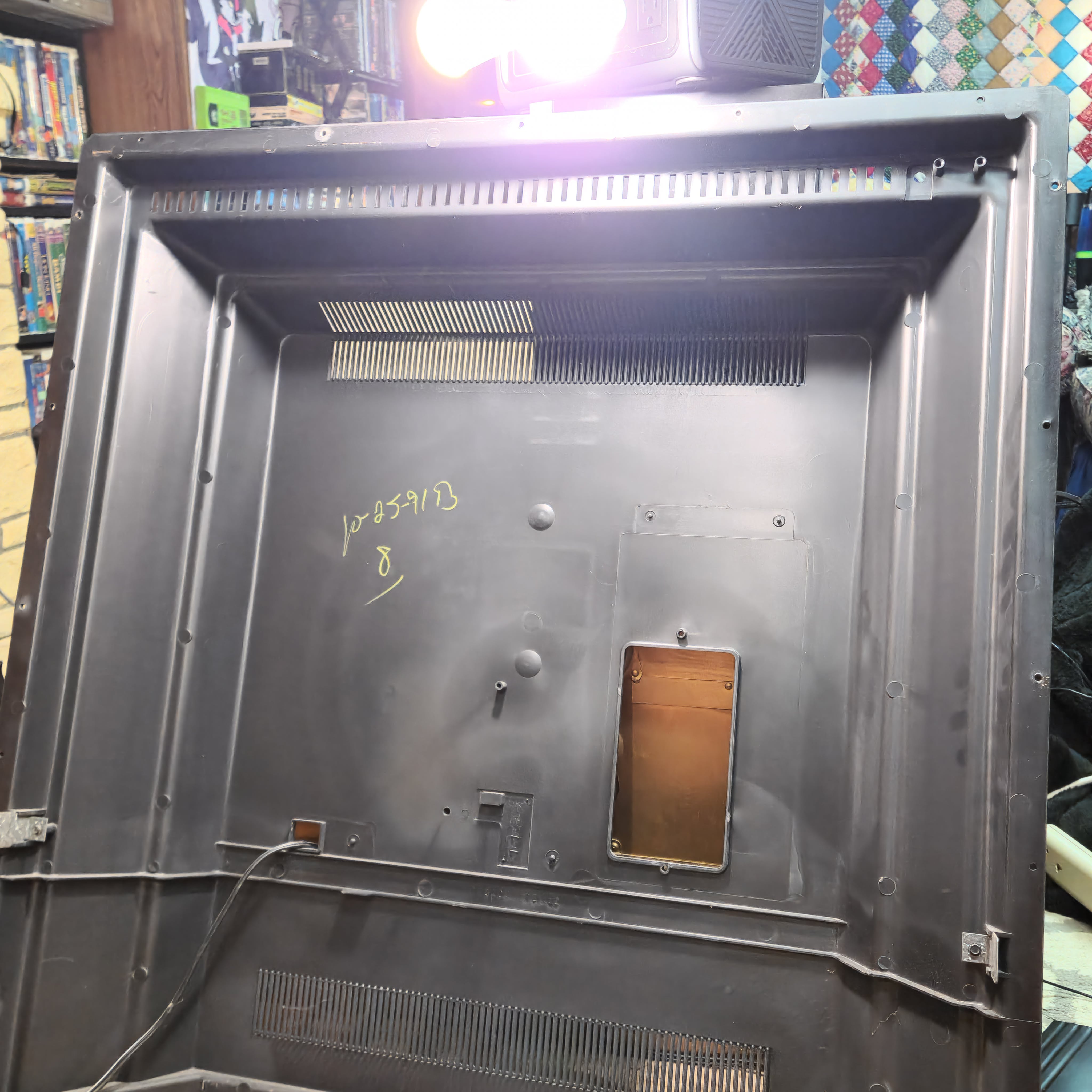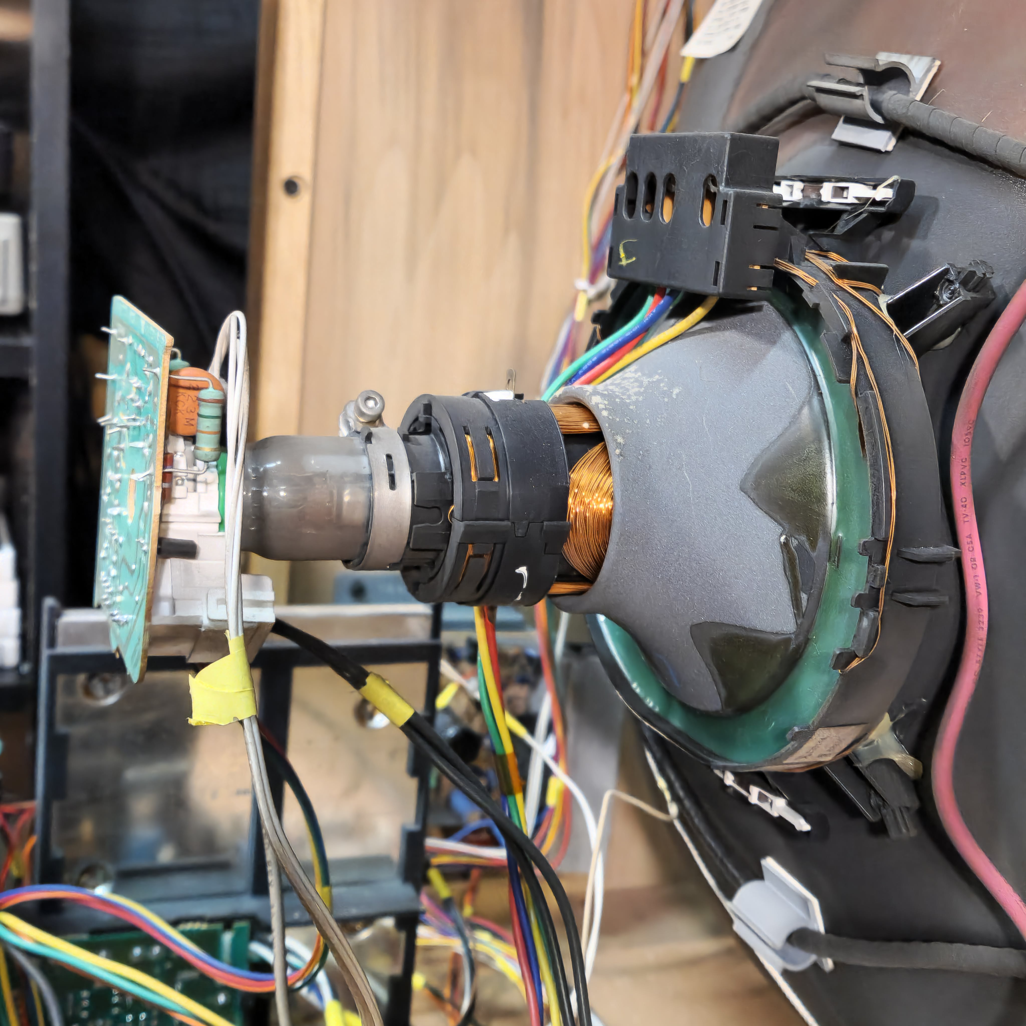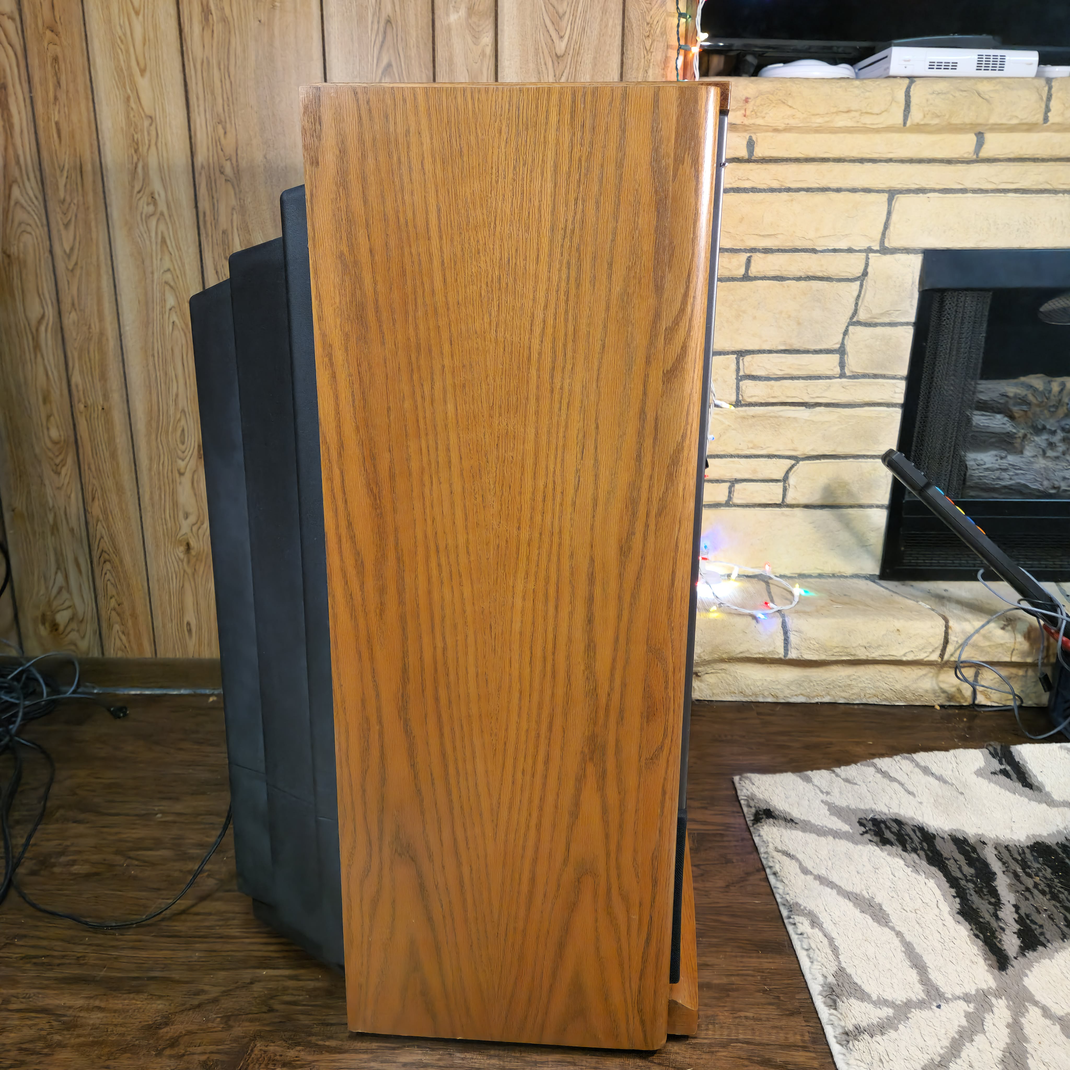 31" console TV by Magnavox, made by Philips in 1991. Manufactured with components sourced from Mexico with the picture tube made in Germany in the USA. Has RF, composite, and s-video inputs with 25W stereo surround sound.