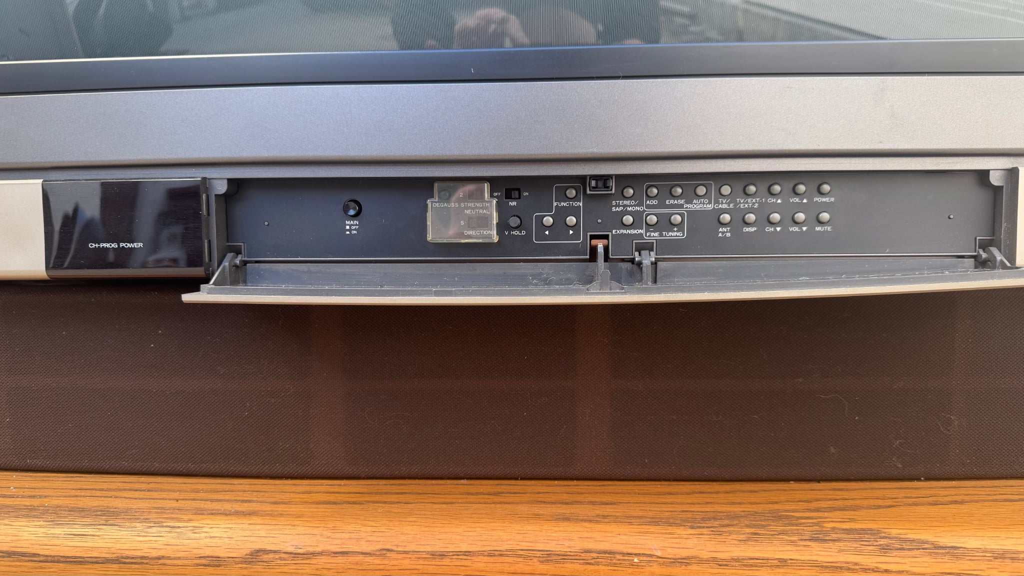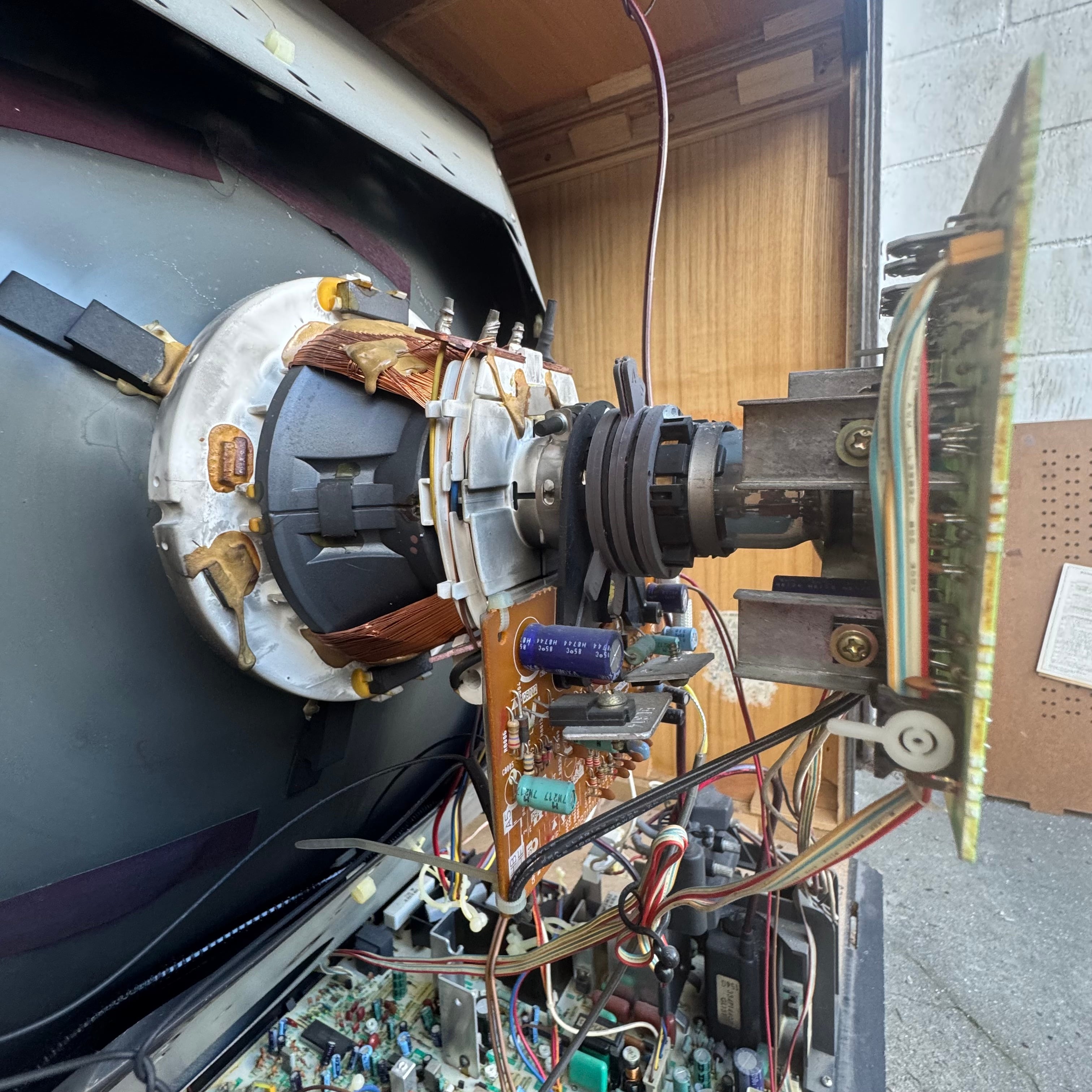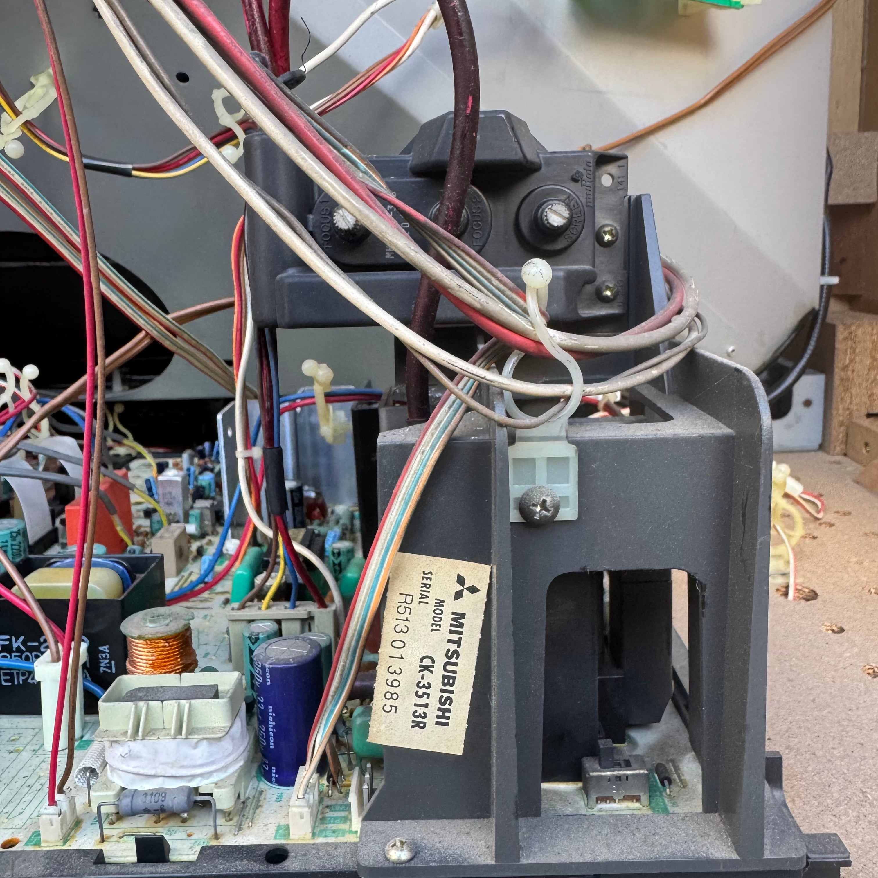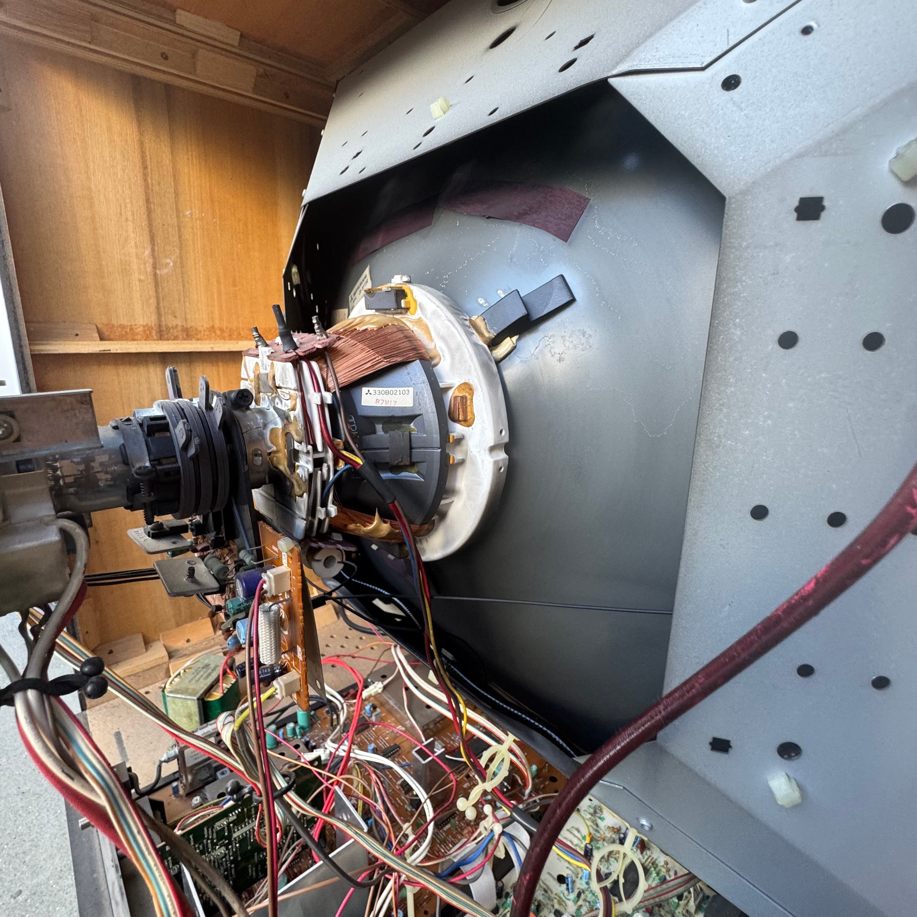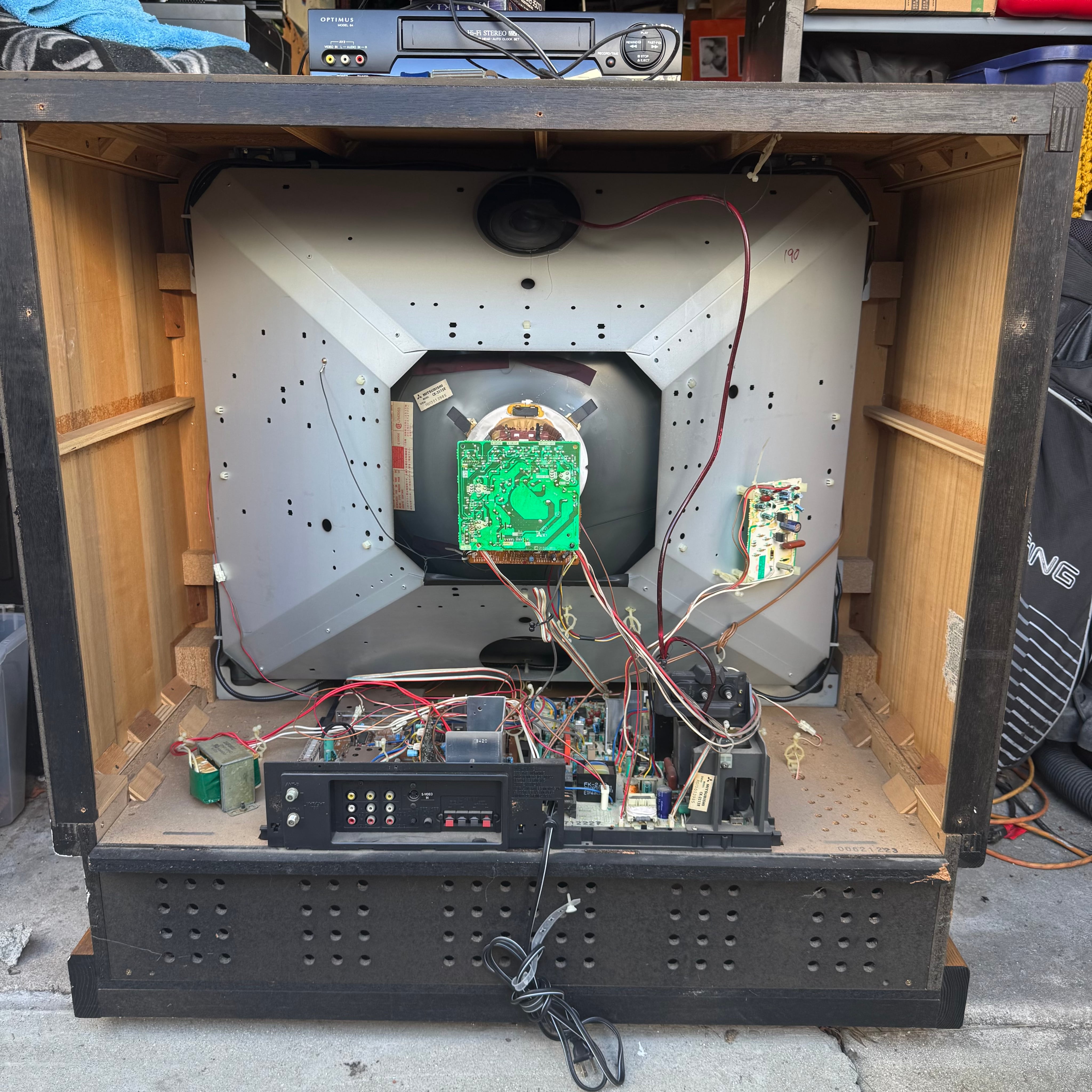 High-end 35" console TV by Mitsubishi, originally manufactured in Japan in 1987. Has RF, composite, and s-video inputs with stereo sound. This model by Mitsubishi is one of their very first with s-video.
