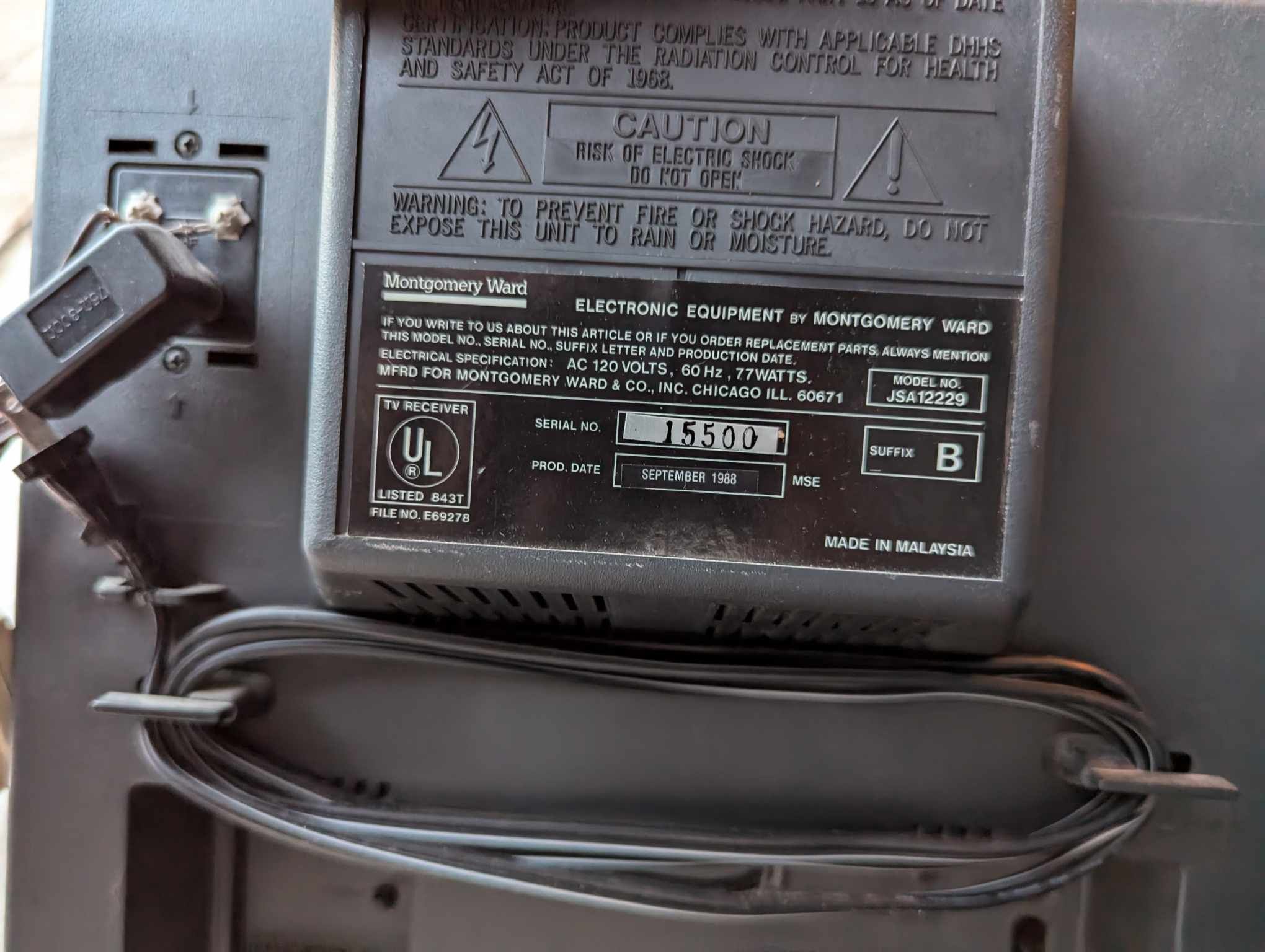 13" color TV by Montgomery Ward. Originally manufactured by Orion in Taiwan.