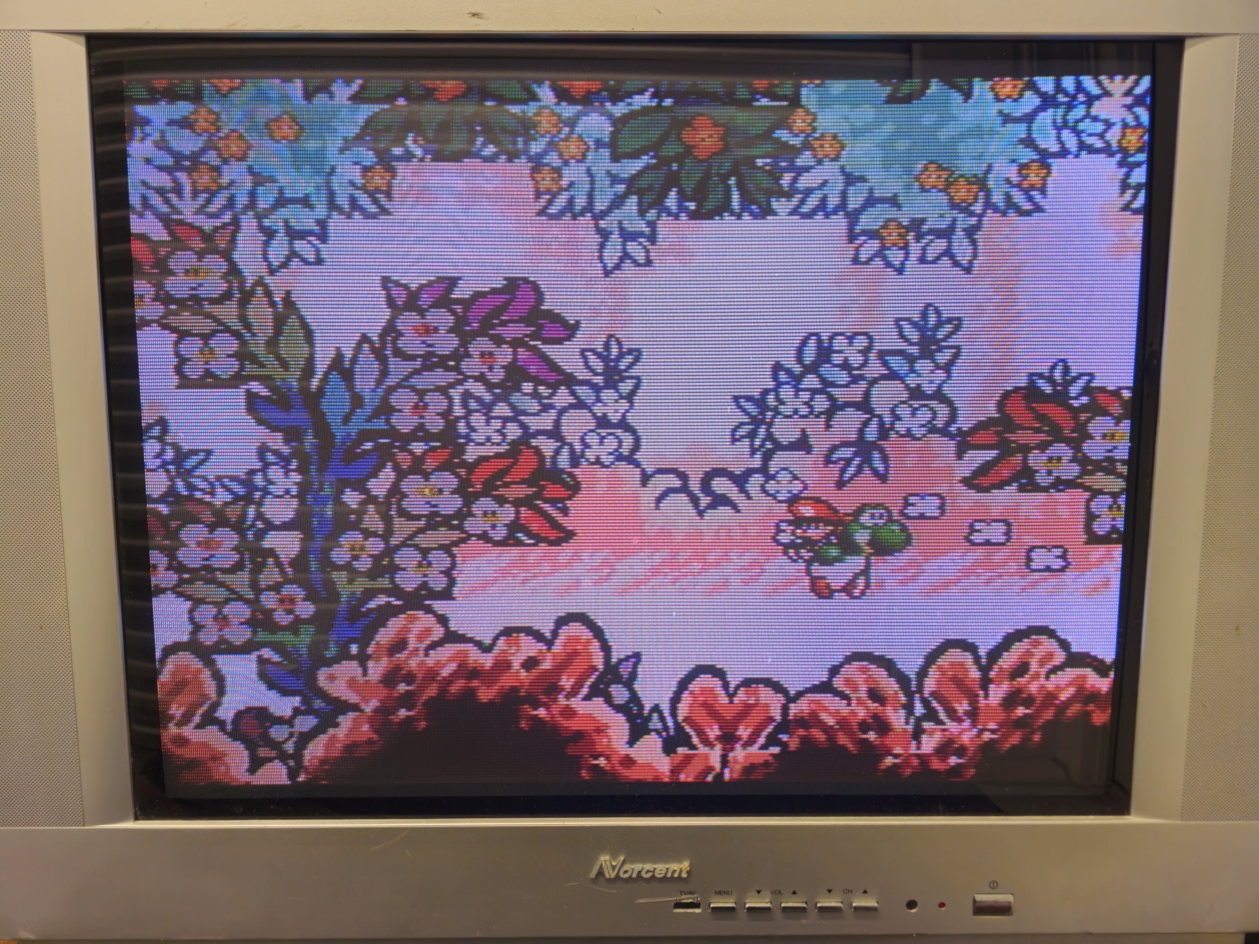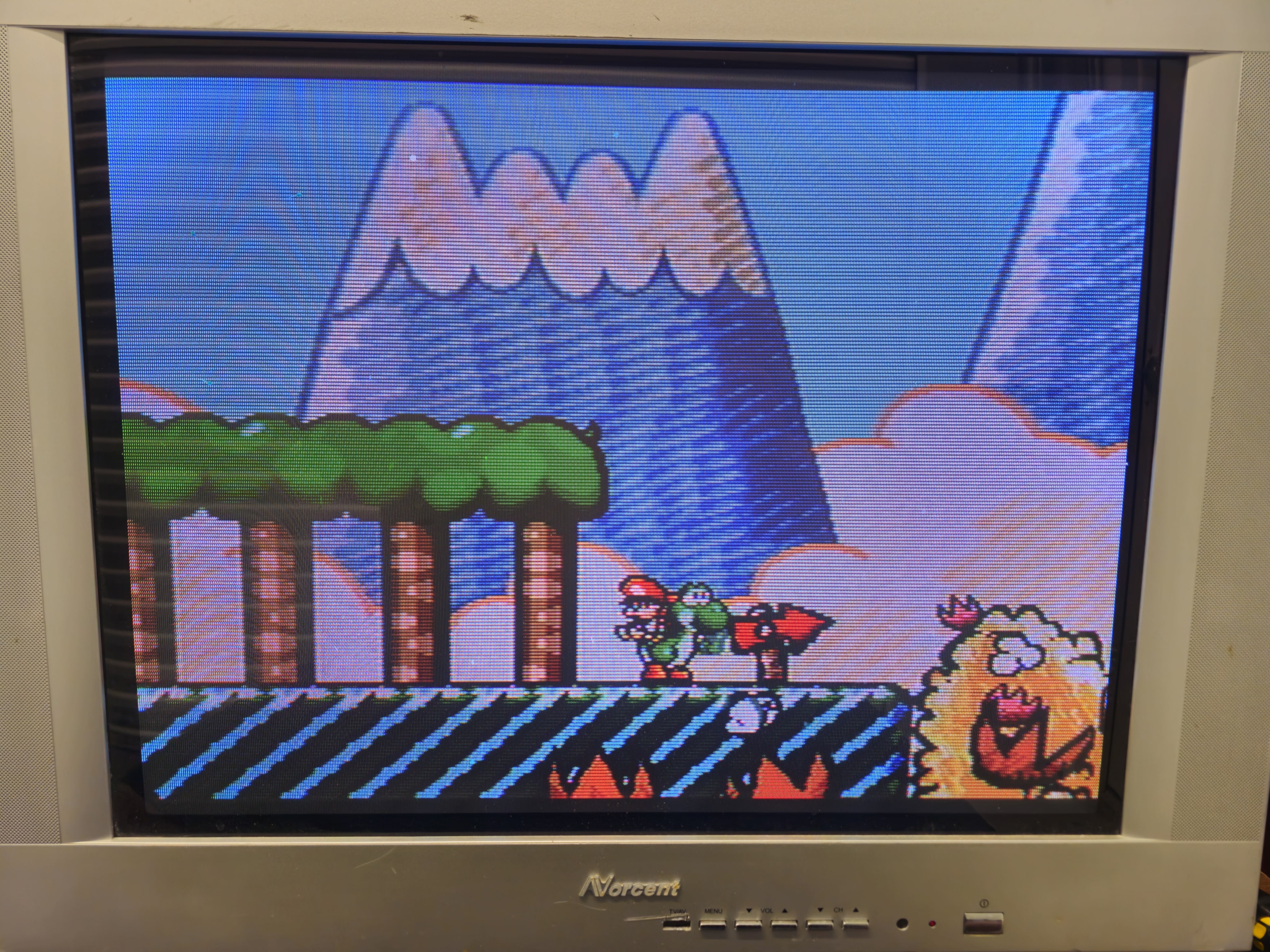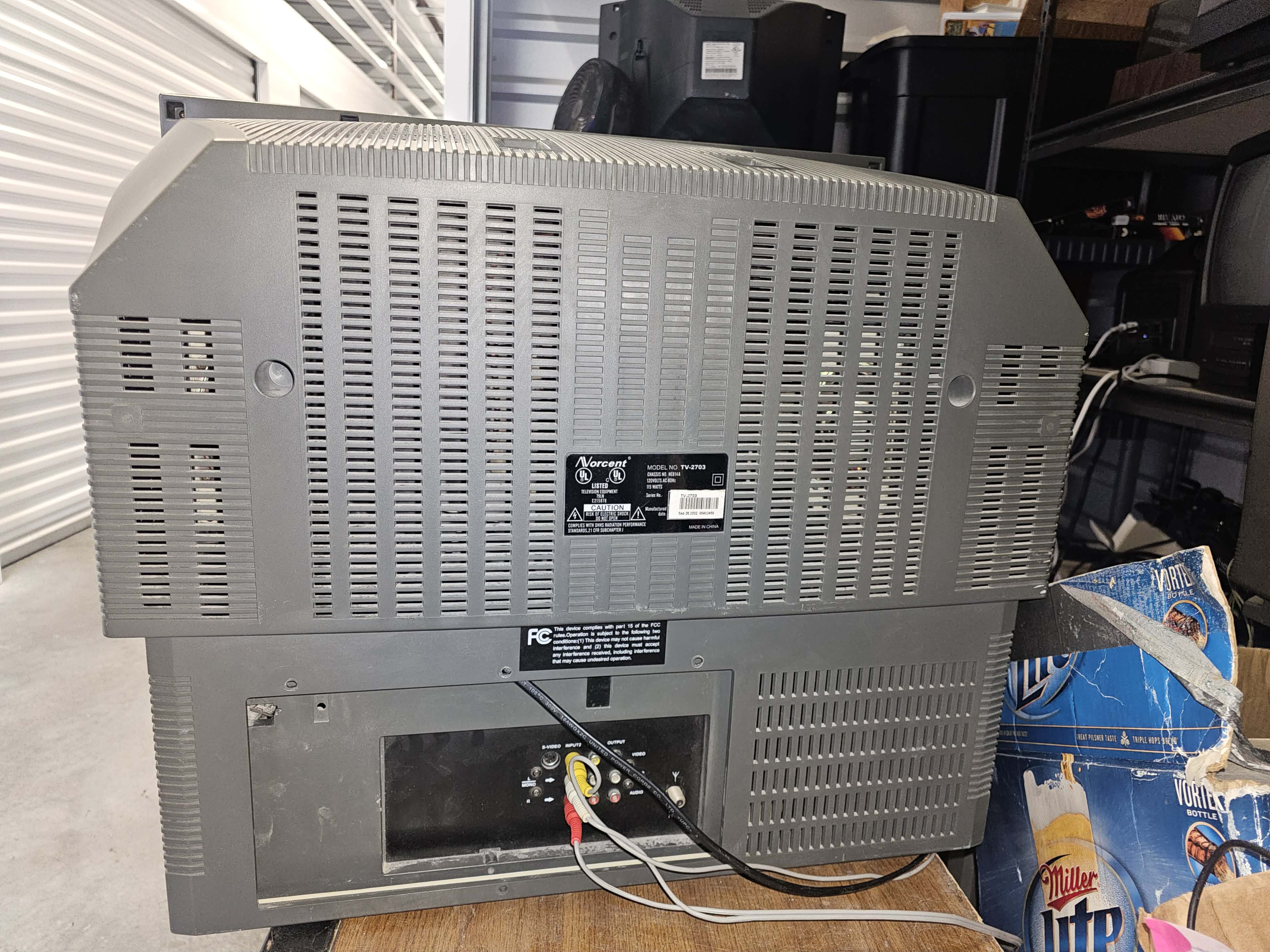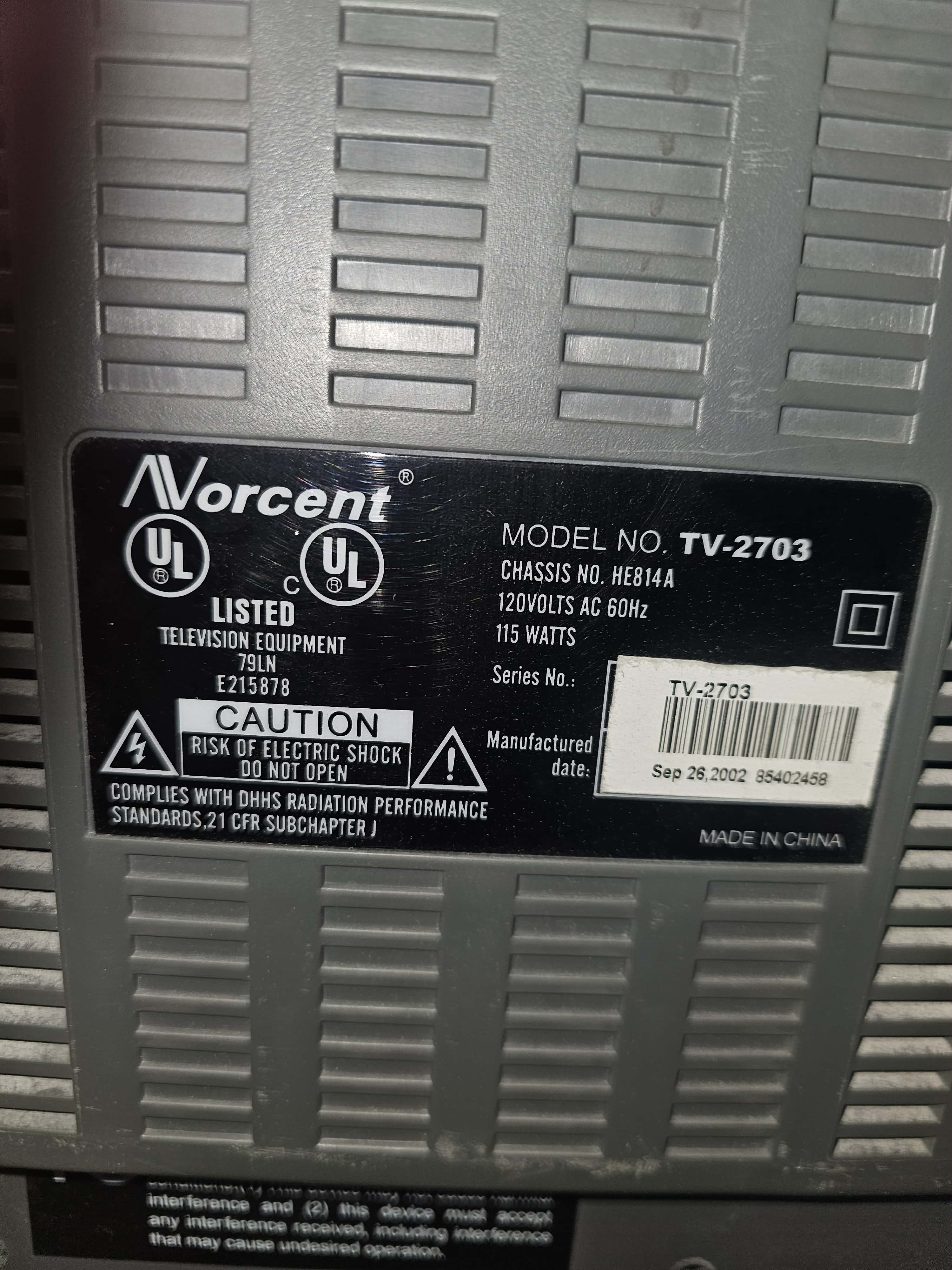 27" flatscreen CRT by Norcent, launched in 2002. Has RF, composite, and -svideo inputs with stereo sound. Originally manufactured by Hisense in China.