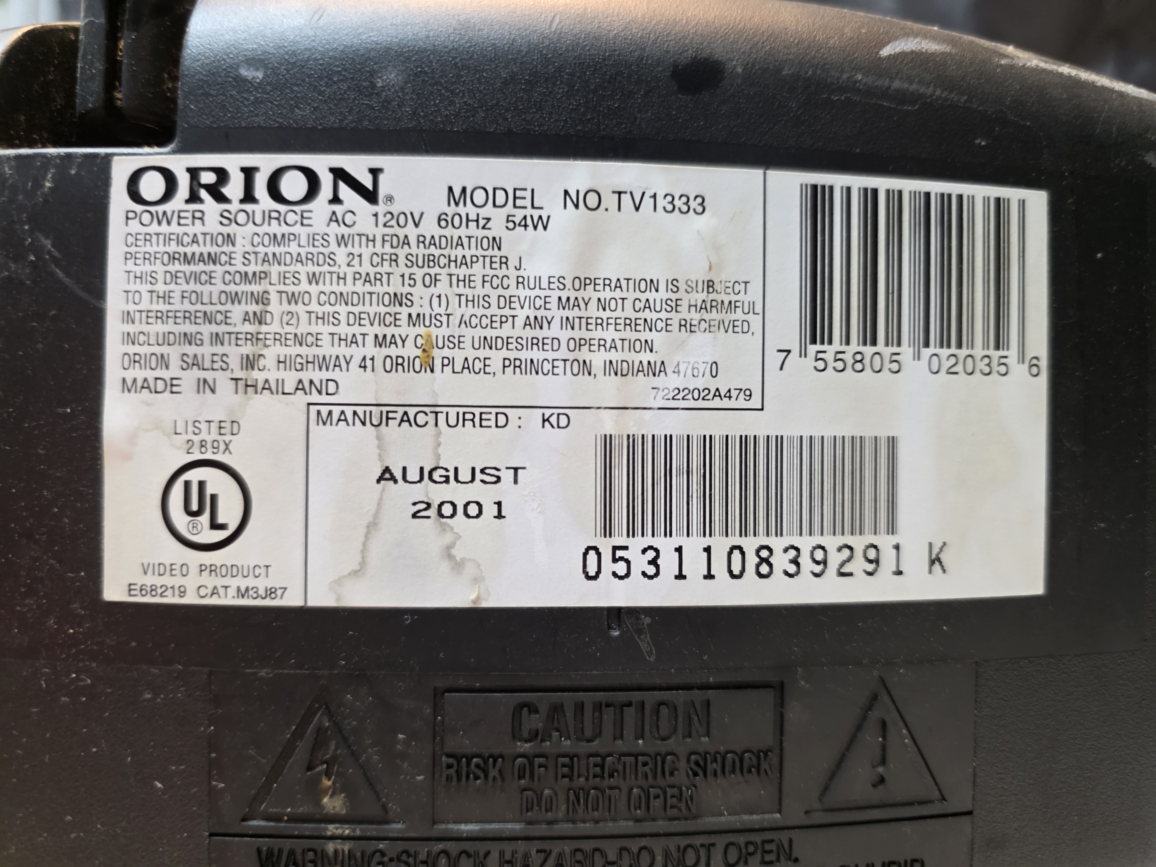 Basic, low end TV from Orion. It has one composite input and a single 1 amp speaker that's mounted on the bottom of the TV. This and similar TVs were sold under a number of different brands, most notably Toshiba.