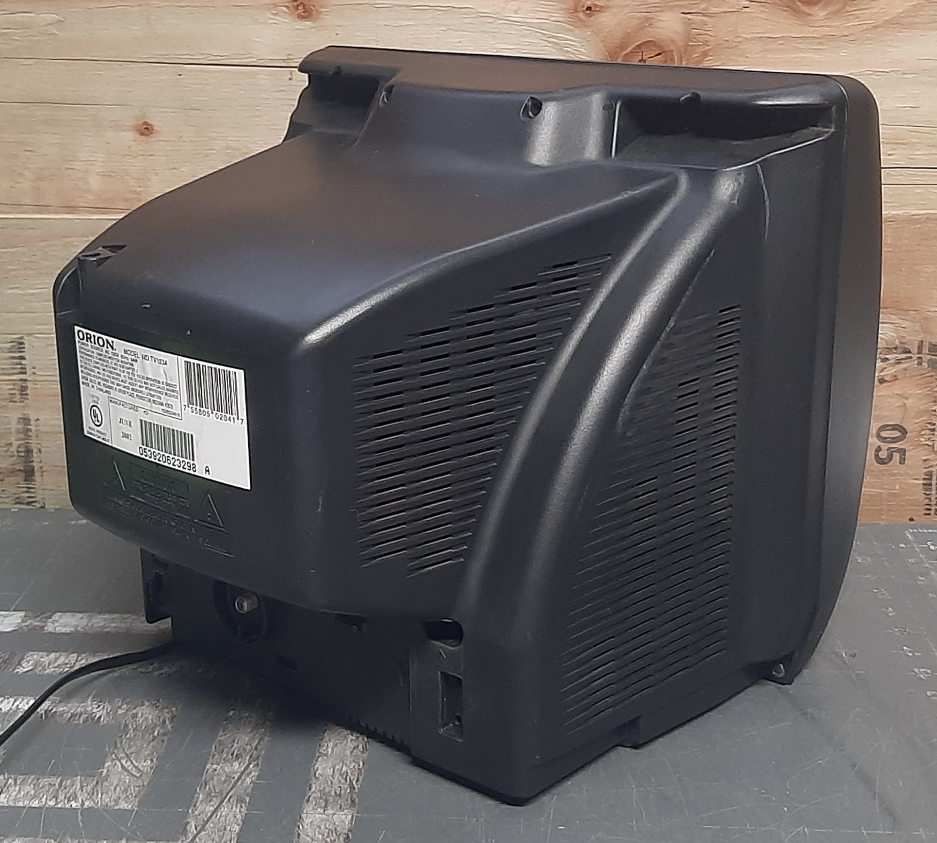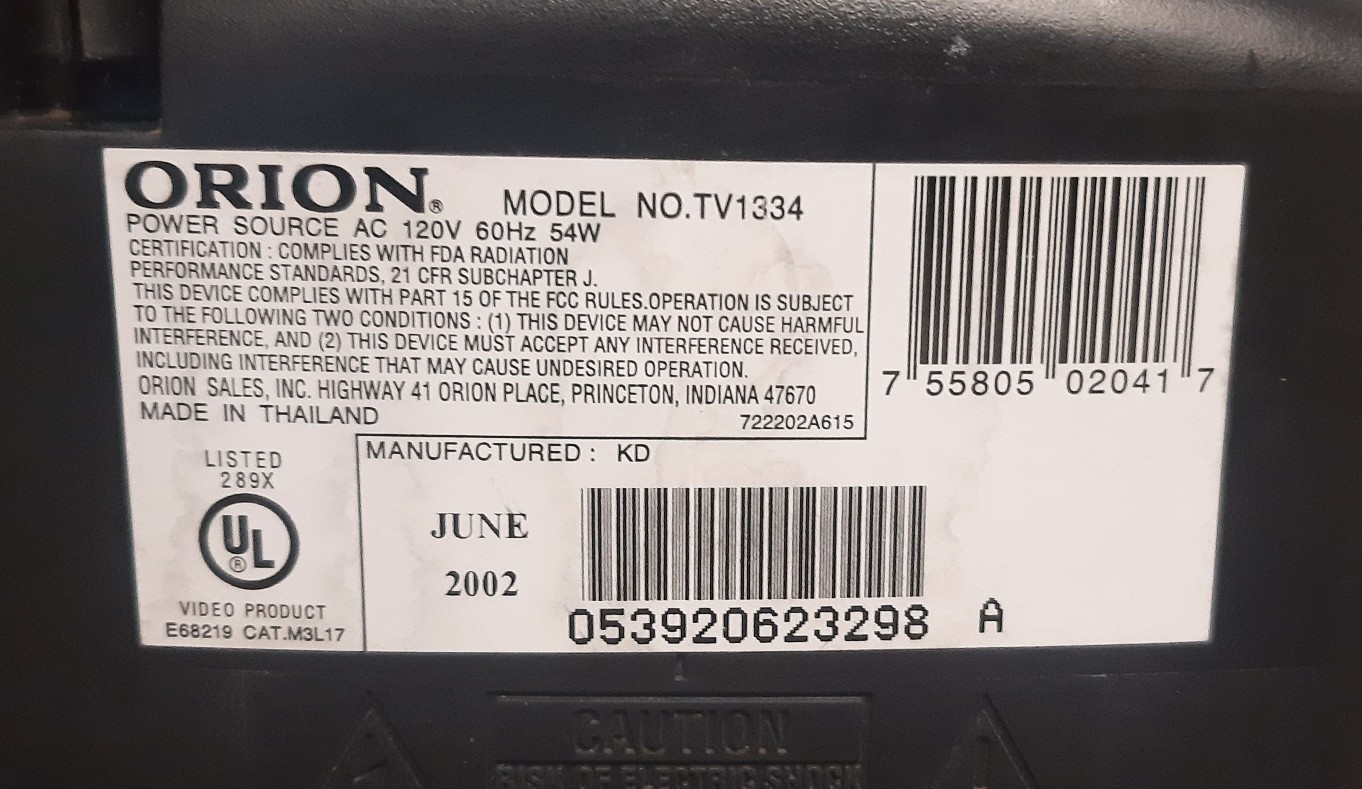 Basic consumer TV from Orion. It has one composite input and a single 1 amp speaker that's mounted on the bottom of the TV. This and similar TVs were sold under a number of different brands, most notably Toshiba. It appears to be a clone of the Toshiba 13A22.