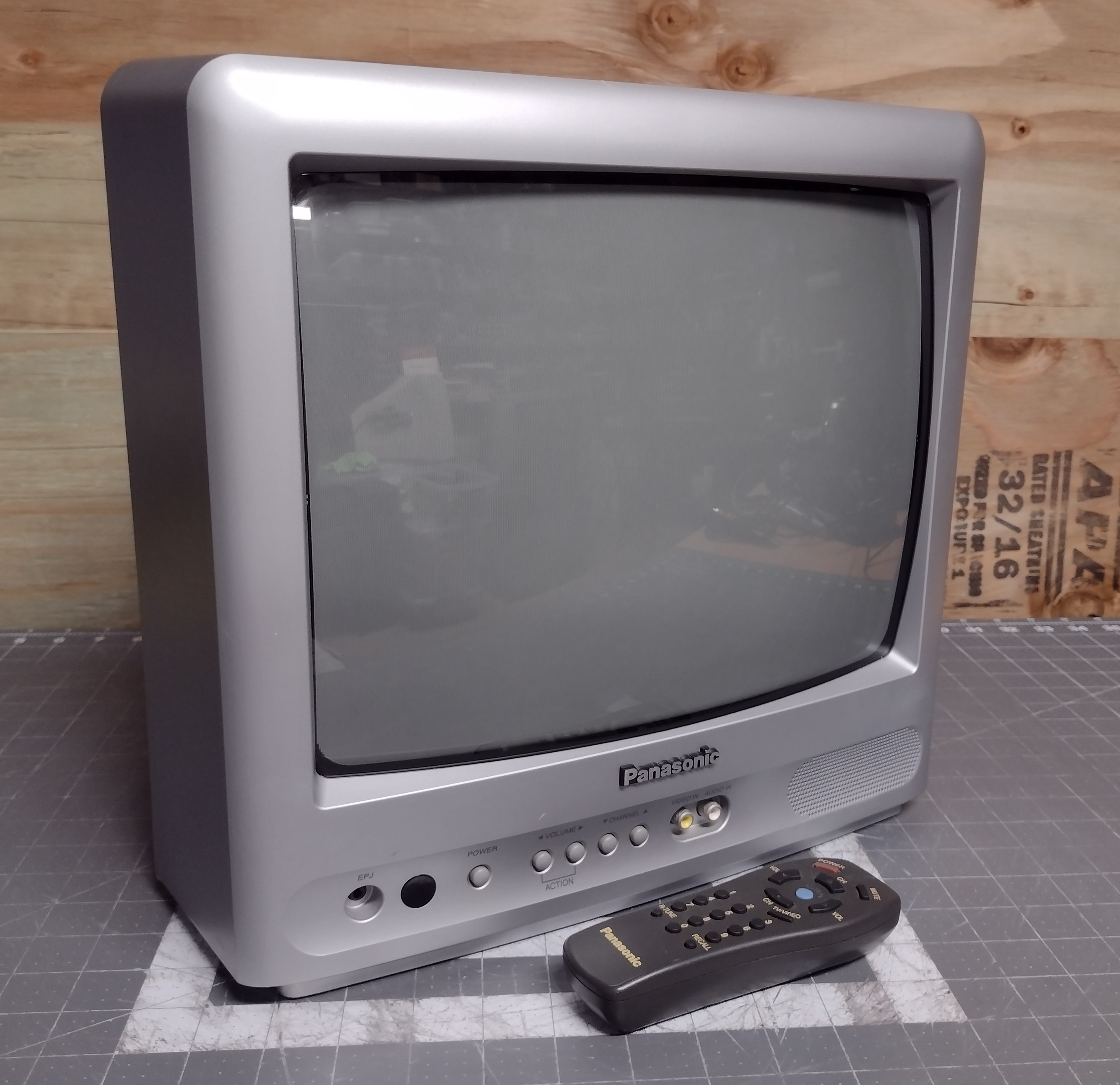 13" consumer TV, manufactured by Orion and sold by Panasonic. It has a single front mounted composite input and a mono speaker. Picture quality is quite good, as the tube is finer pitch than some other Orion TVs of the same size. It can be modded for RGB input.