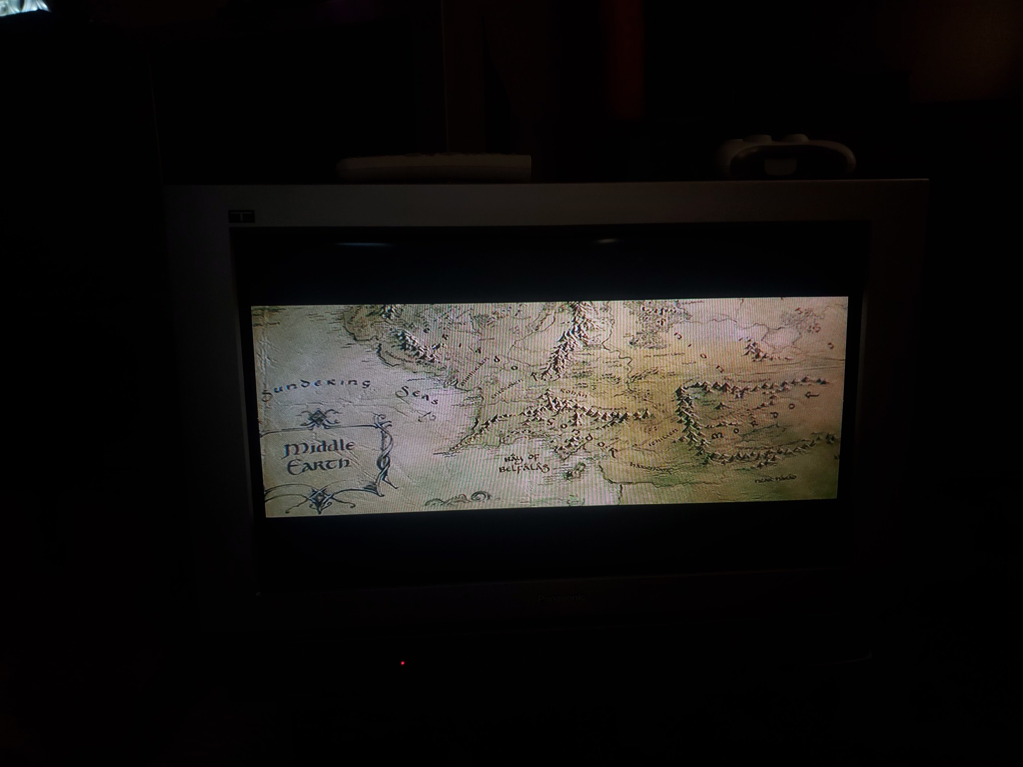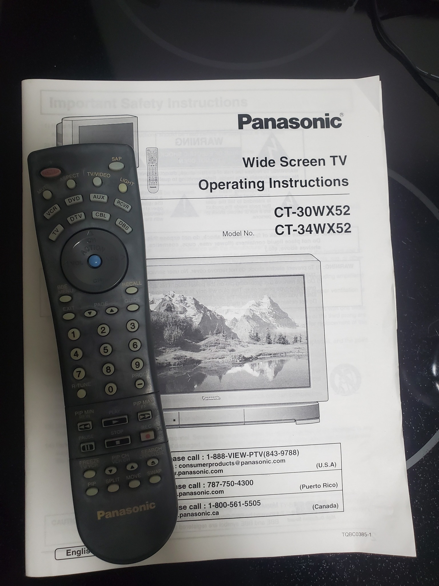 34" HD widescreen CRT by Panasonic, made in Mexico in 2002. Has RF, composite, s-video, and component inputs with stereo sound. 480p and 1080i signals are natively scanned without lag, and SD signals are linedoubled with reportedly very low latency.