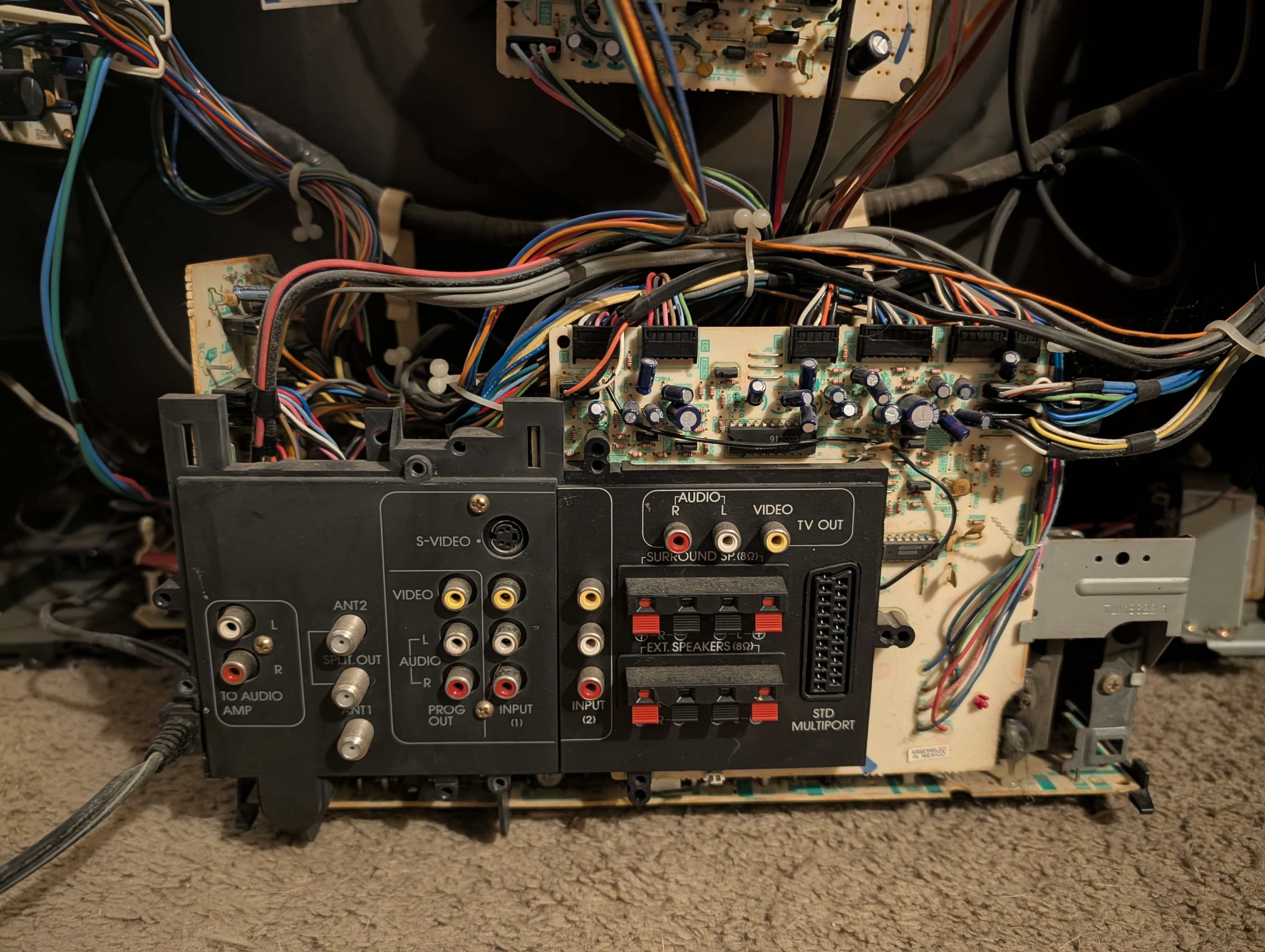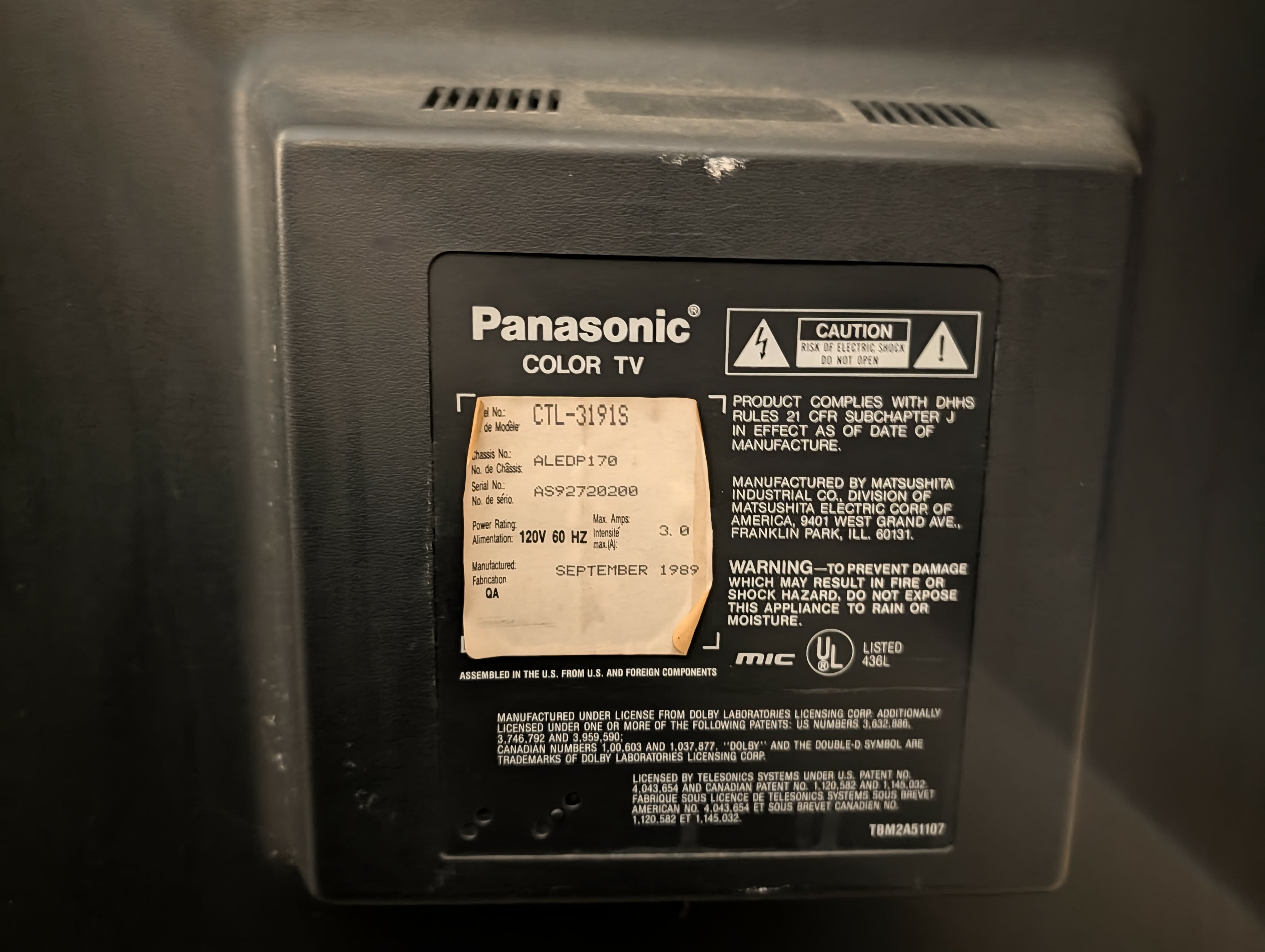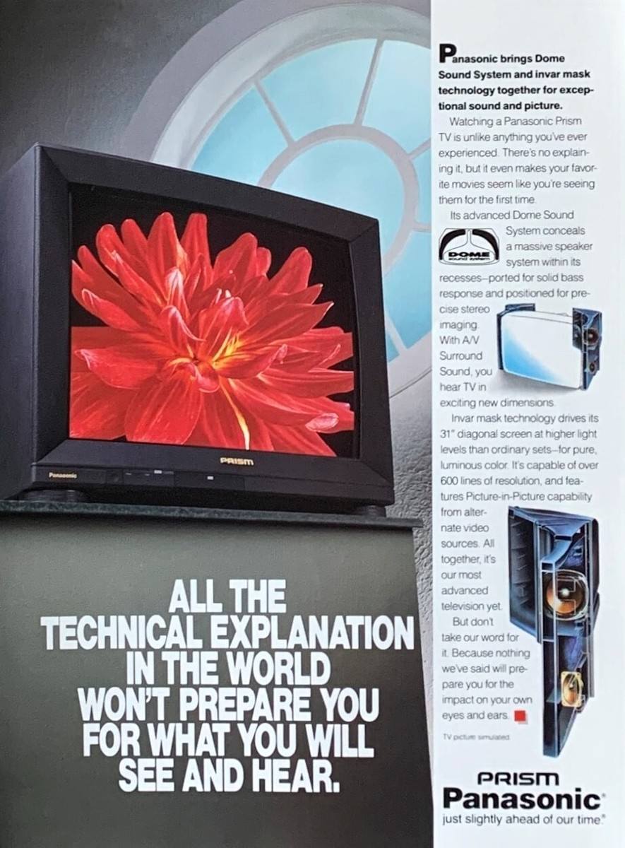 High-end 31" TV By Panasonic, under their premier Prism line. Has RF, composite, s-video and EIA Multiport inputs with bassy stereo DOME speakers. Originally manufactured in Mexico and launched in 1988.