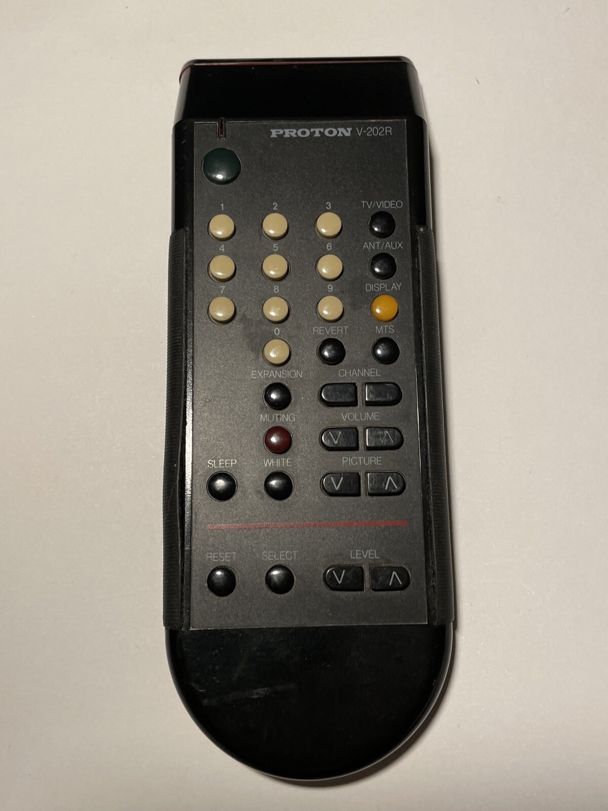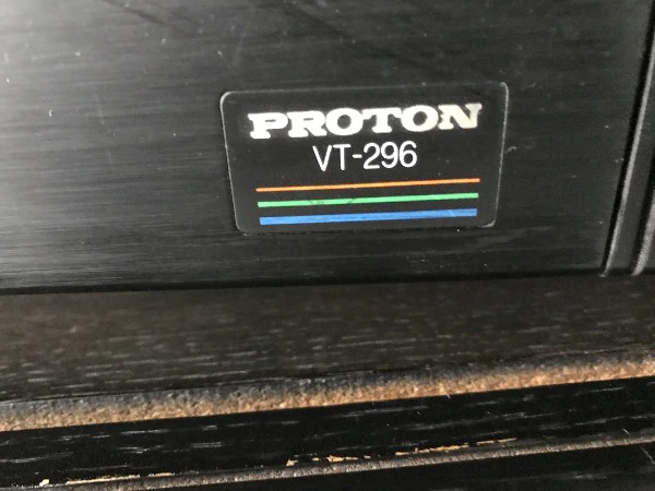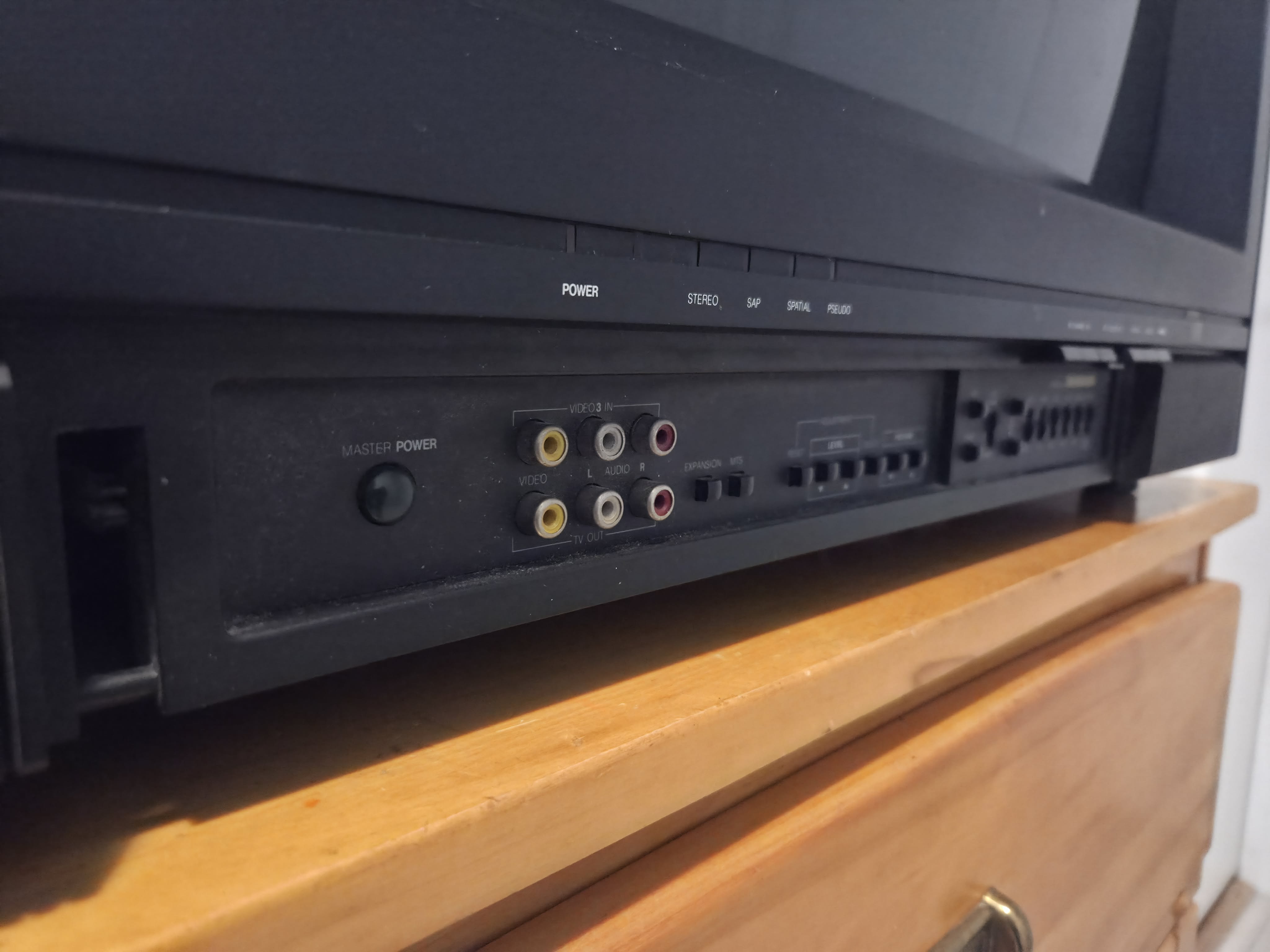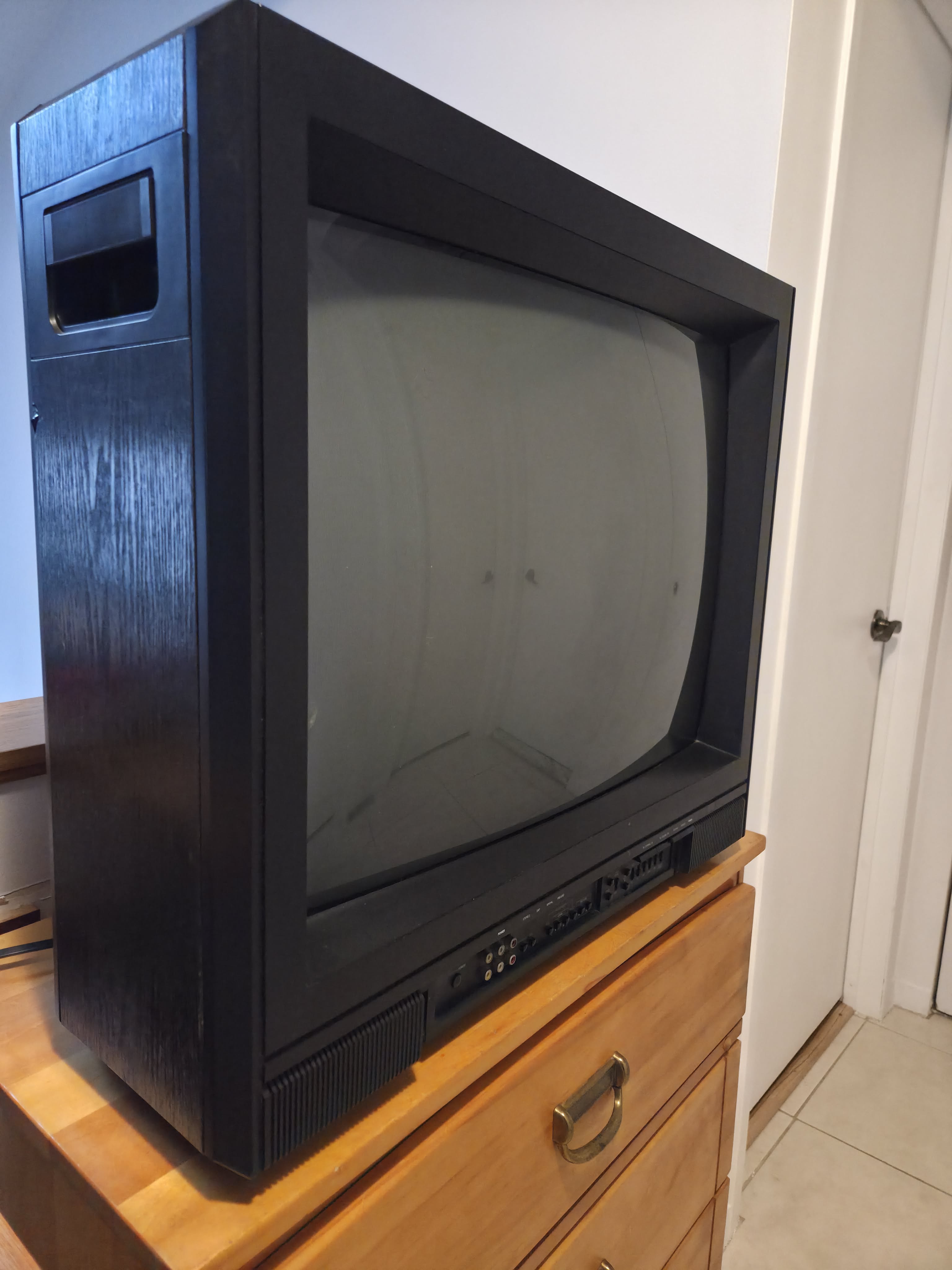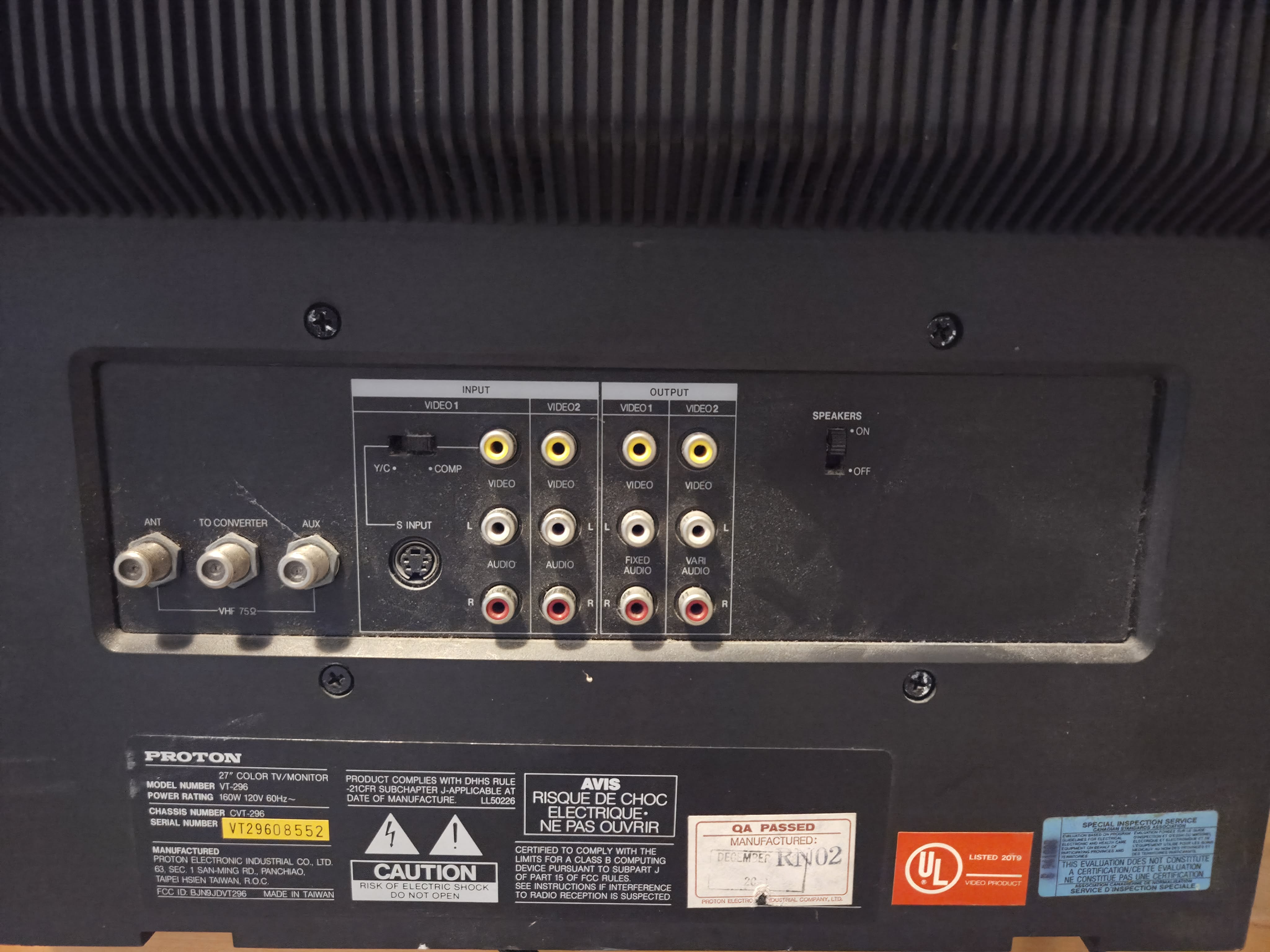 Higher-end 27" CRT TV by Proton, made in Taiwan in 1989. Has RF, composite, and either digital RGB or s-video inputs with stereo sound.