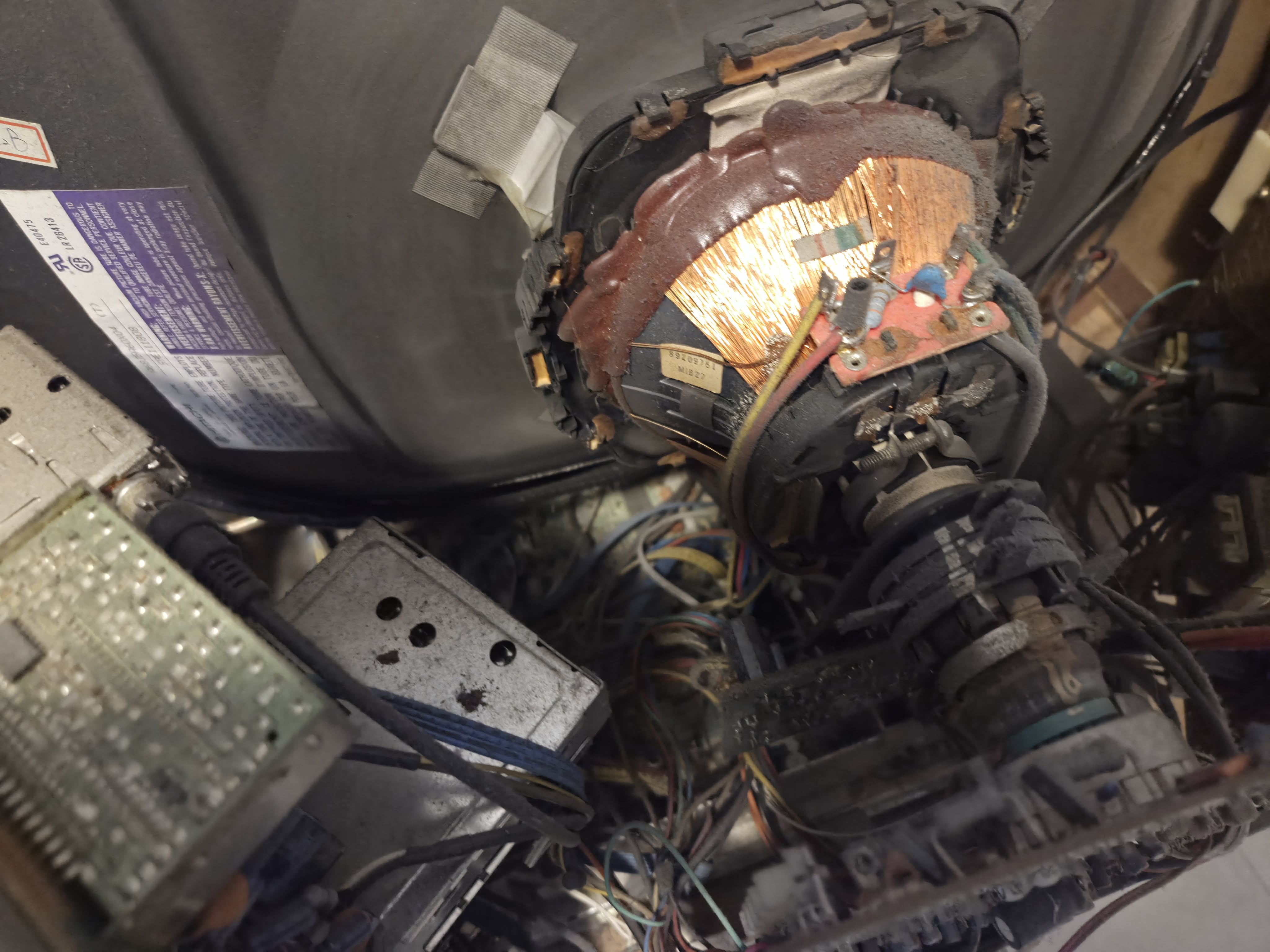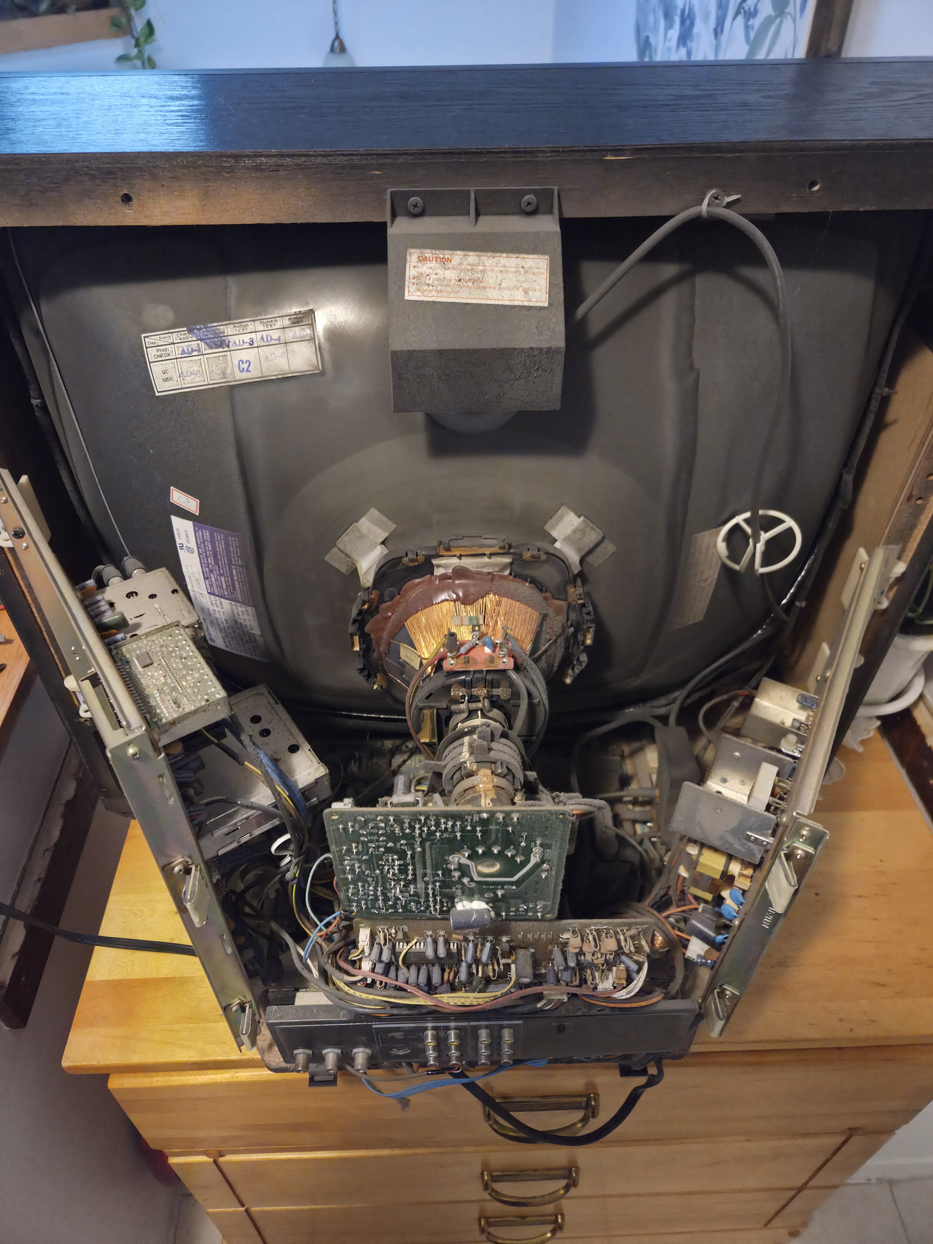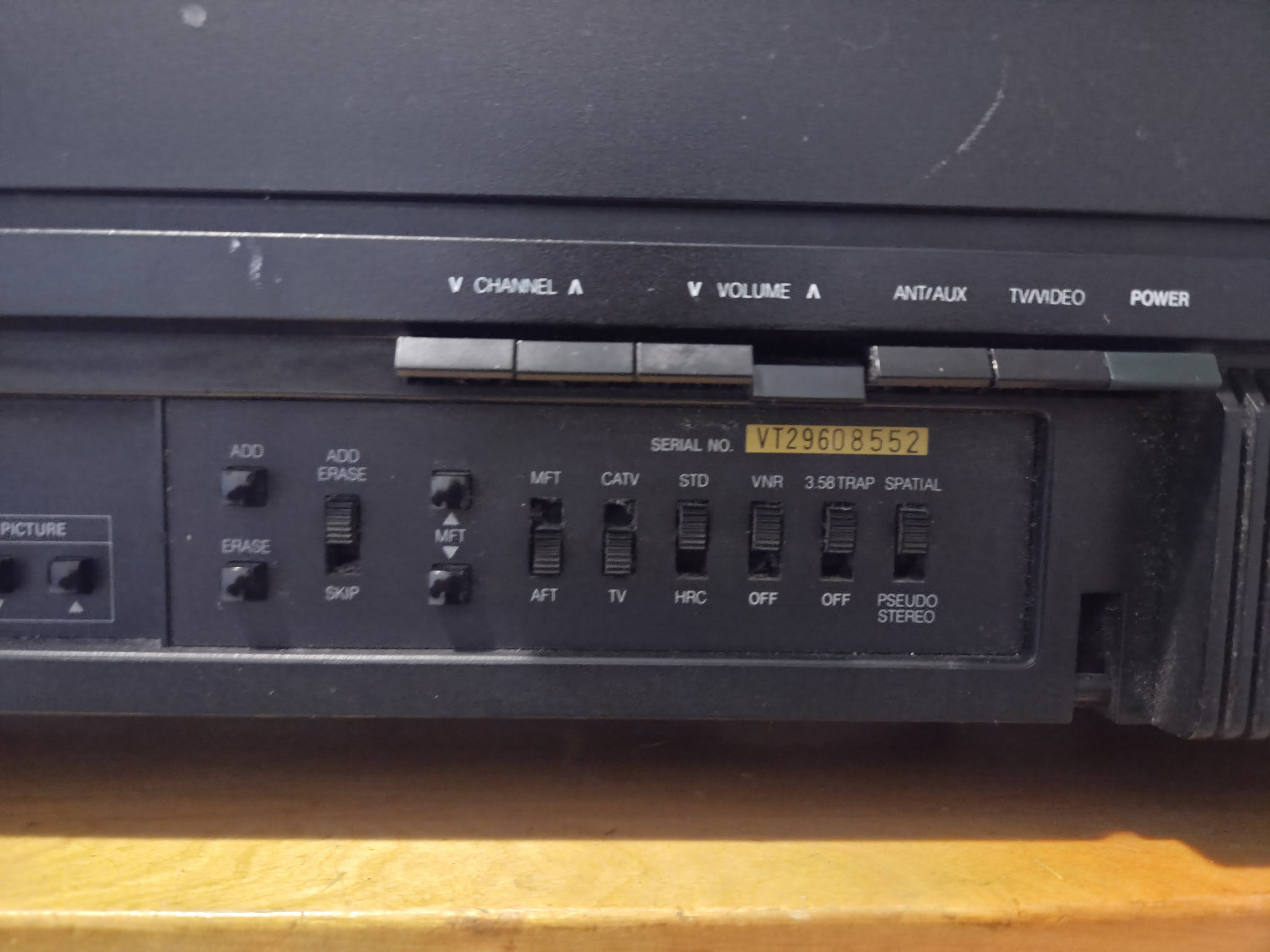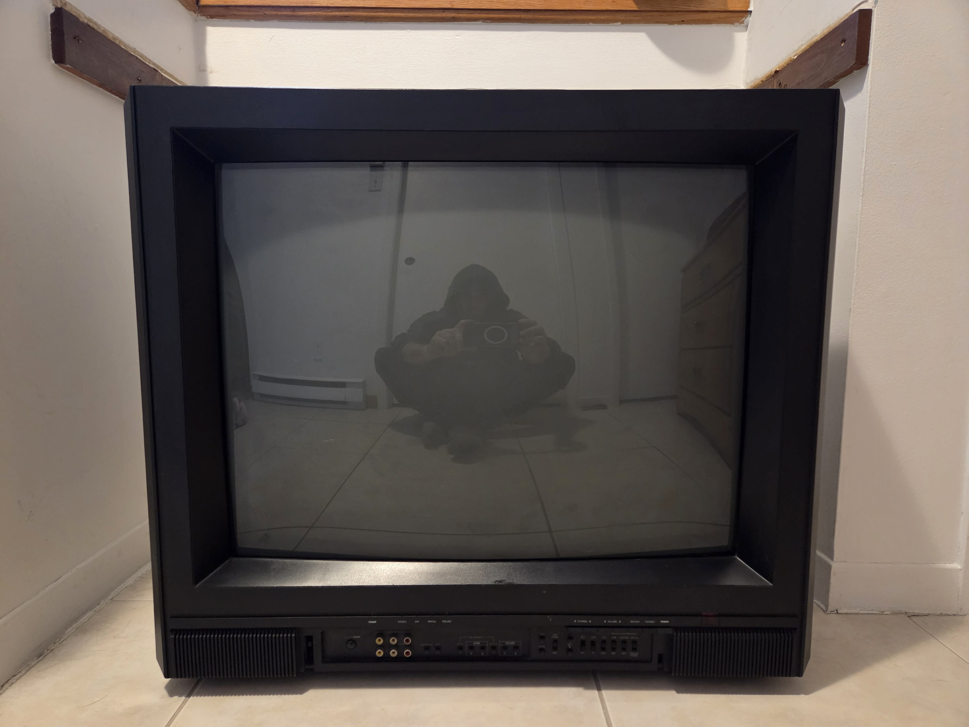 Higher-end 27" CRT TV by Proton, made in Taiwan in 1989. Has RF, composite, and either digital RGB or s-video inputs with stereo sound.