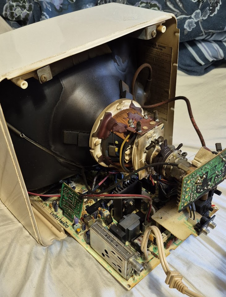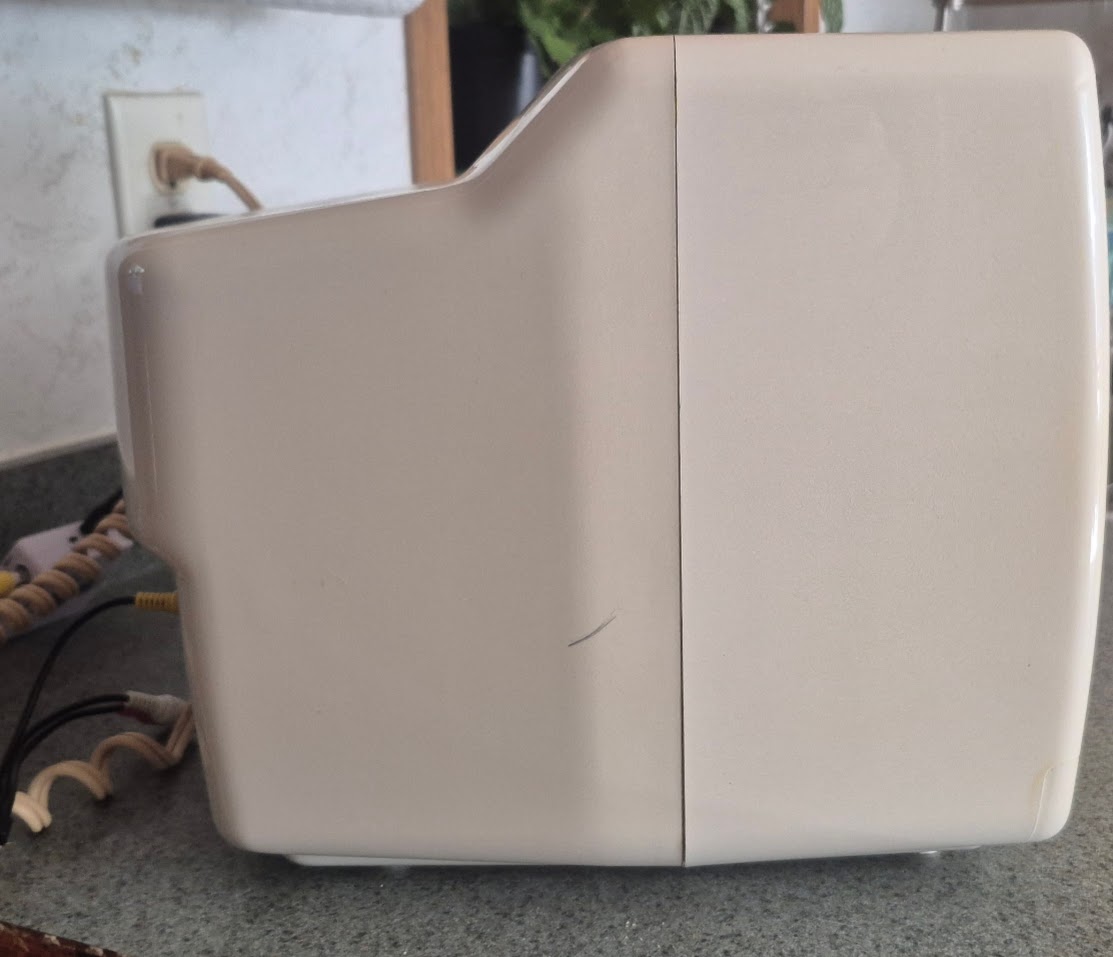 Very portable easy to carry 10 inch TV. this example has some very moderate yellowing on the front of the shell. It does not affect function however. There is a noticeable higher gamma then normal - this may also be due to age. It has a Mono speaker inside that surprisingly gets very loud. The shell is made of typical early 90s ABS plastic.