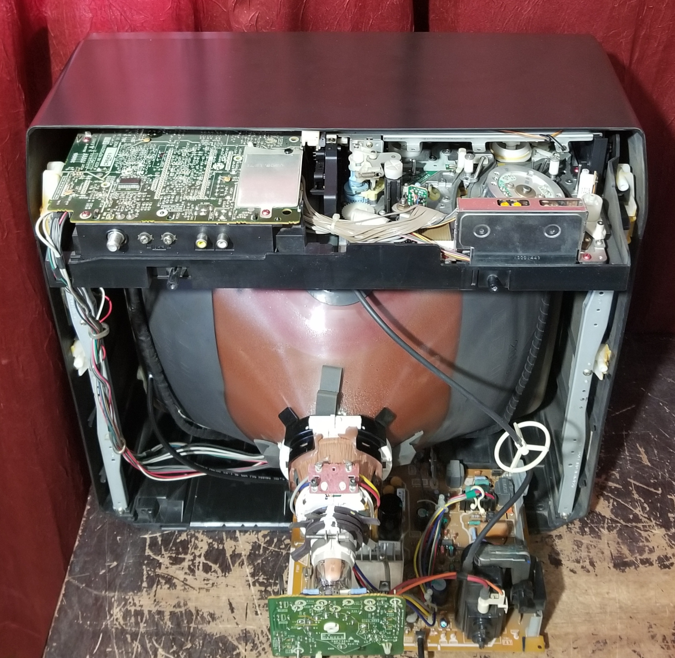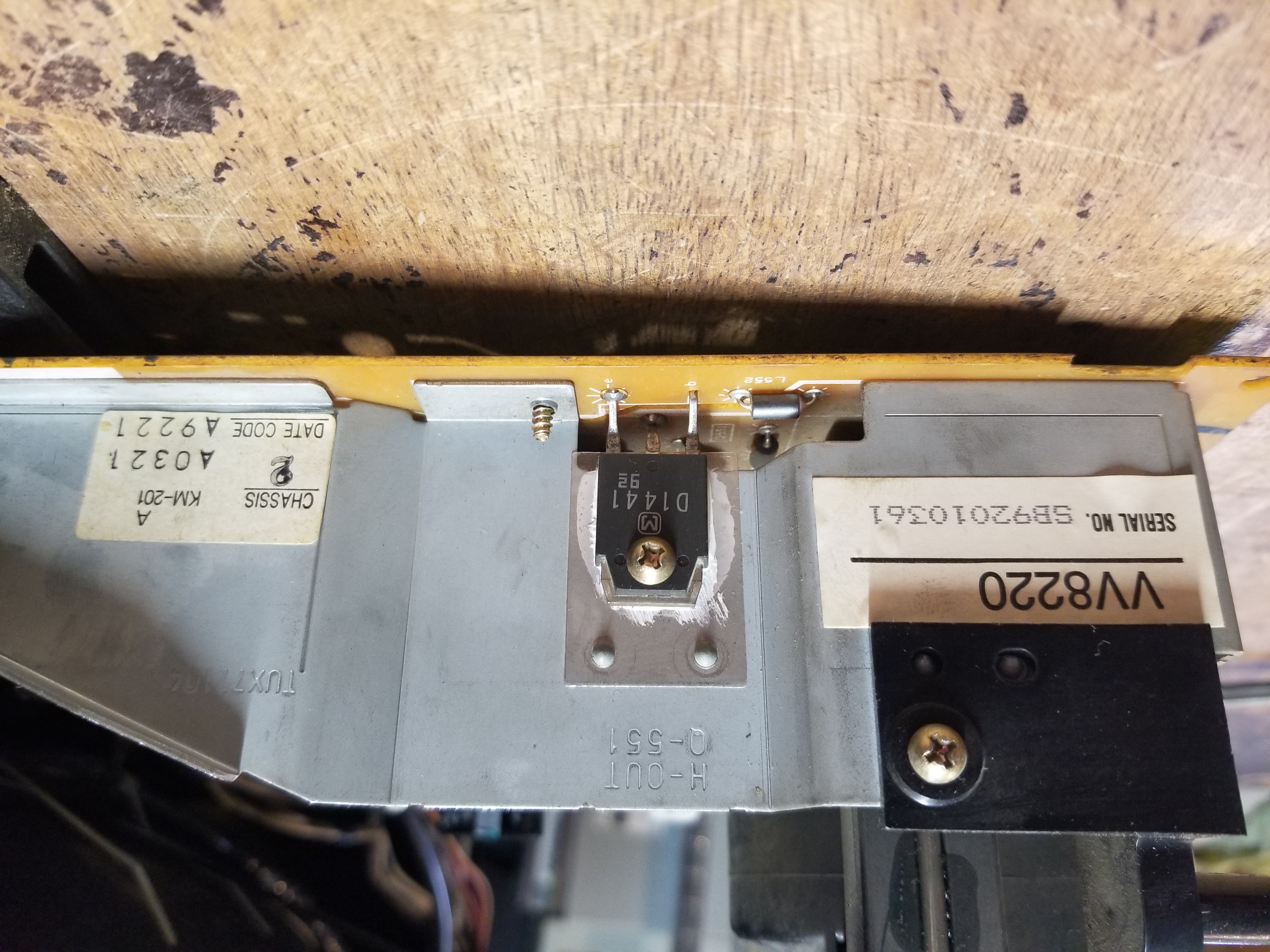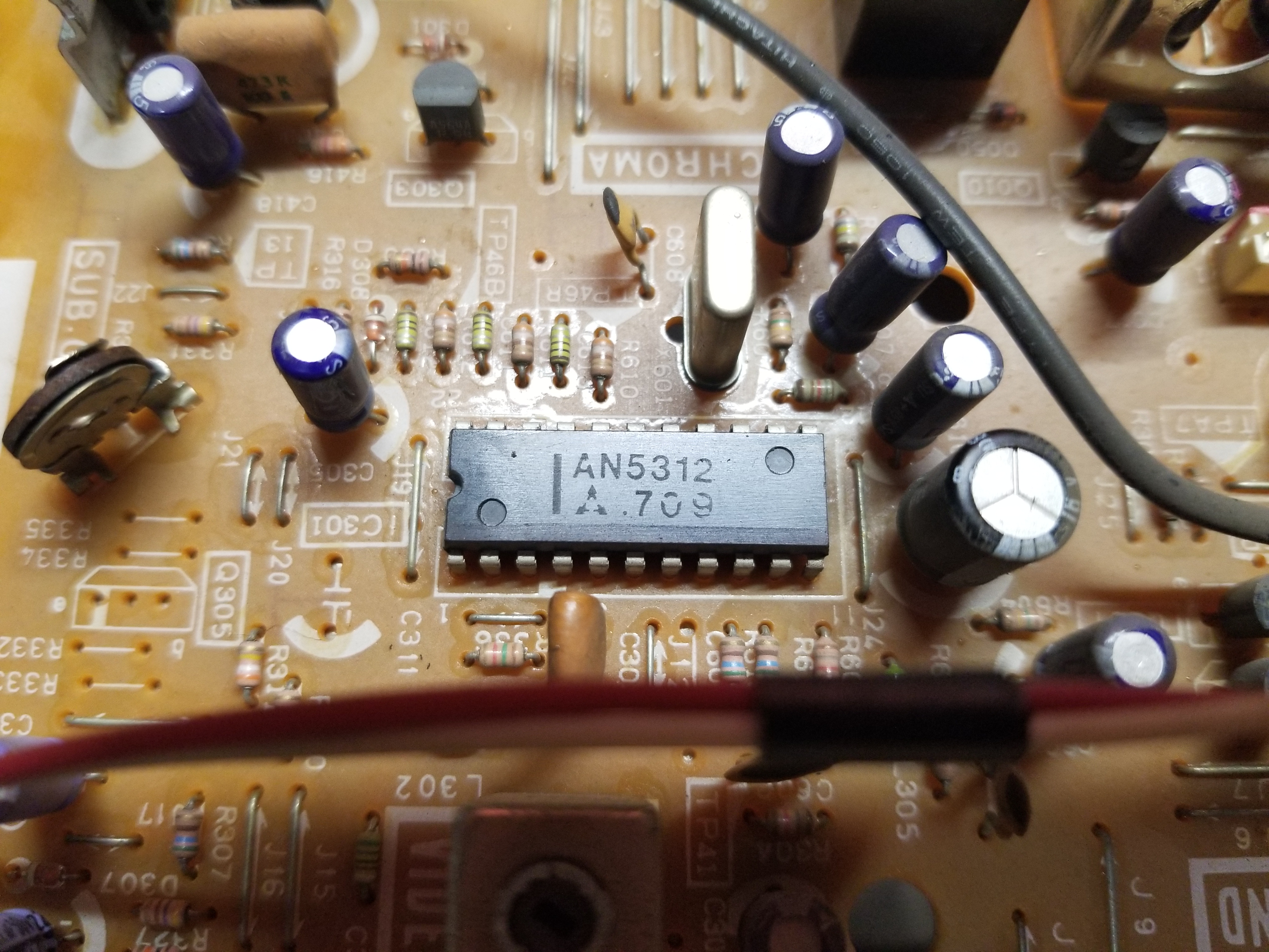 There was a vertical scrolling wave of brightness on the raster at all times, as well as a vertical scrolling wave of distortion when playing VHS tapes. Also it would display a blue screen for some tapes while the tape was playing, but then show the content during fast forward. All electrolytics in the power section were ESR tested. C1016 & C1017 on the secondary side beneath RF shielding had unrealistically high capacitance readings and moderately high ESR when tested in-circuit. Pulling them out of circuit revealed one to have gone open and the other to have high ESR. Replacing both fixed the vertical wave issues, 330uF 6.3V.