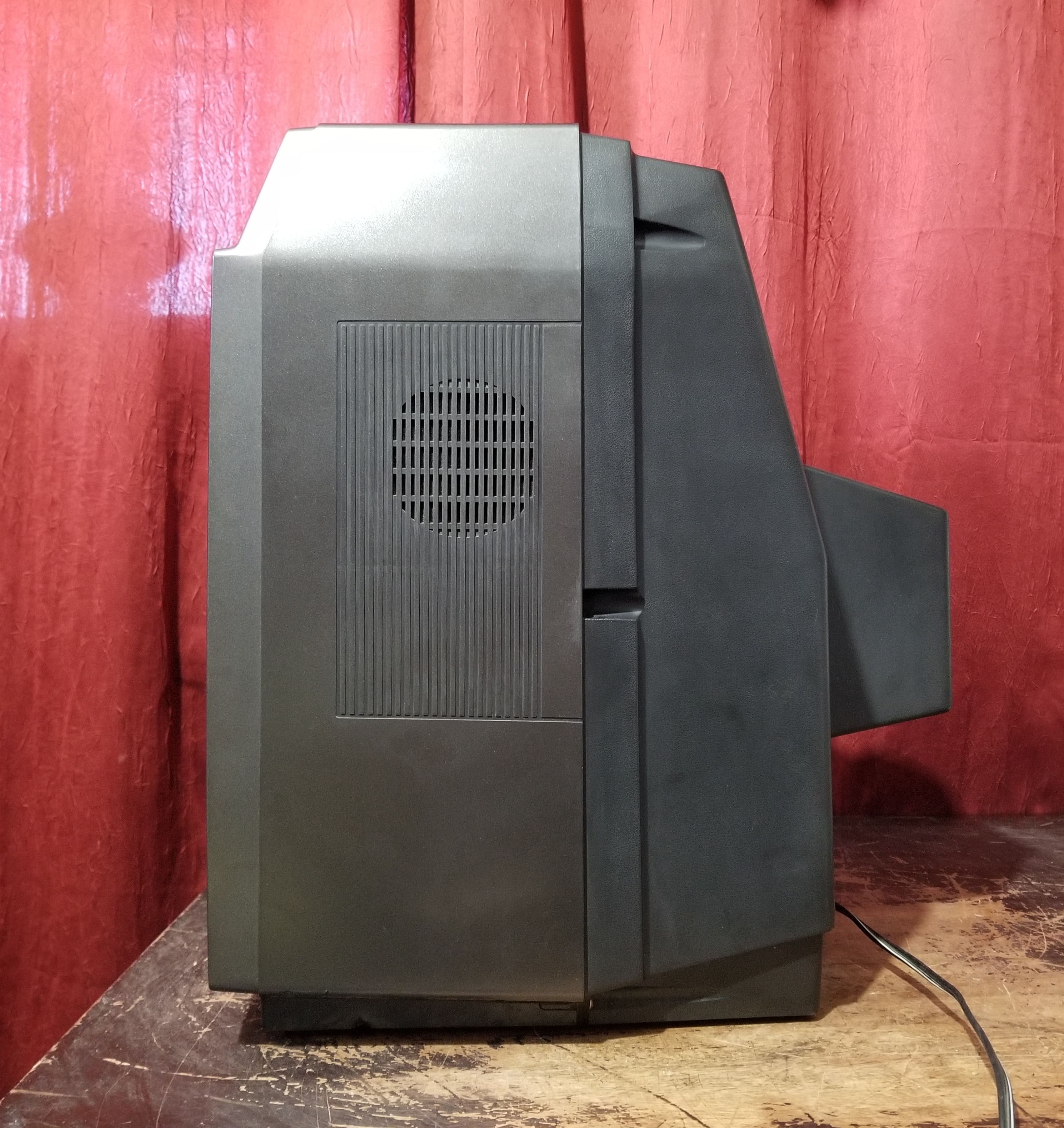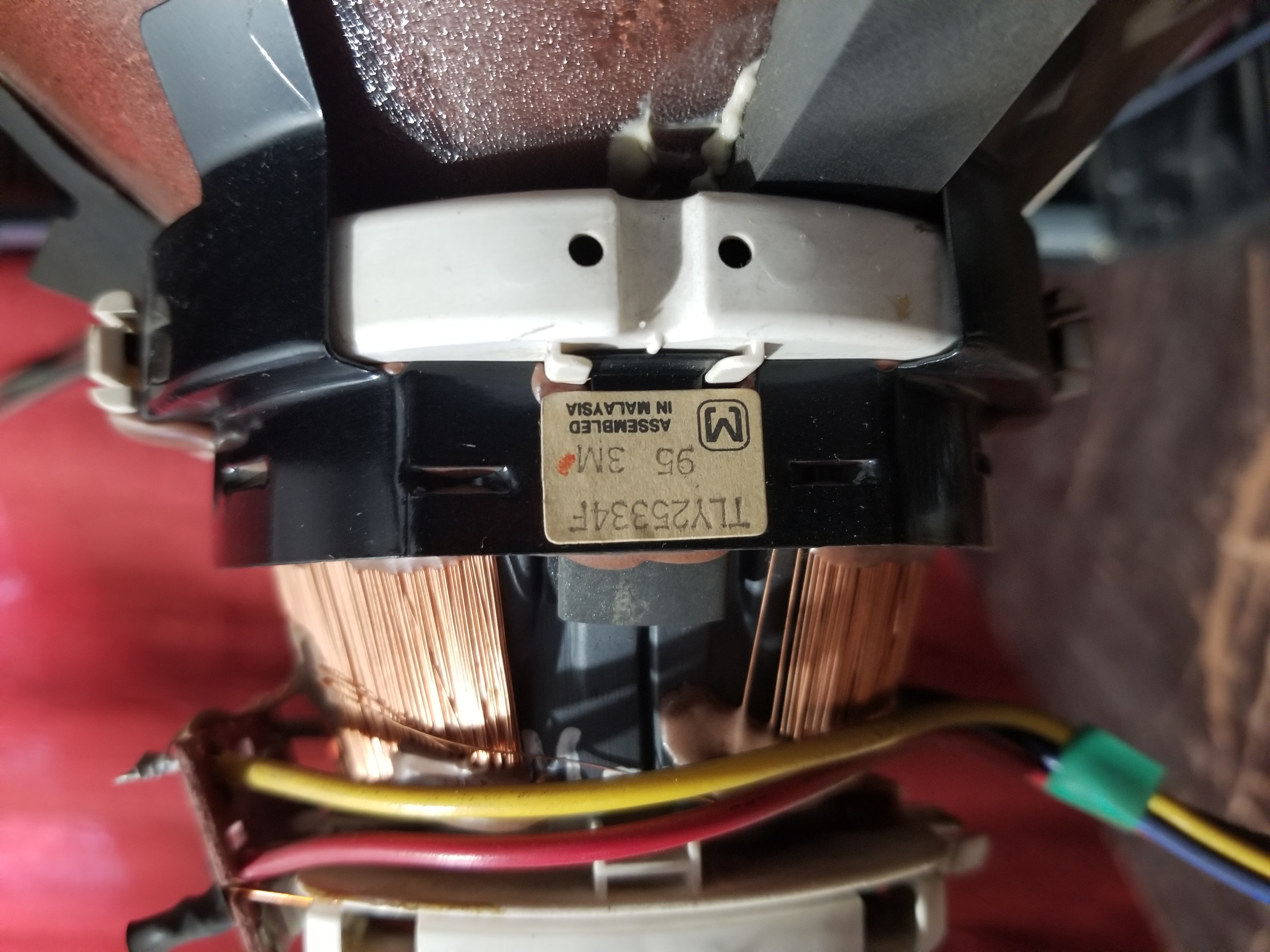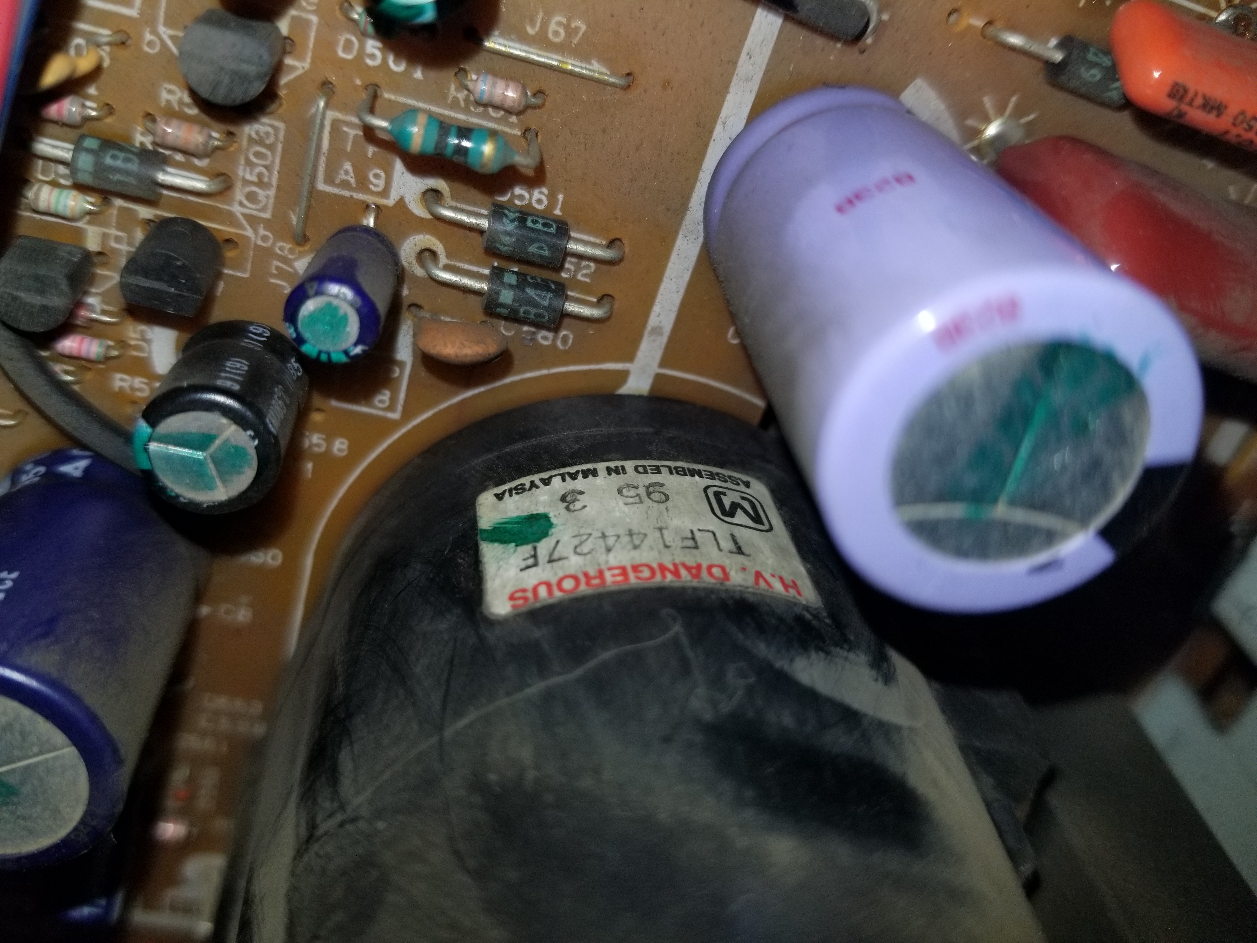 There was a vertical scrolling wave of brightness on the raster at all times, as well as a vertical scrolling wave of distortion when playing VHS tapes. Also it would display a blue screen for some tapes while the tape was playing, but then show the content during fast forward. All electrolytics in the power section were ESR tested. C1016 & C1017 on the secondary side beneath RF shielding had unrealistically high capacitance readings and moderately high ESR when tested in-circuit. Pulling them out of circuit revealed one to have gone open and the other to have high ESR. Replacing both fixed the vertical wave issues, 330uF 6.3V.