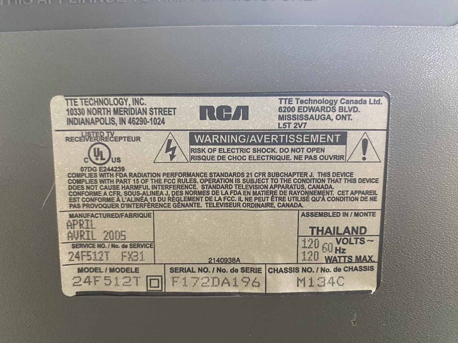 Above-average 24" CRT by RCA from 2005. Has RF, composite, and s-video input. Manufactured by TTE at Thomson's Thailand facility before being sent overseas to be distributed in the United States.