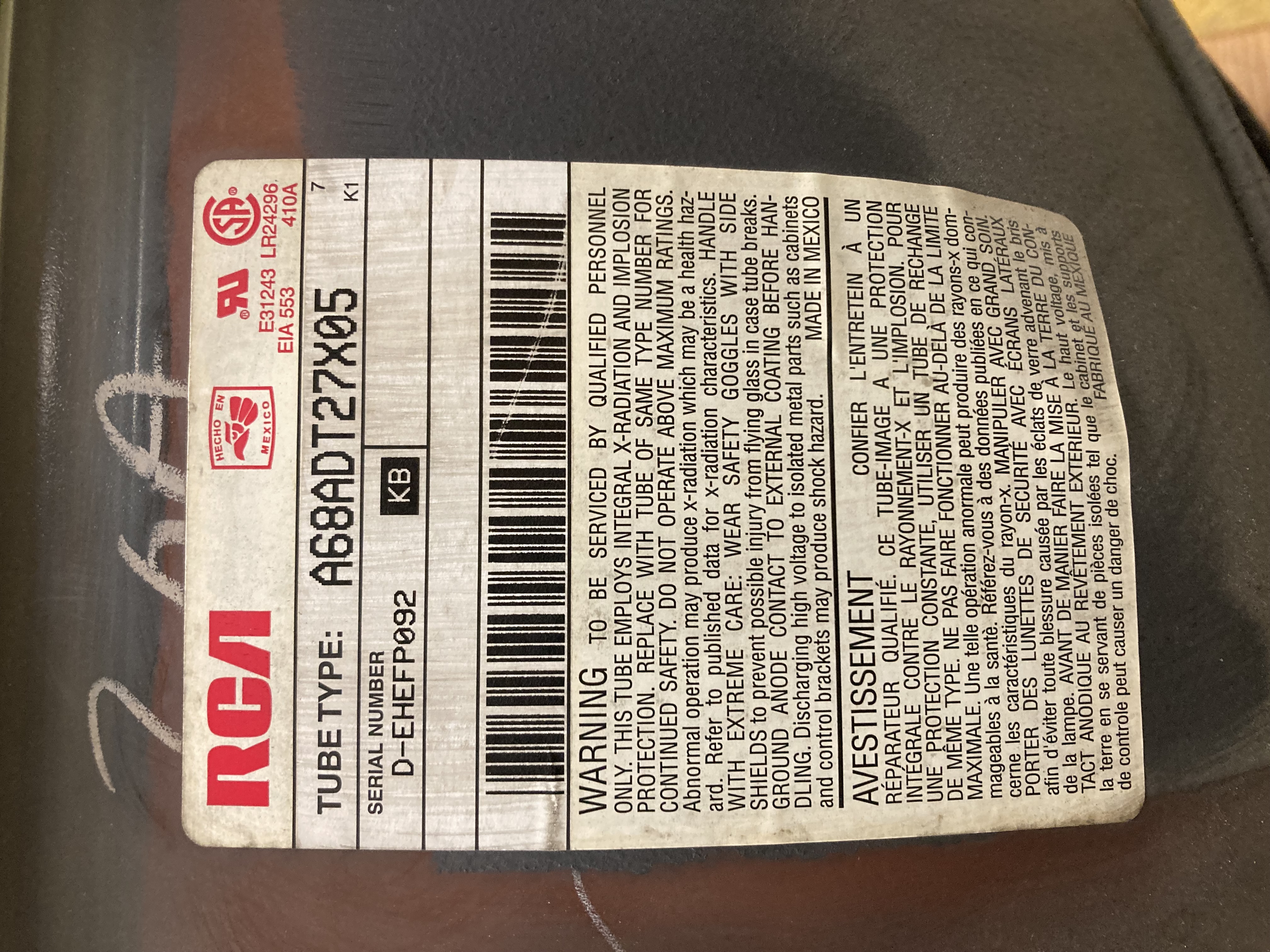 The tube was made at RCA's Mexico facility, and it is surprisingly good. Normally these ADT-family tubes would have soft corners, but this one—whether it be due to low hours or just being a good model—is quite sharp from edge to edge. The yoke being bonded is a bit of a bummer, but its still quite a good tube regardless.