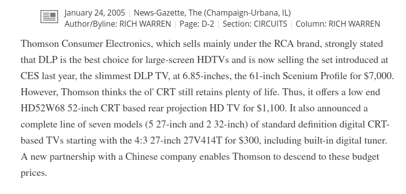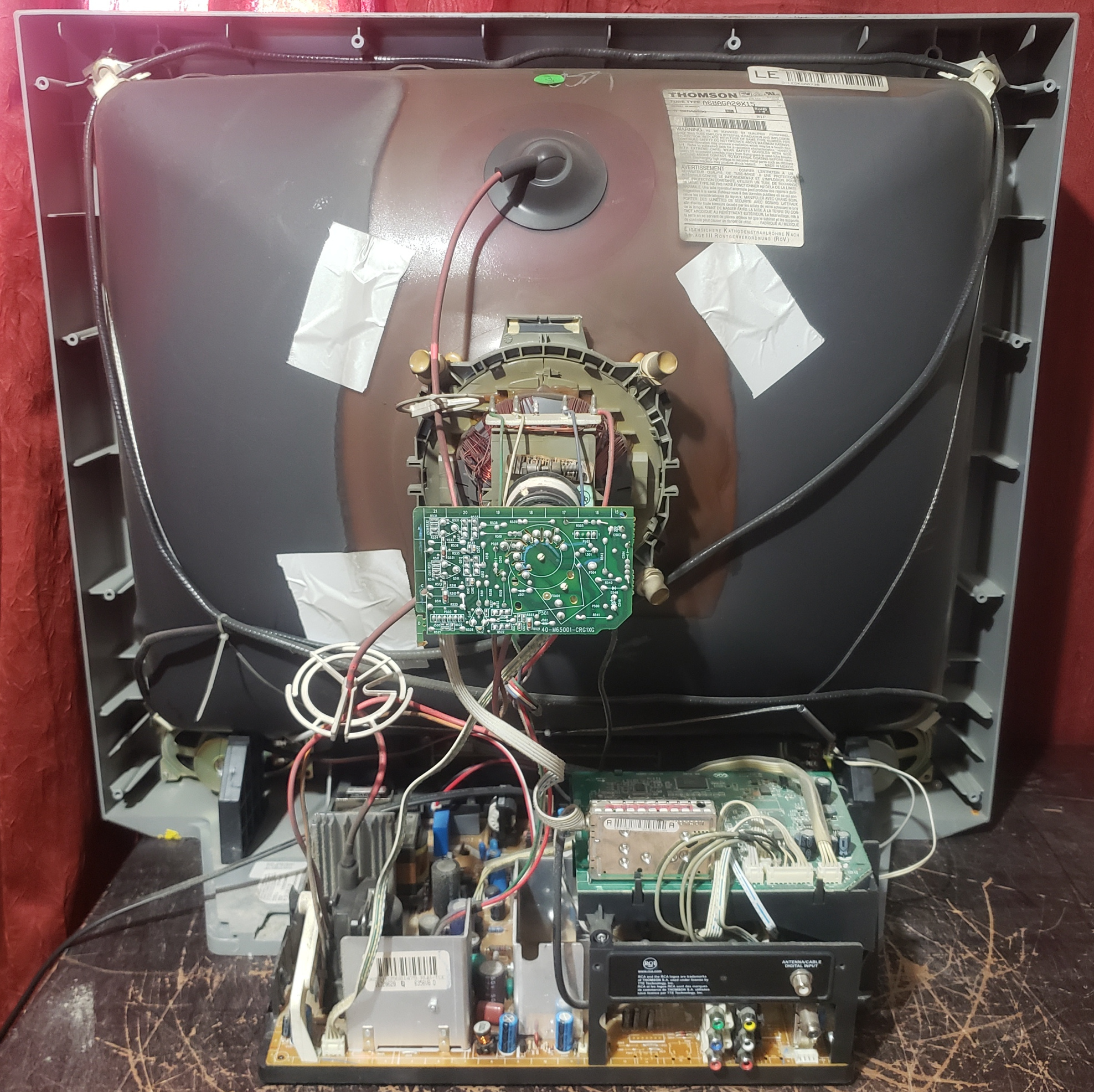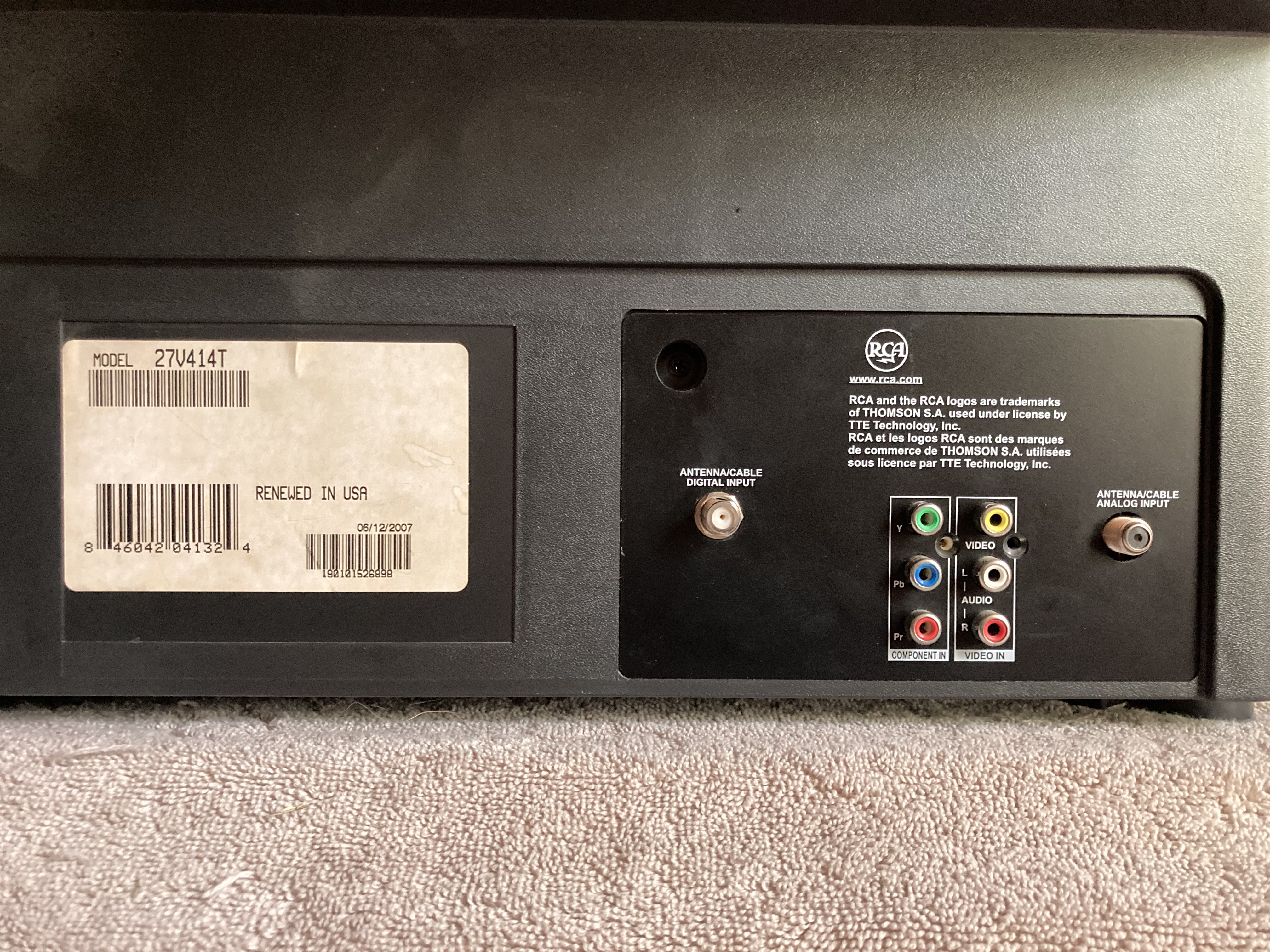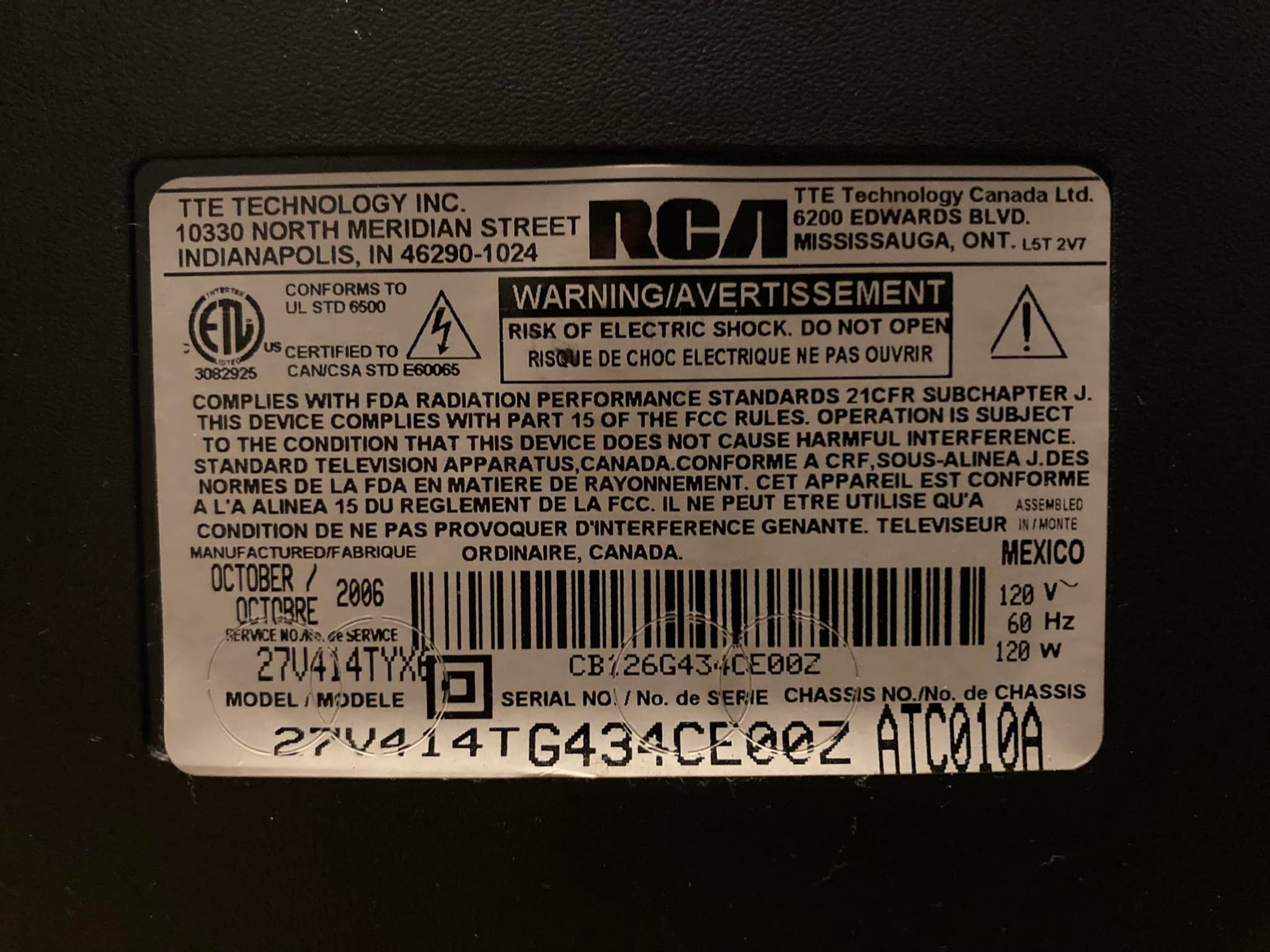 Late model 27" SDTV from RCA. Features RF, composite, and component inputs. Made by Thomson's Mexico facility in 2006.