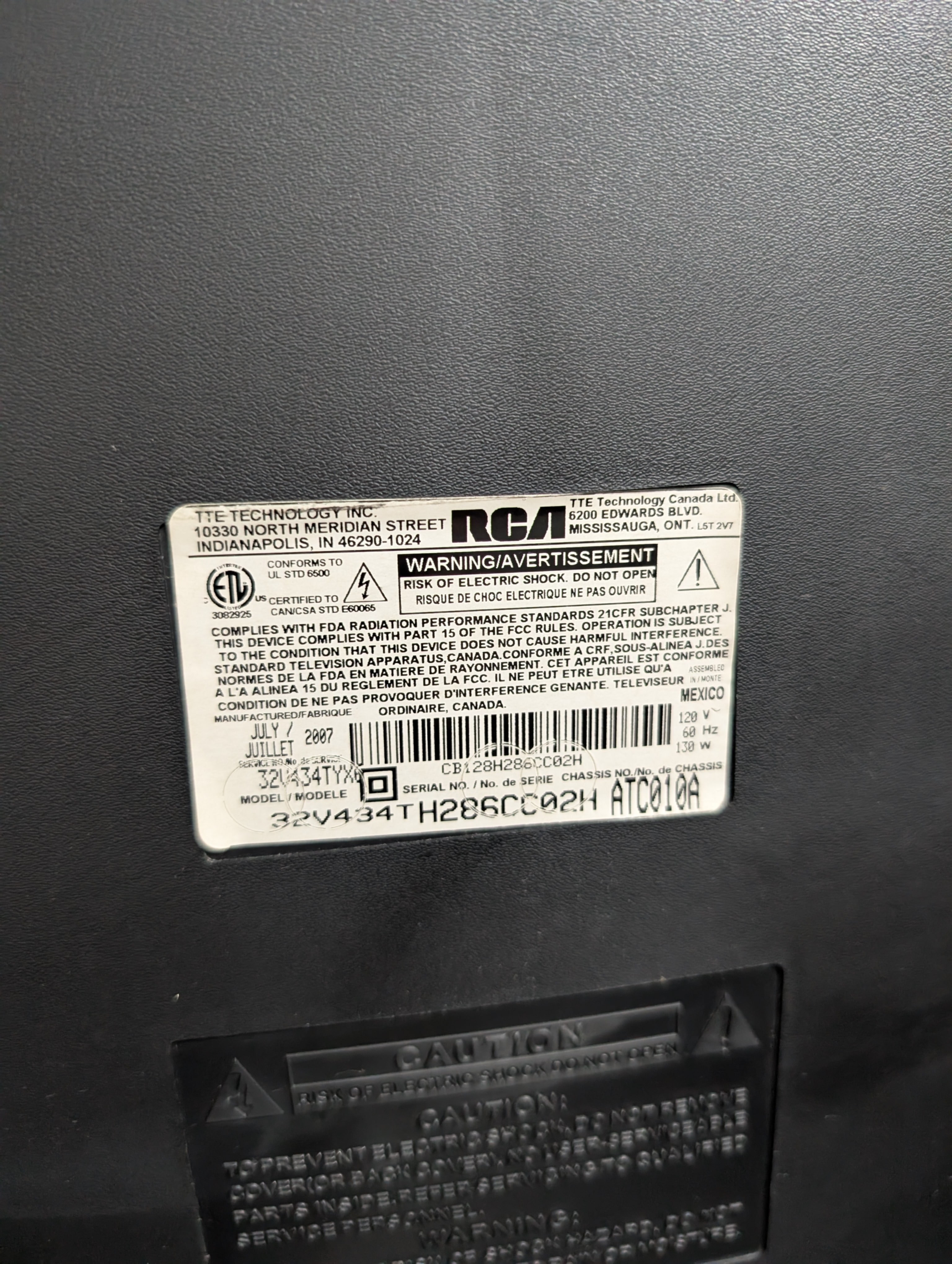 32" RCA CRT from 2006. Originally manufactured by TTE Technology in Mexico. Uses the same case as the 32V432T, but now has an ATSC tuner indicated by the SDTV logo in the upper left corner.