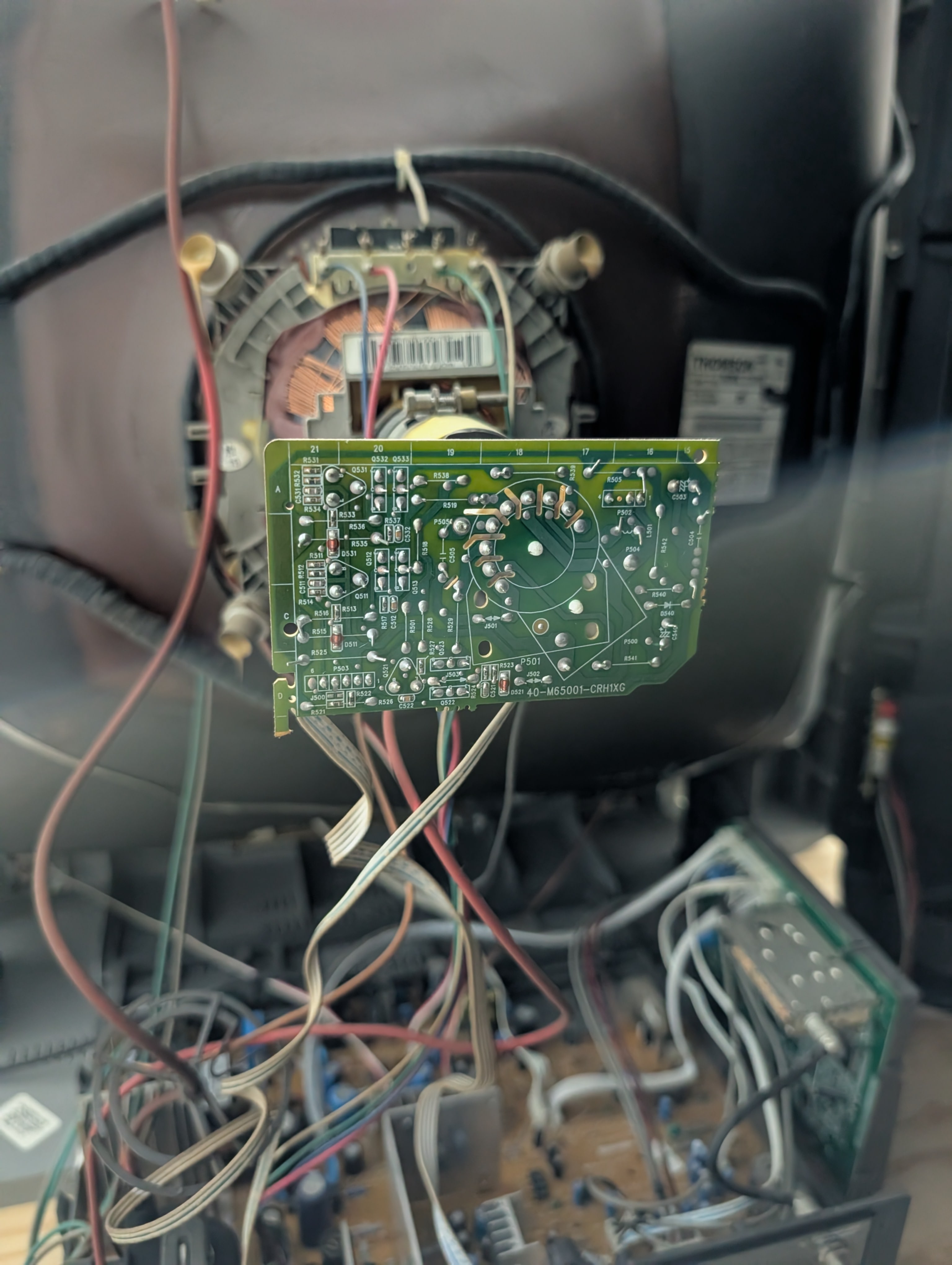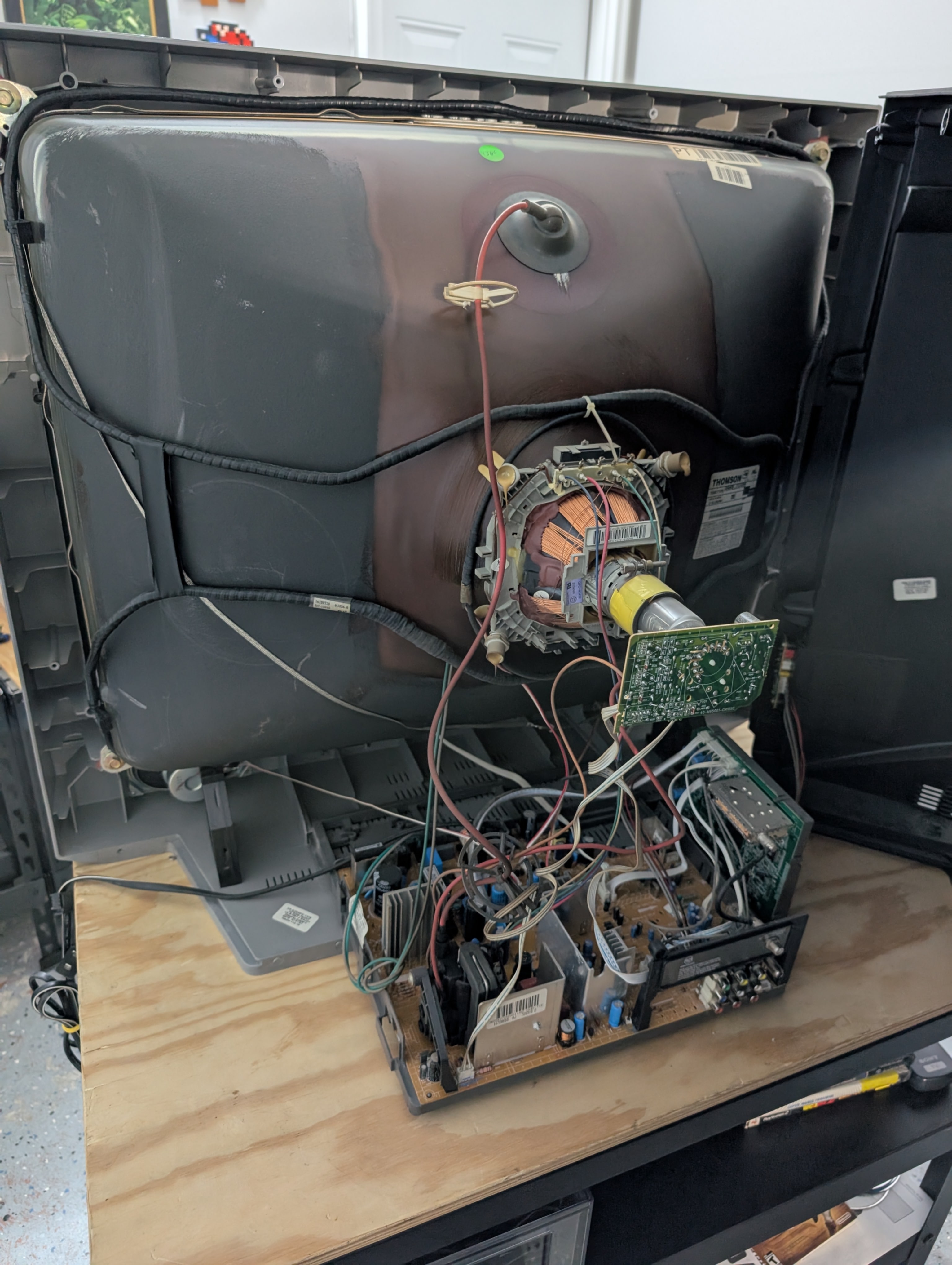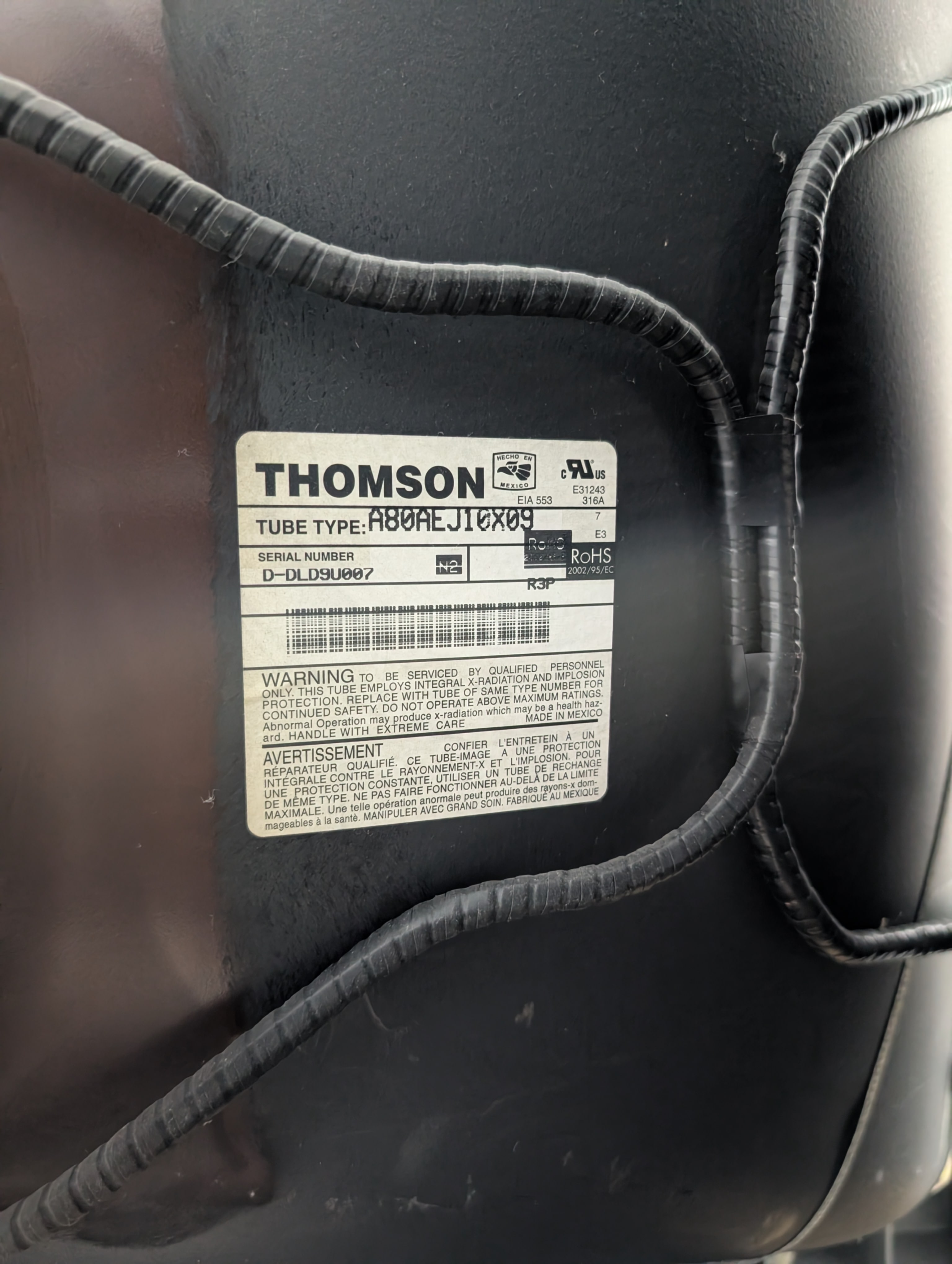 Picture tube is part of the AEJ family RCA introduced years prior, but now produced by Thomson at their Mexico plant. And it's a darn good tube! Great geometry, convergence, and pretty reliable.