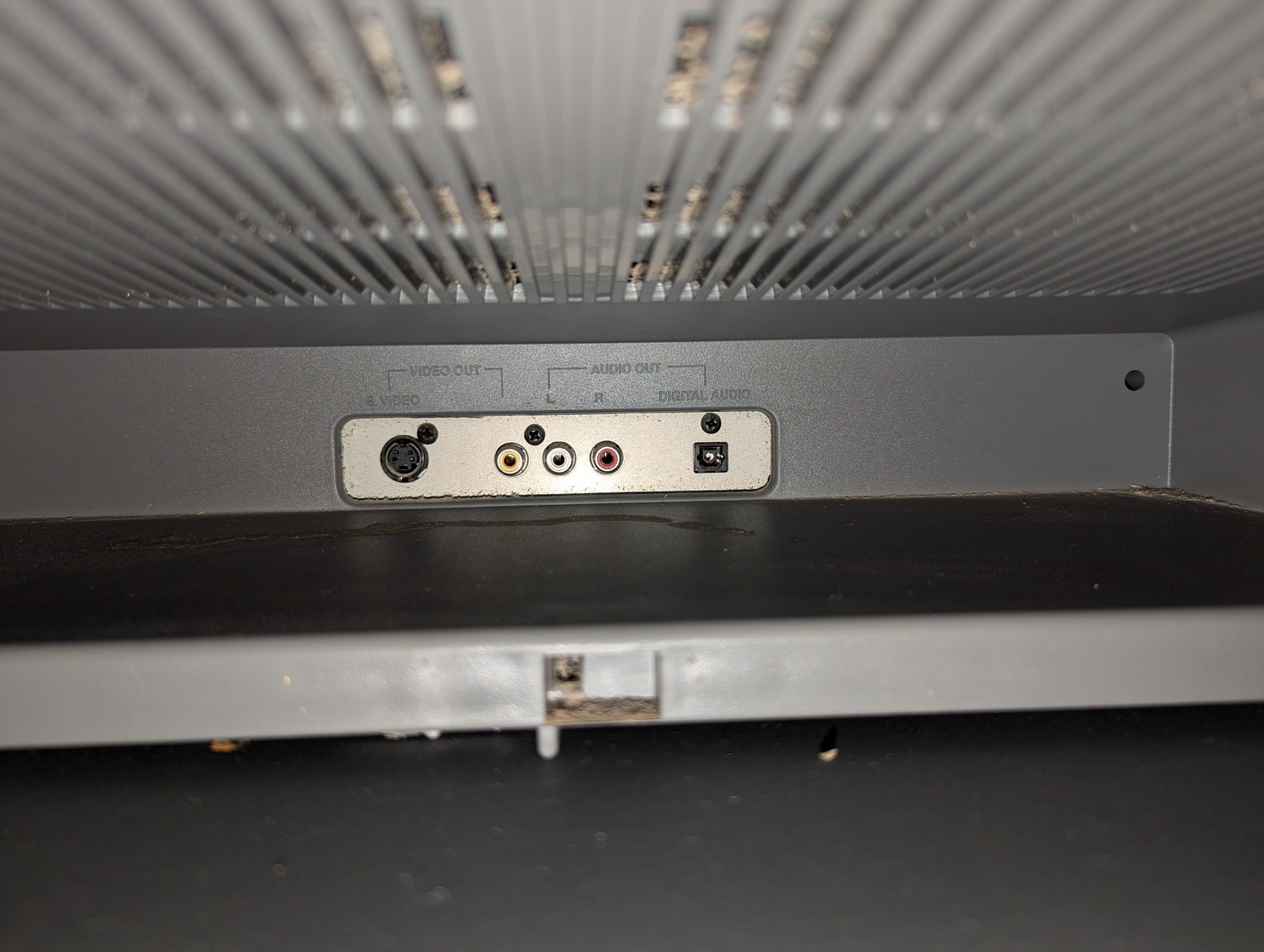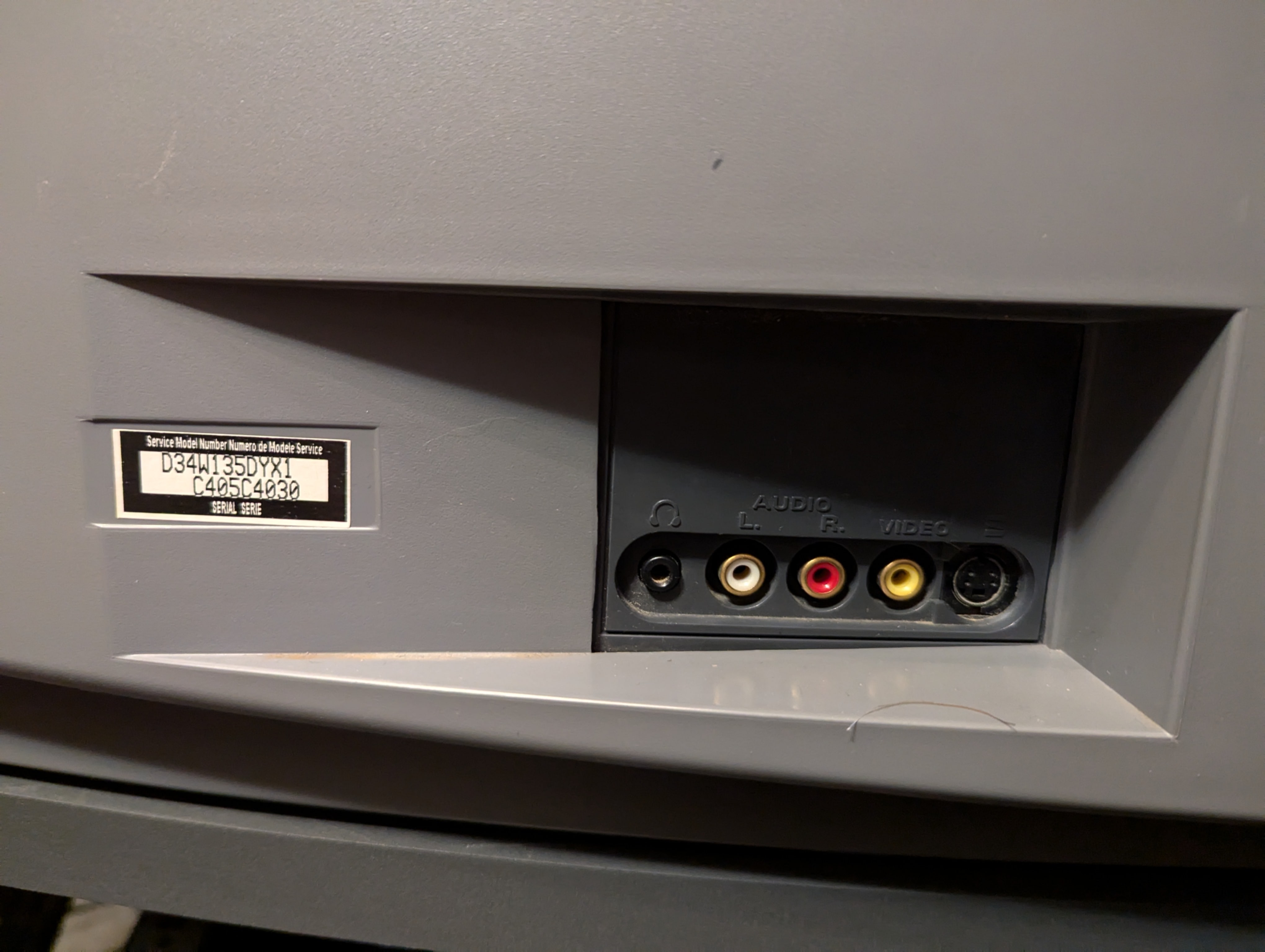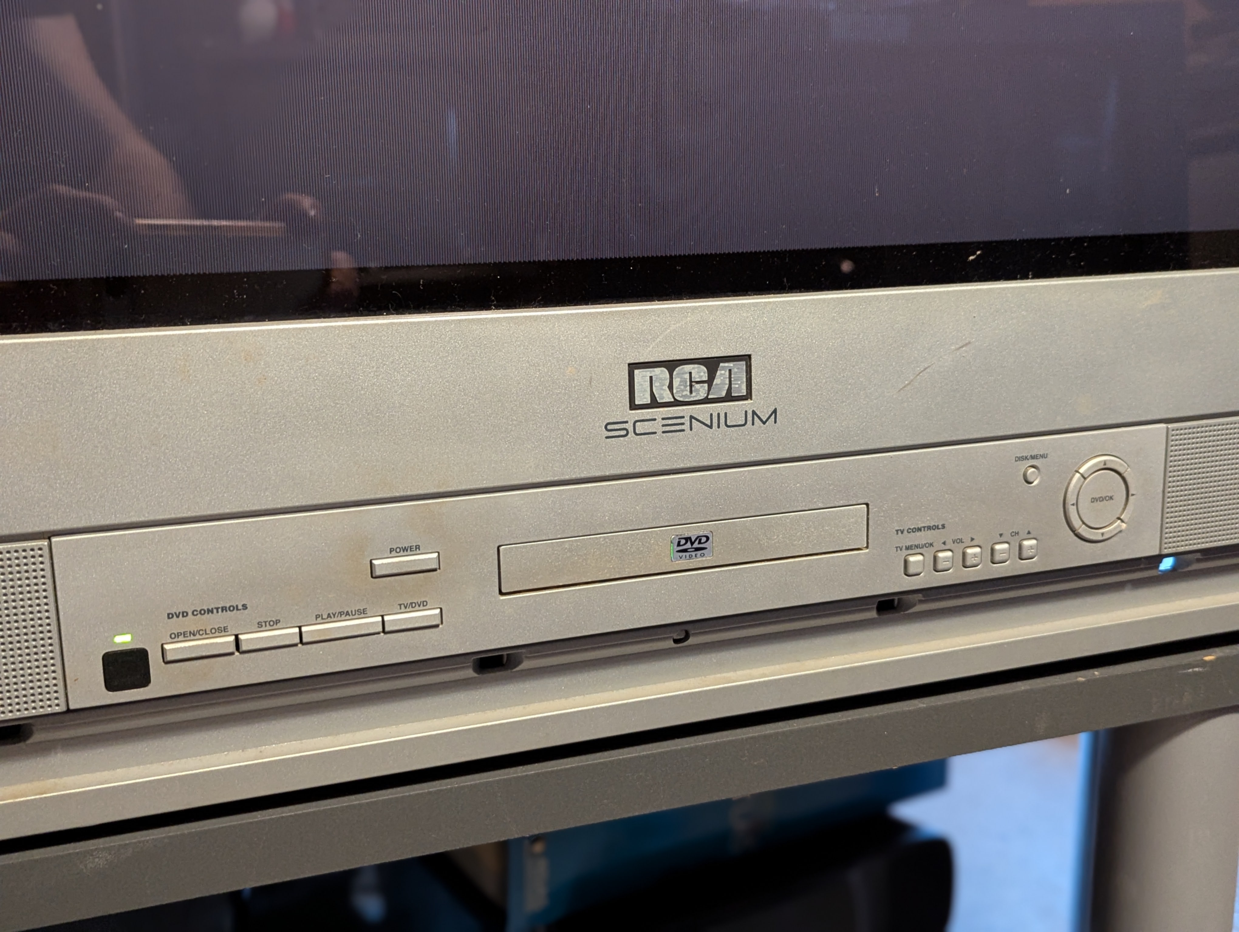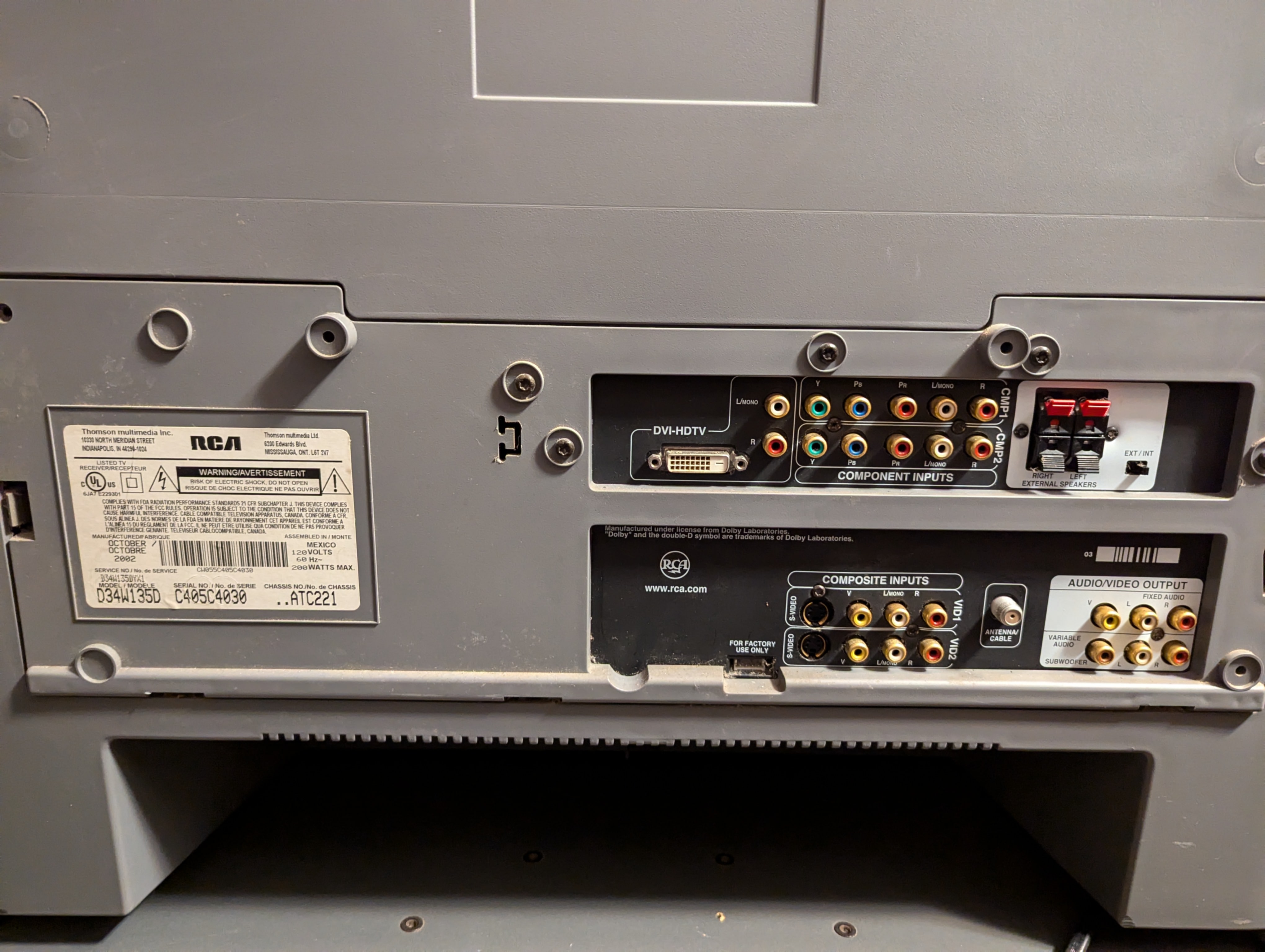 One of the RCA's first flat HD CRT TVs. This is a higher-end model compared to the D34W20 in that it has a built-in DVD player. Made by Thomson in Mexico, in 2002. Uses a special 34" Toshiba Microfilter tube made in Japan.