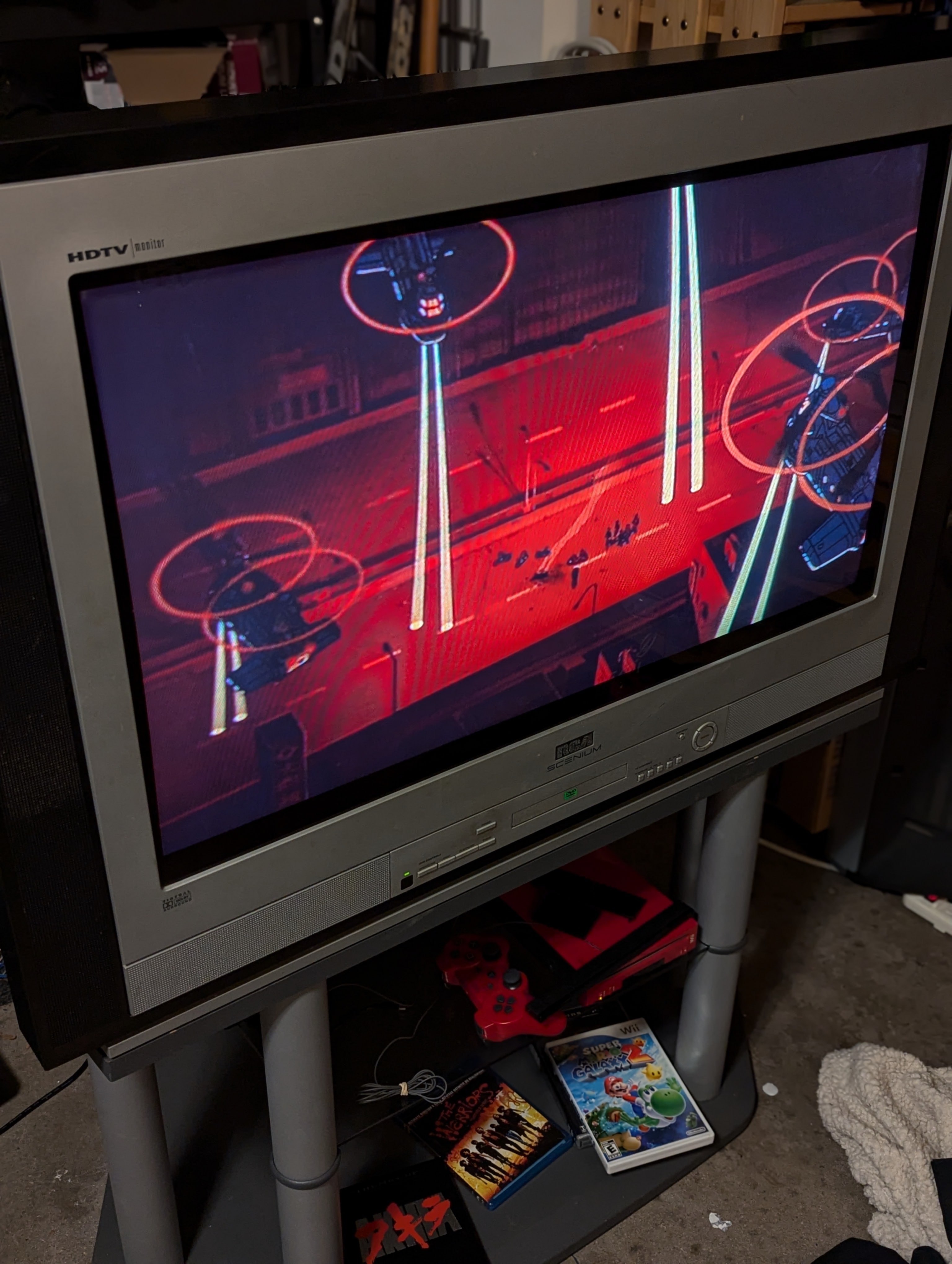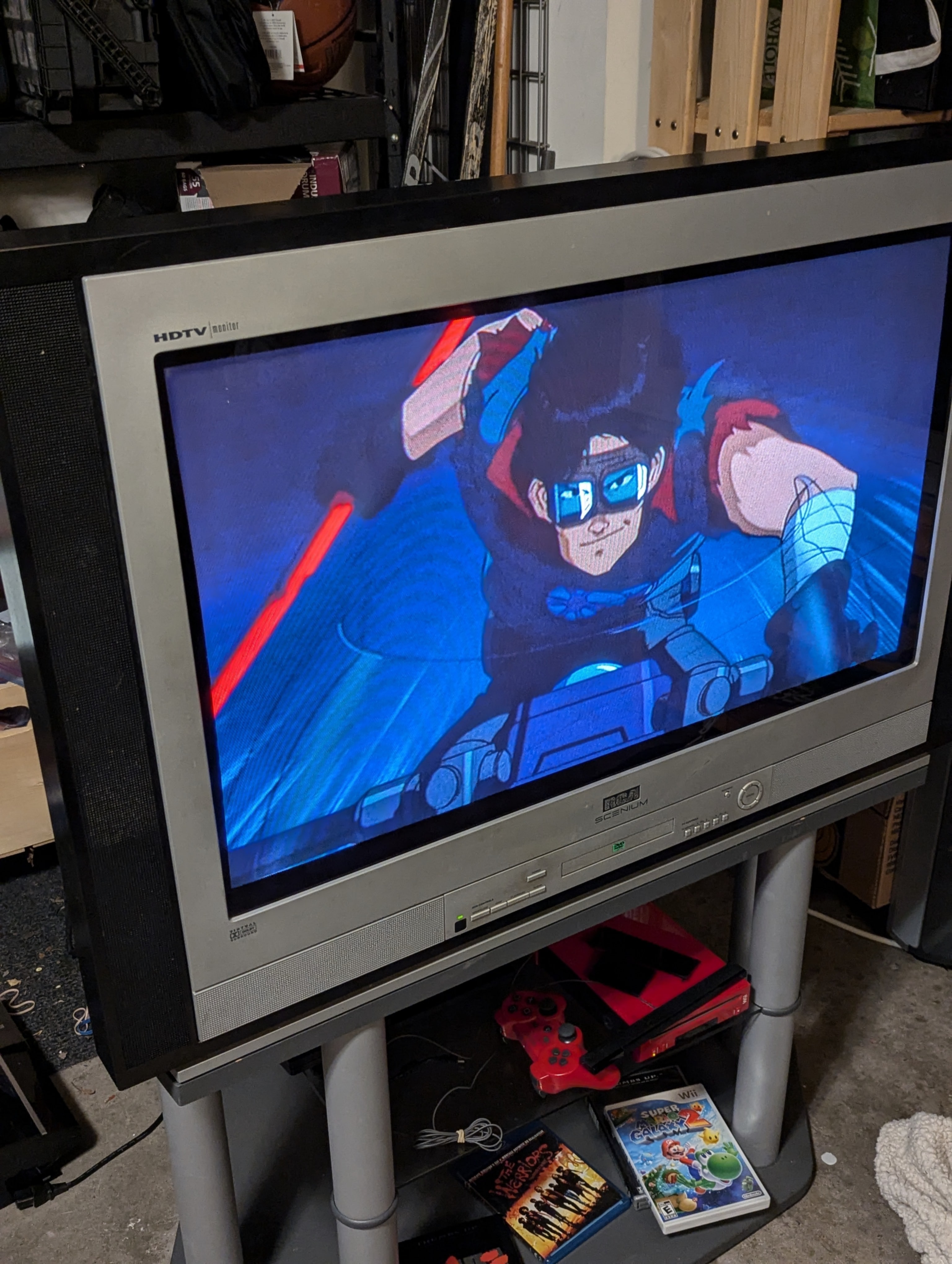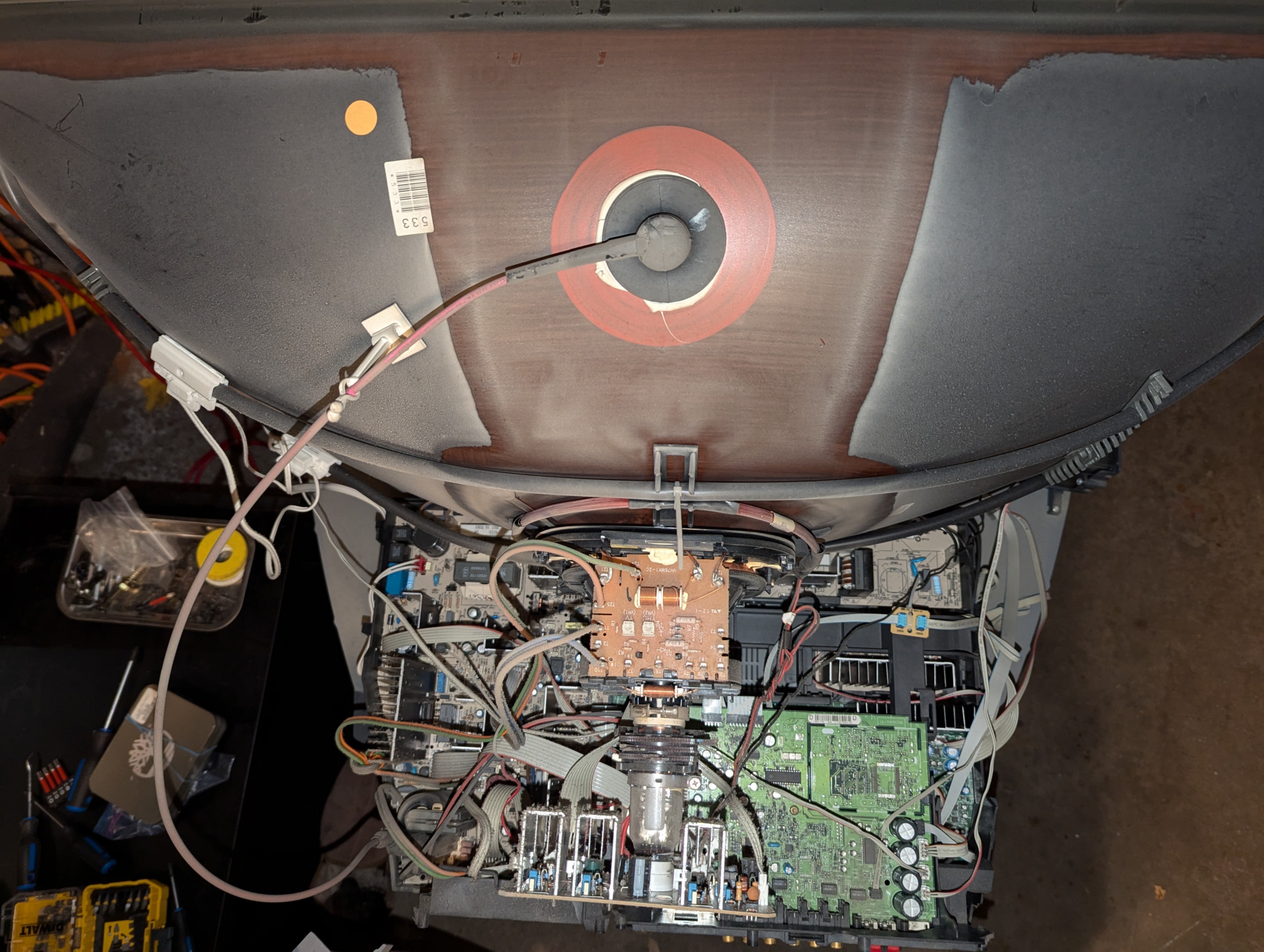 One of the RCA's first flat HD CRT TVs. This is a higher-end model compared to the D34W20 in that it has a built-in DVD player. Made by Thomson in Mexico, in 2002. Uses a special 34" Toshiba Microfilter tube made in Japan.