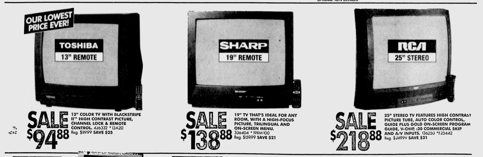 A step above their budget line of sets, RCA's Entertainment Series had step-up features which could include higher fidelity inputs (beyond RF) and stereo speakers. "Optimum Contrast" means that the tube's faceplate is dark tinted.