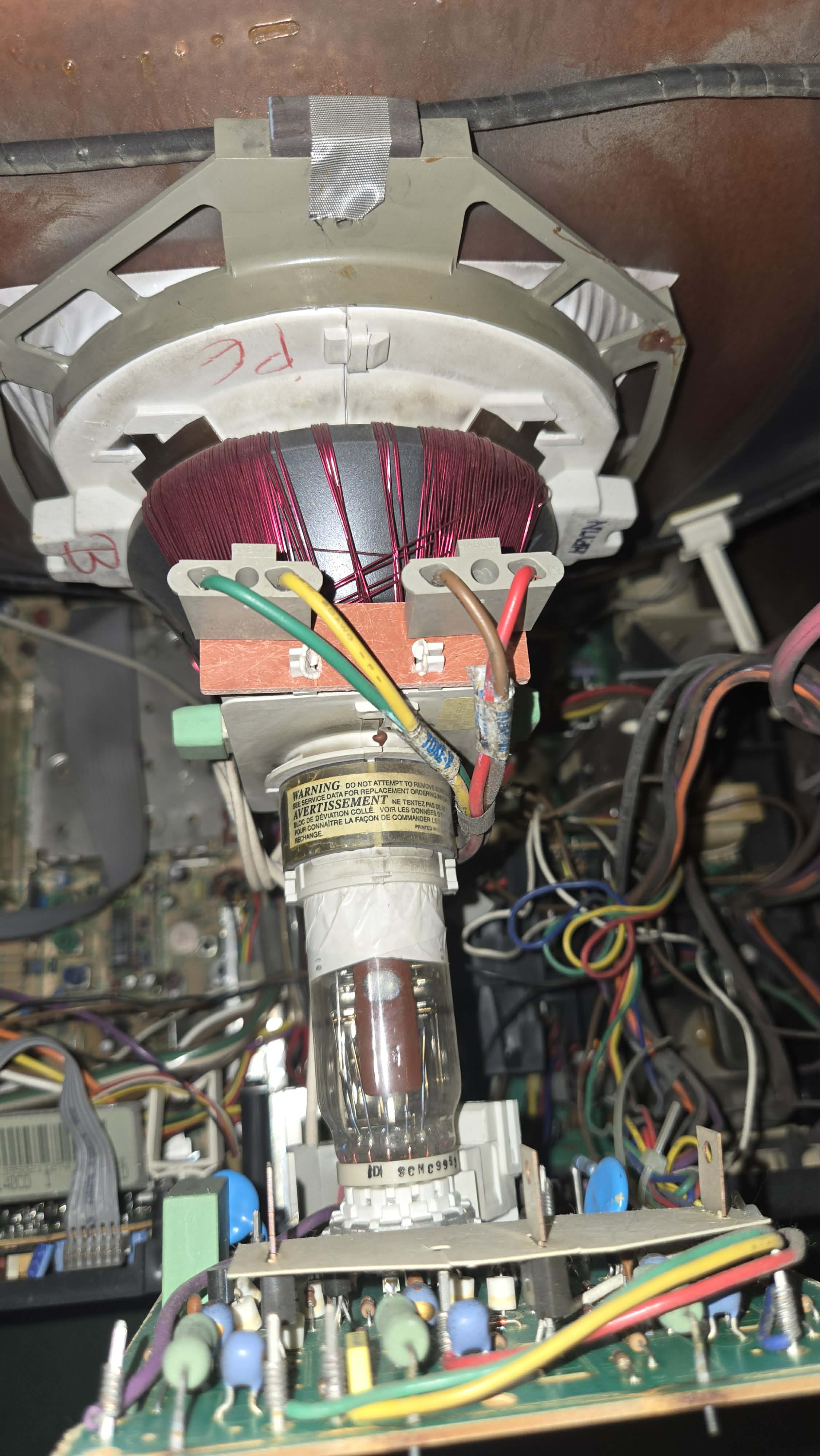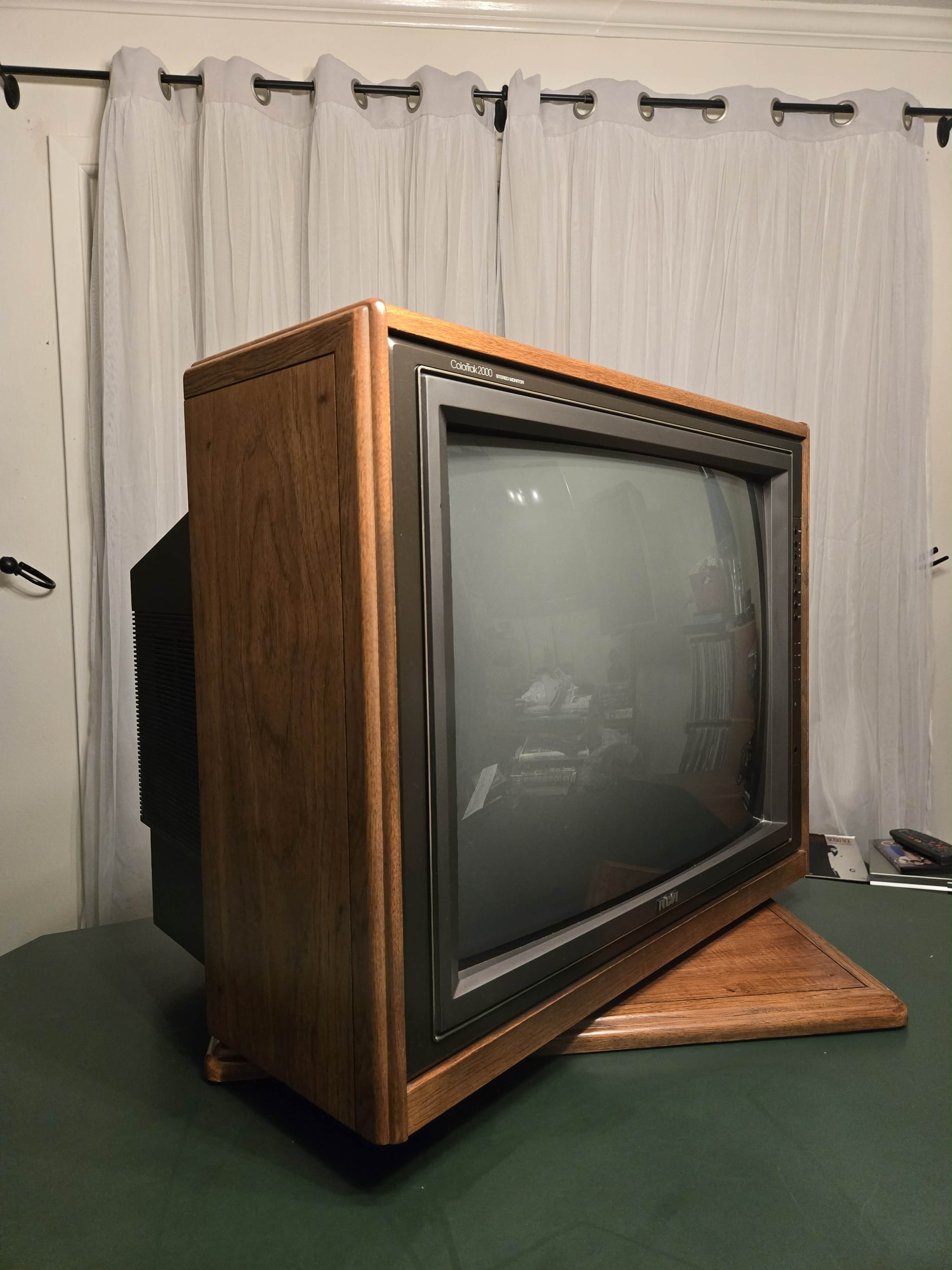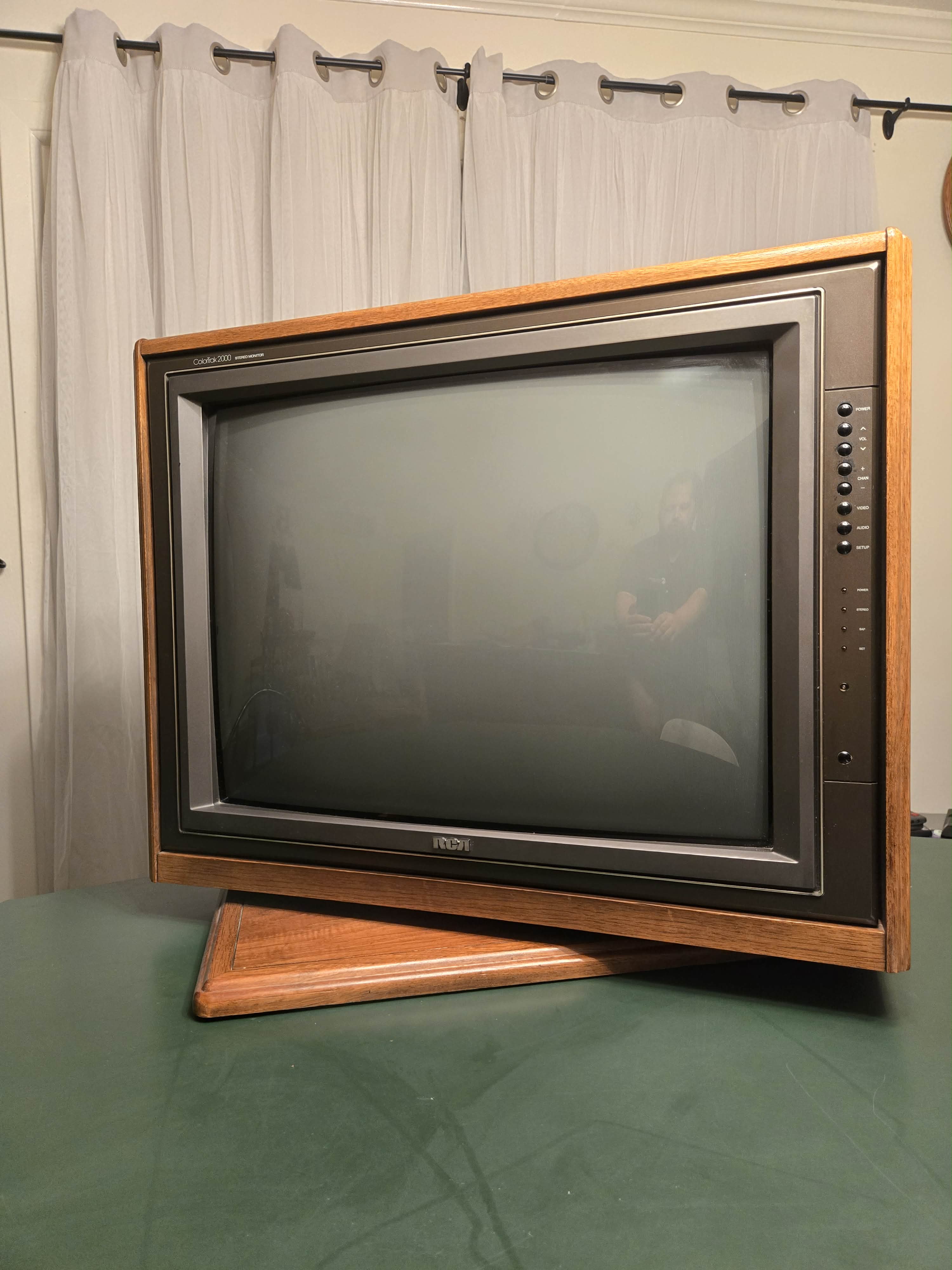 27" console TV by RCA, made in the USA in 1989. Has multiple RF, composite and s-video inputs with stereo sound, as well as speaker outputs.