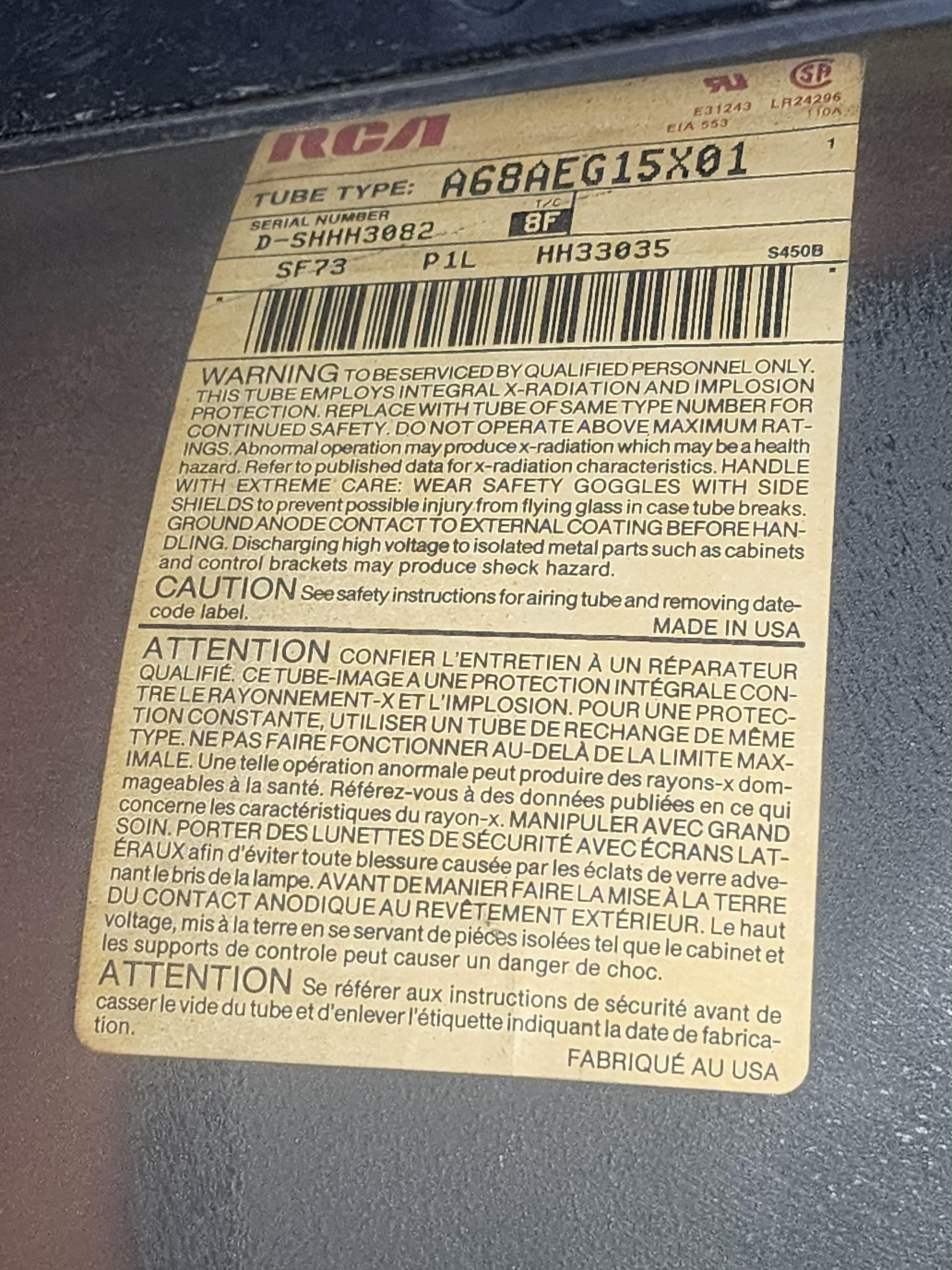 | Tube: | Thomson , RCA , A68AEG15X01 , A68AEG15X |