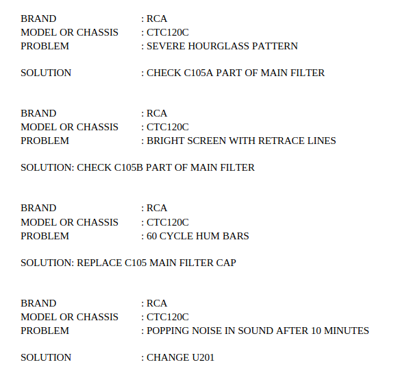 - Troubleshooting RCA CTC120 Sweep Circuits p. 12 - Guide to repairing various sweep related symptoms including dead set