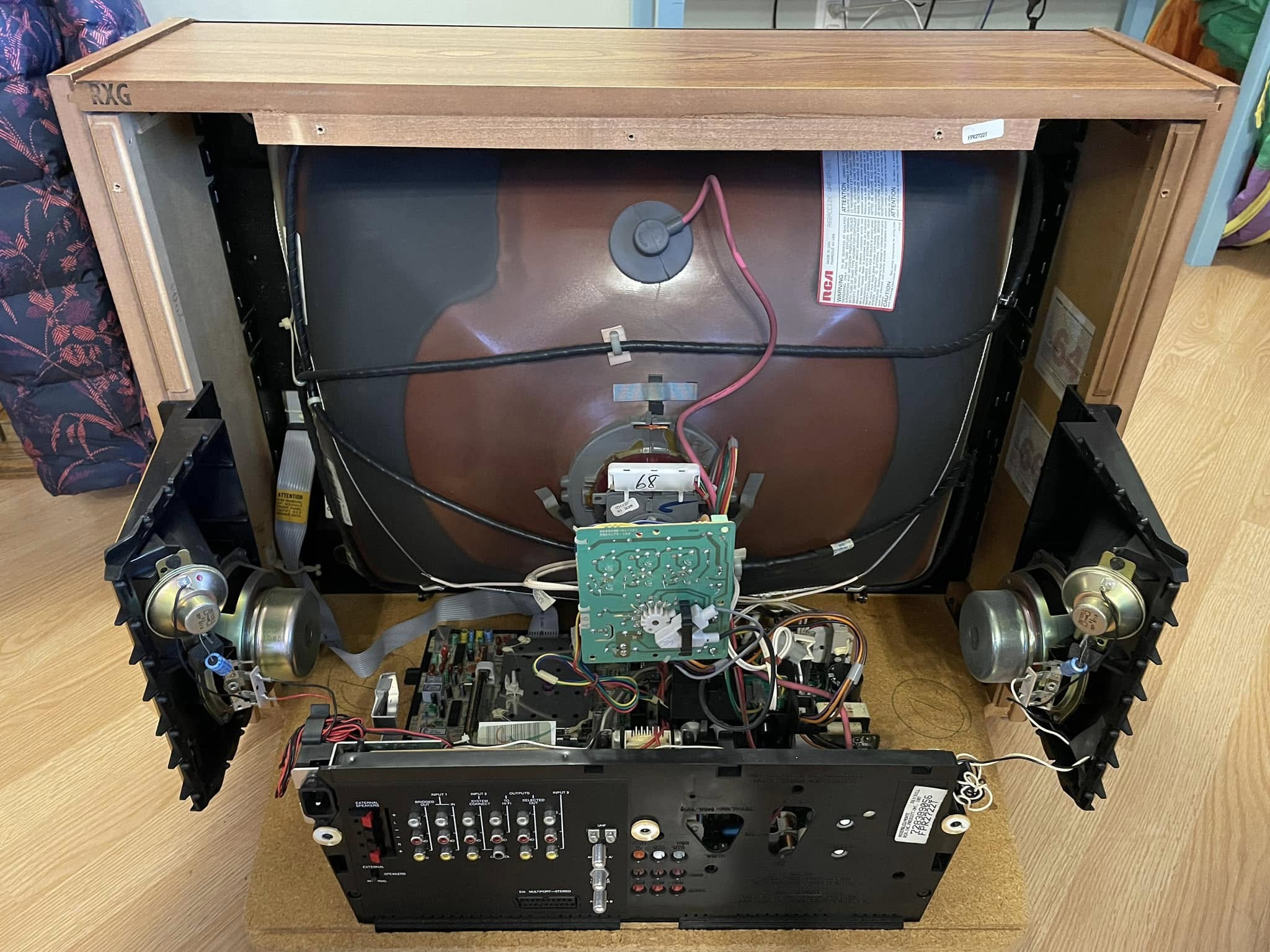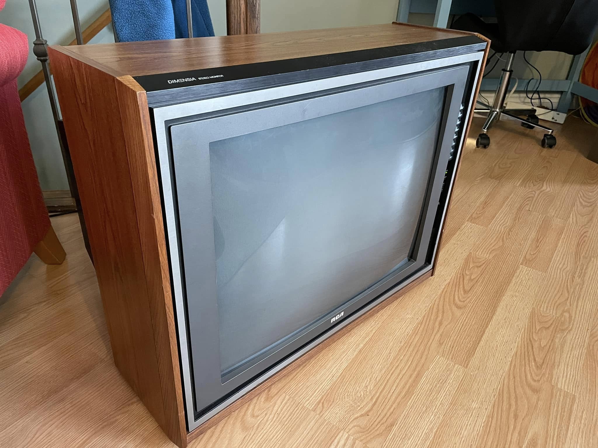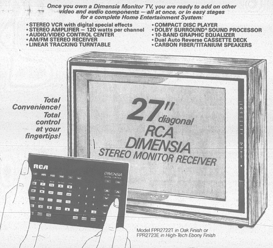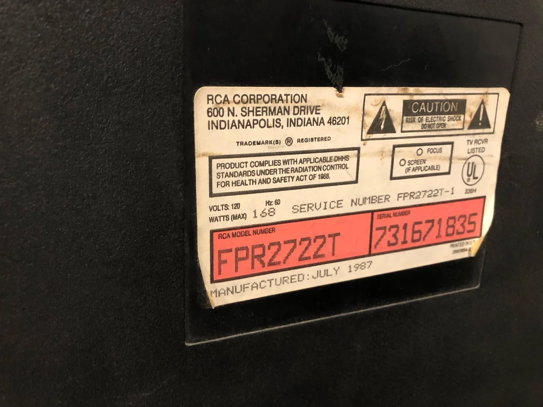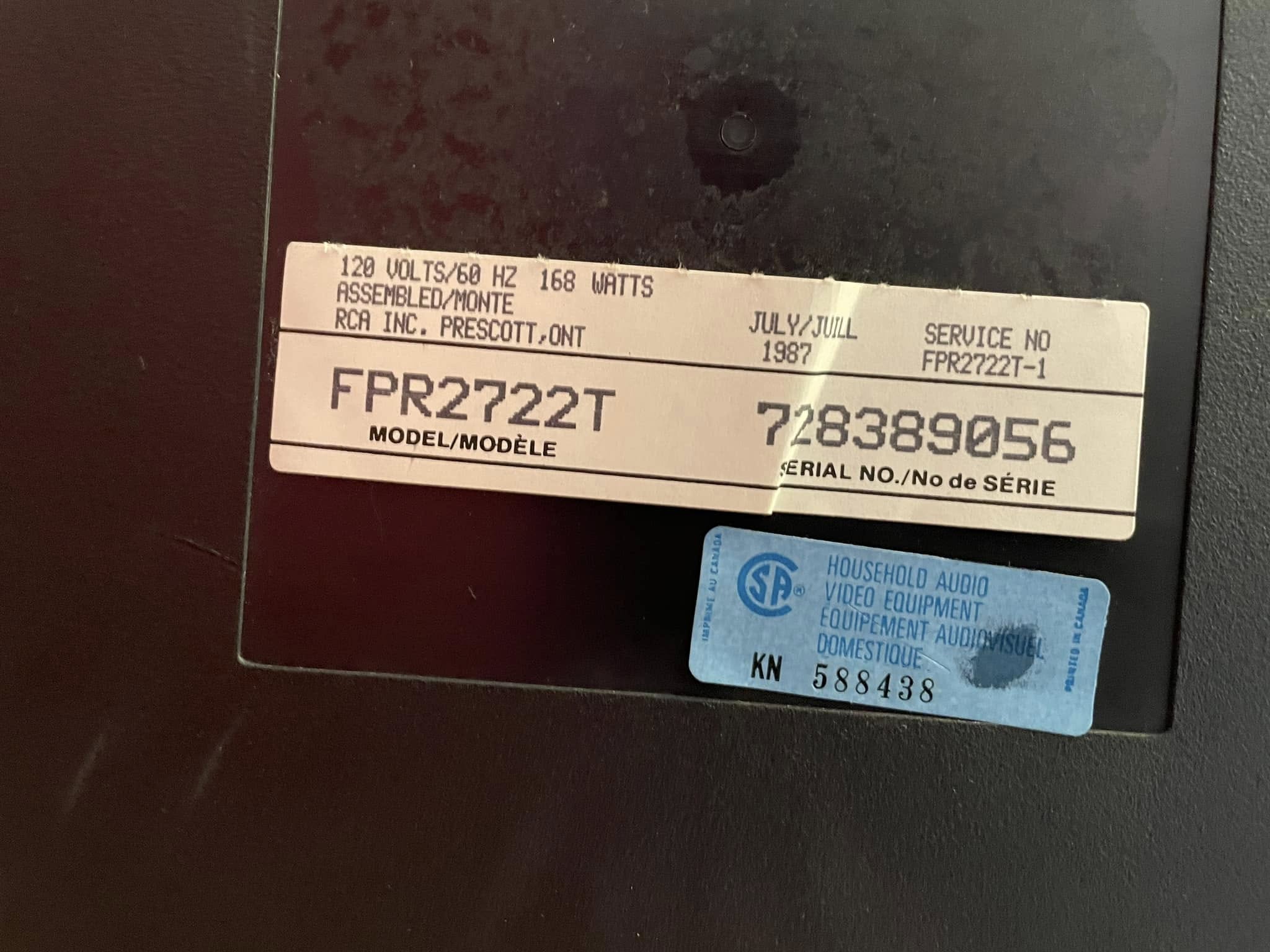 Higher-end 27" CRT by RCA. Part of their Dimensia line which were made to be integrated in a home theater system. Has RF, composite, and a MultiPort. This model is in a wooden case and has an oak finish, whereas its sister model, FPR2723E, has an ebony finish. This set was made in the USA in 1987, shortly before the buyout by Thomson was finalized.