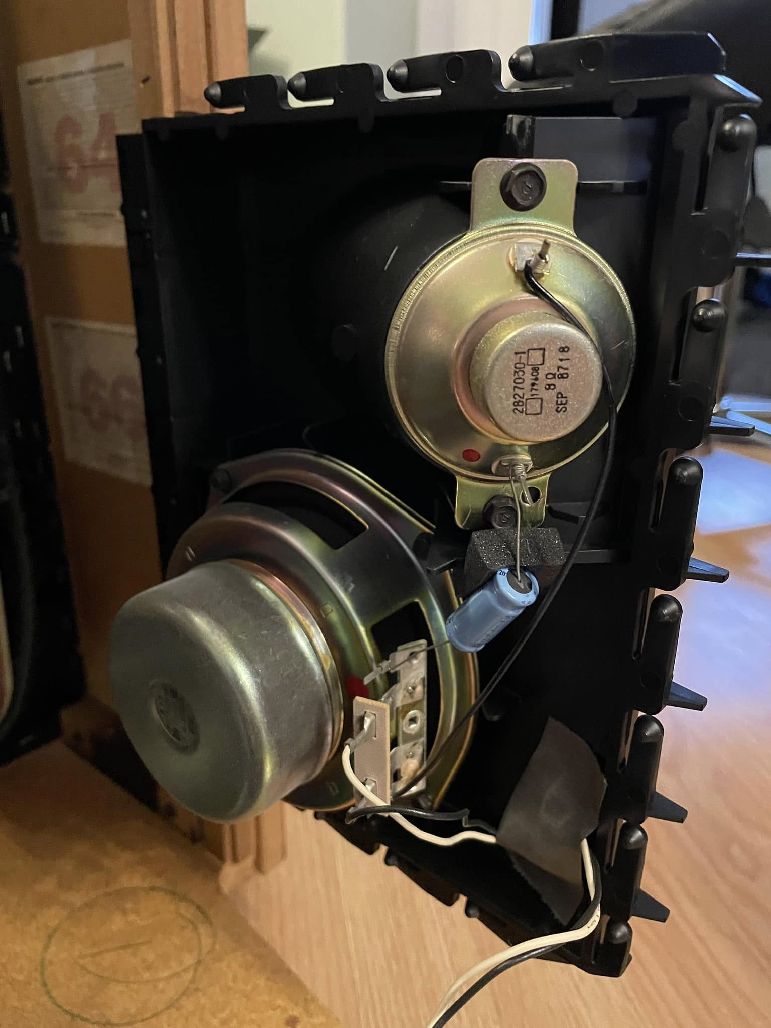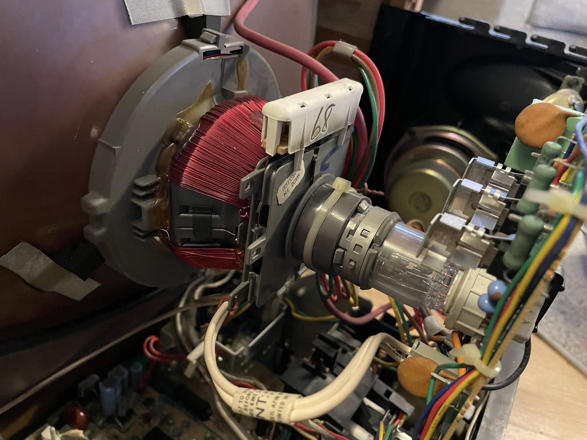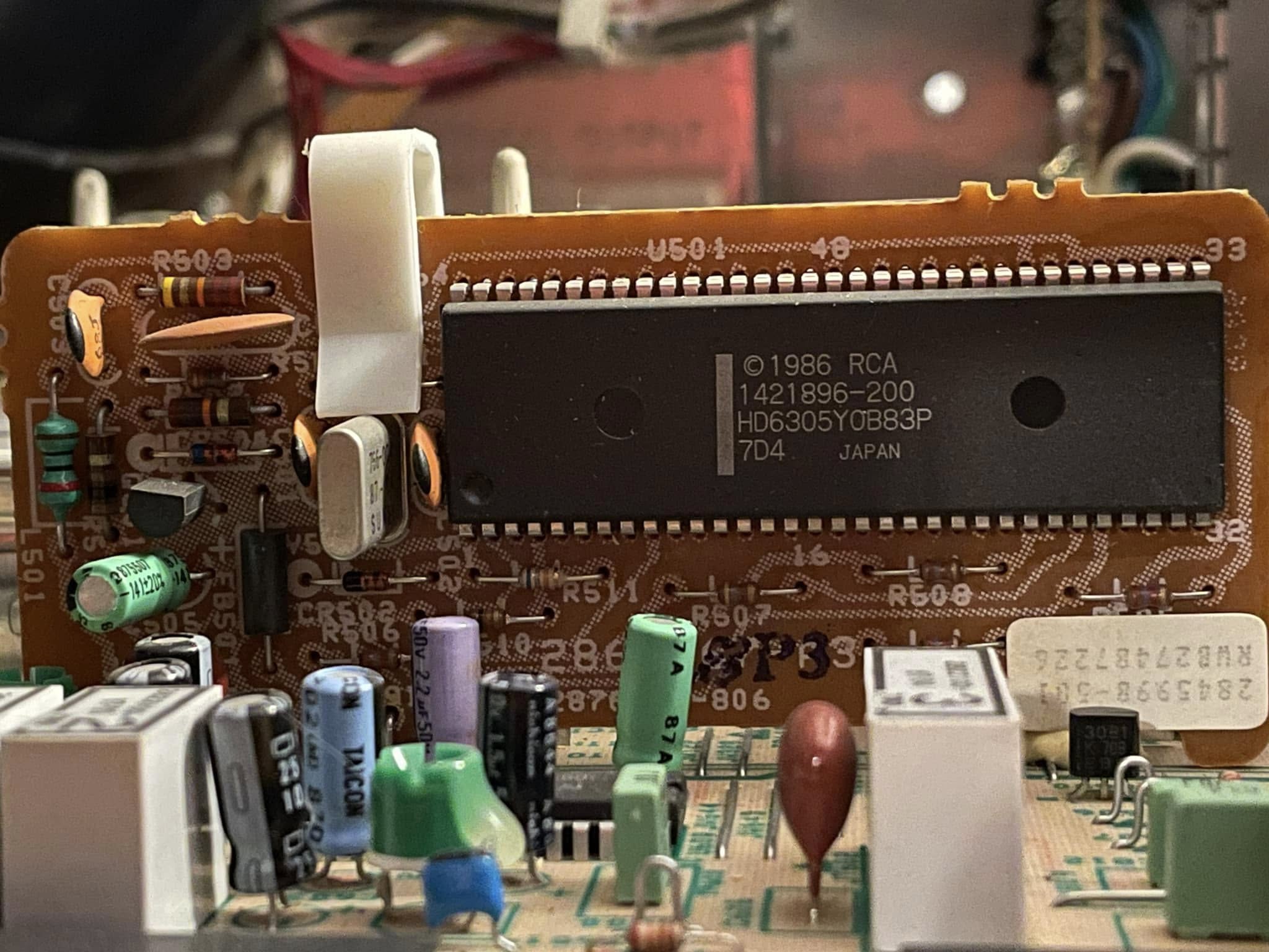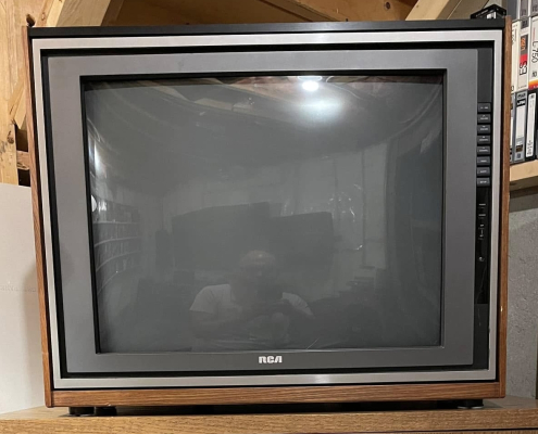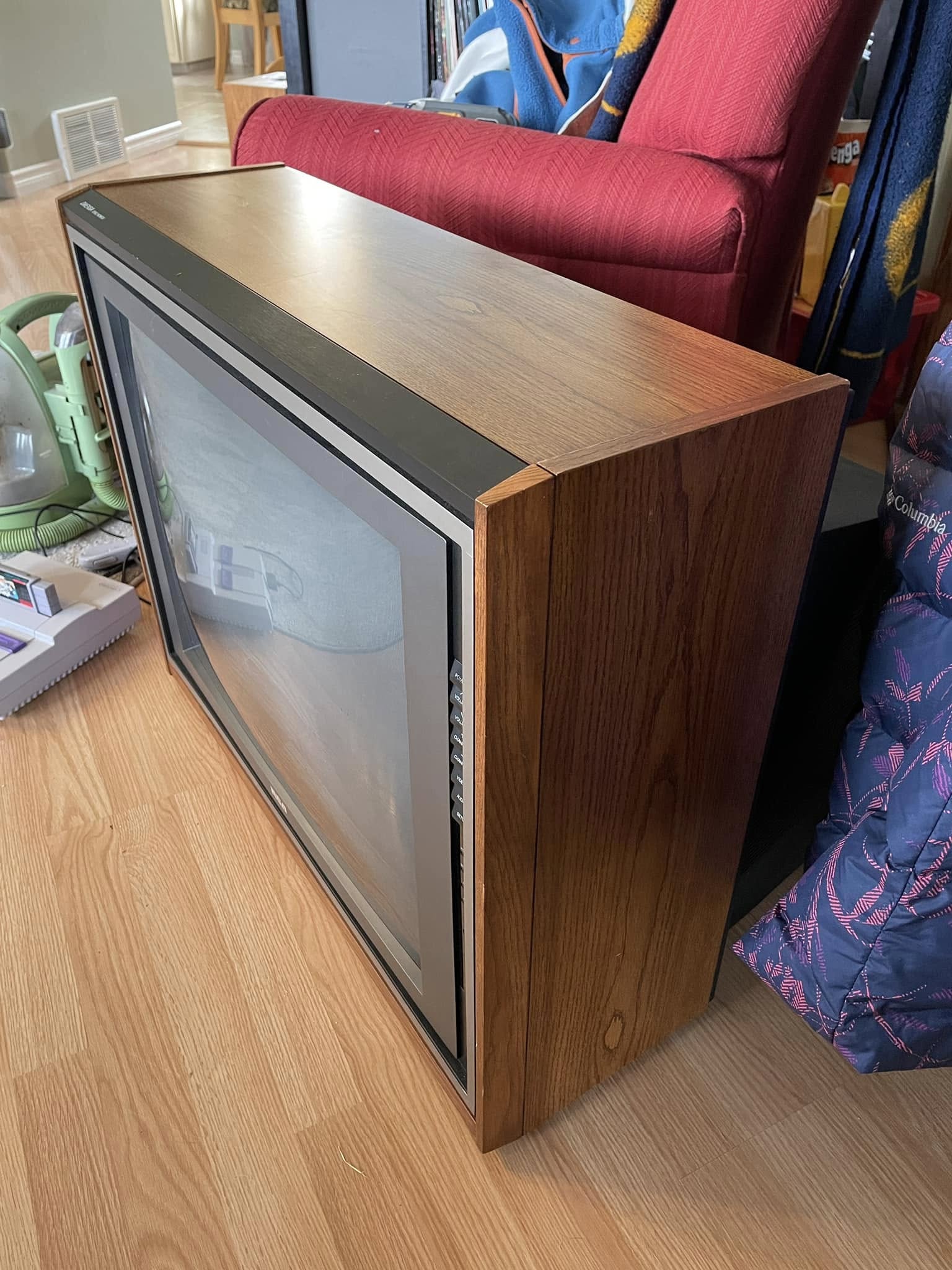 Higher-end 27" CRT by RCA. Part of their Dimensia line which were made to be integrated in a home theater system. Has RF, composite, and a MultiPort. This model is in a wooden case and has an oak finish, whereas its sister model, FPR2723E, has an ebony finish. This set was made in the USA in 1987, shortly before the buyout by Thomson was finalized.