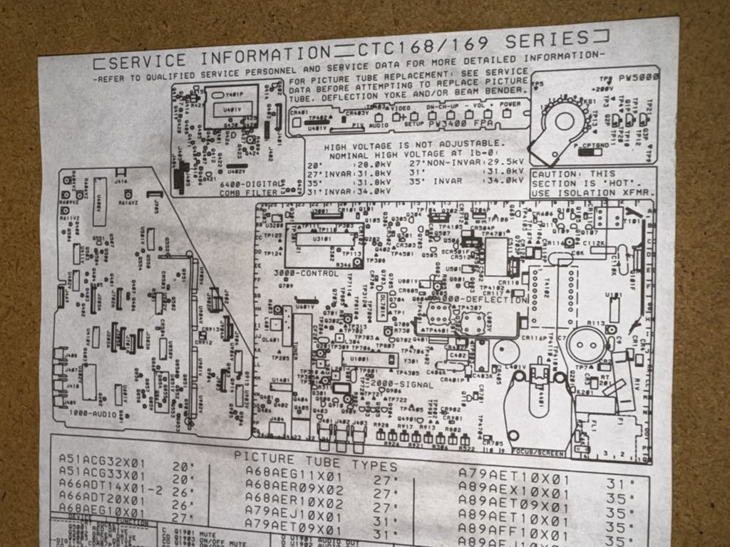 High-end 35" console TV by RCA, made at their Bloomington plant in 1993. Uses Thomson's CTC169 chassis; has RF, composite, and s-video inputs, as well as stereo audio inputs and outputs.