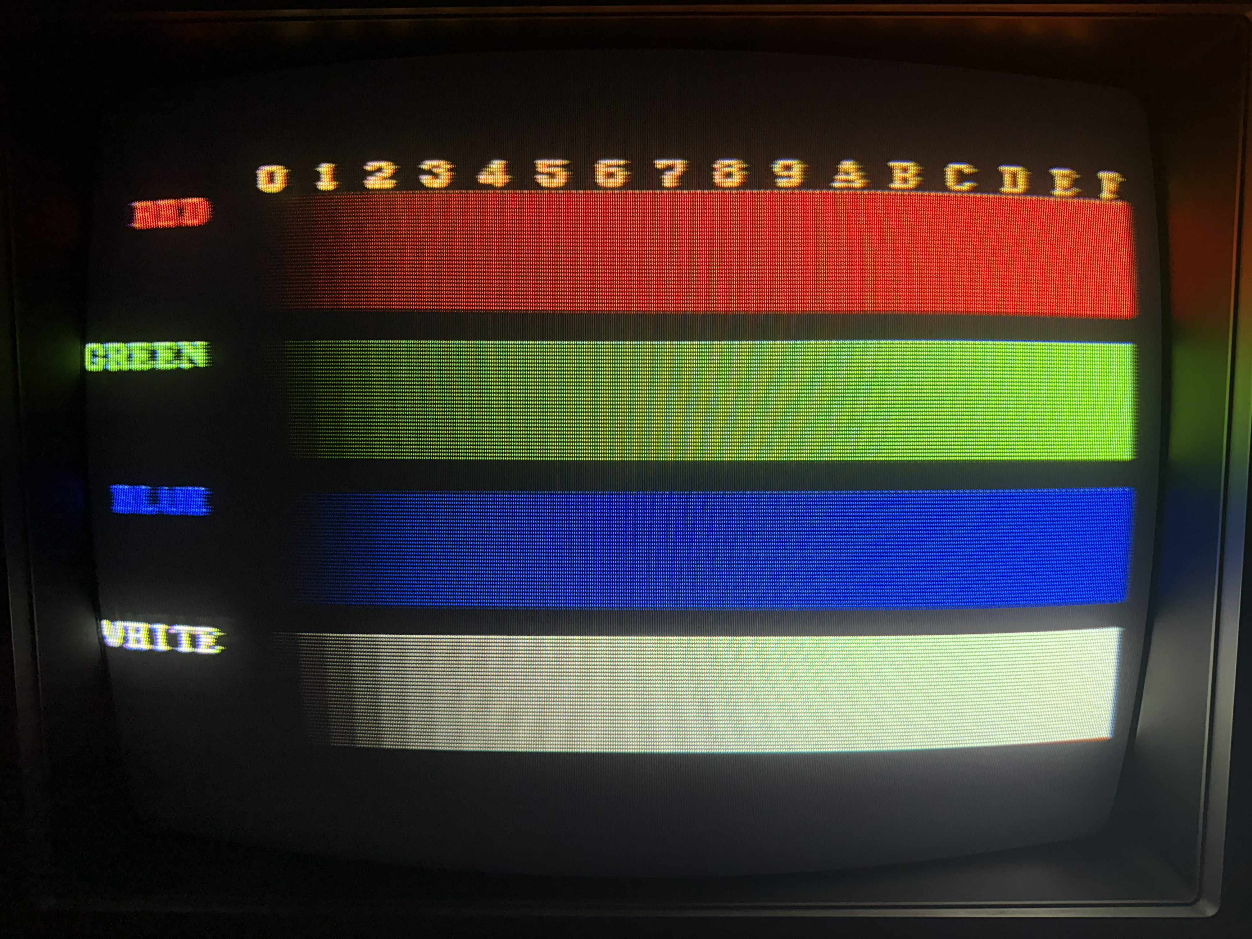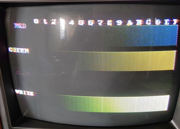 The RGB inputs are CGA signal over BNC connections, and only computers like the Tandy 1000, Commodore 128 and others will work properly on it. In other words, analog RGB will not display correctly, like the example below: