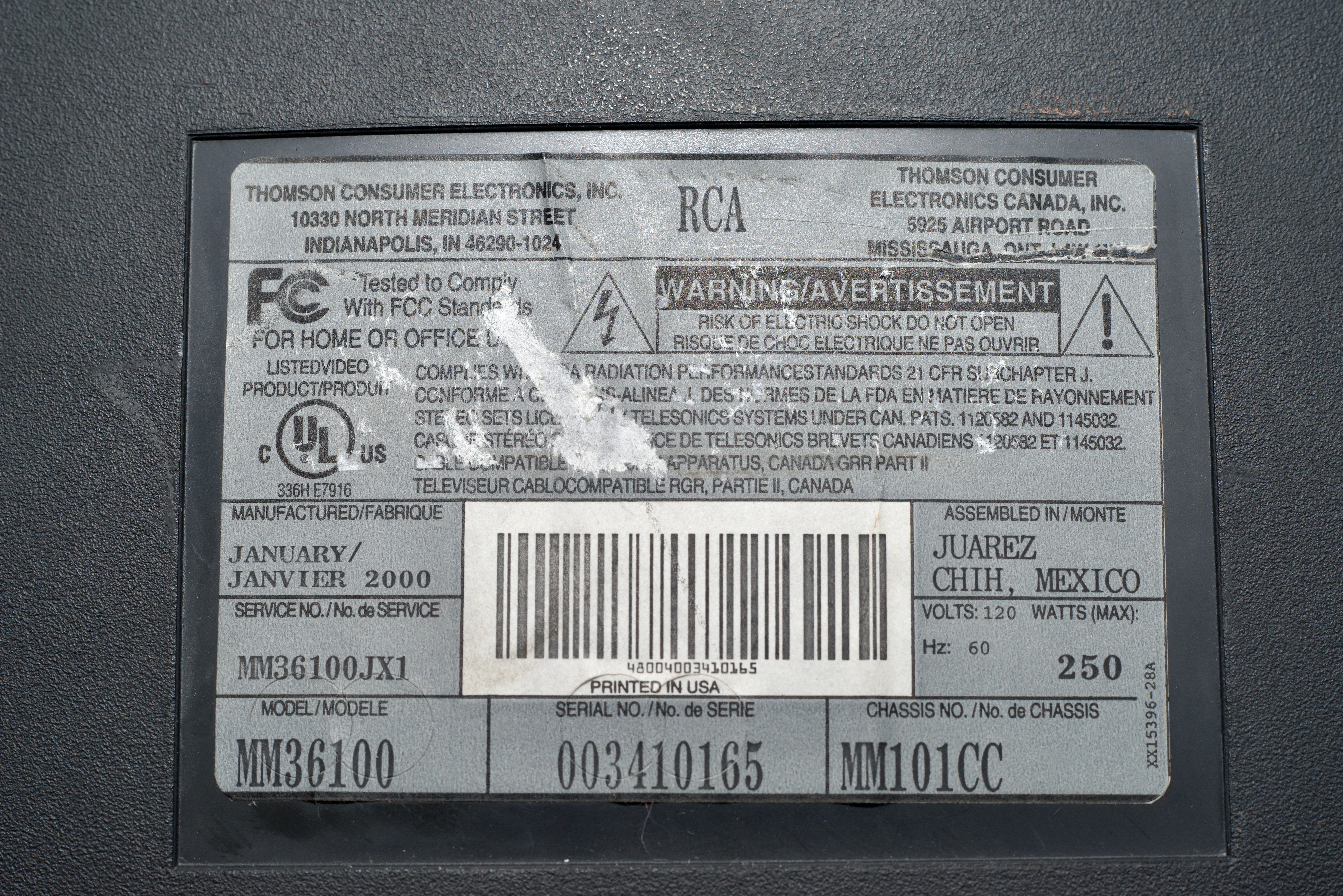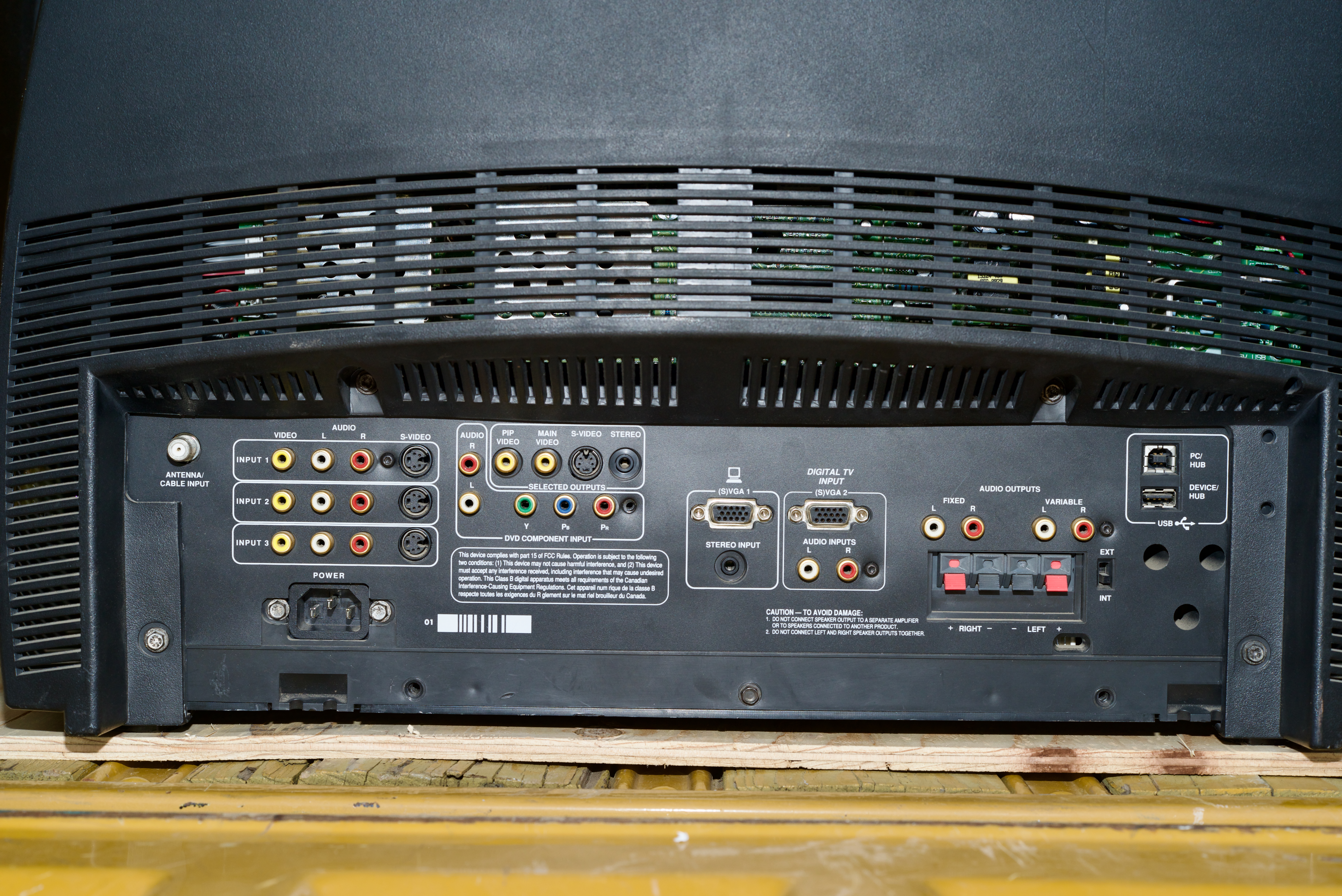 A very high-end CRT by RCA, made by Thomson in Mexico in 1999. This set has RF, composite, s-video, component, and VGA inputs with bassy stereo sound.