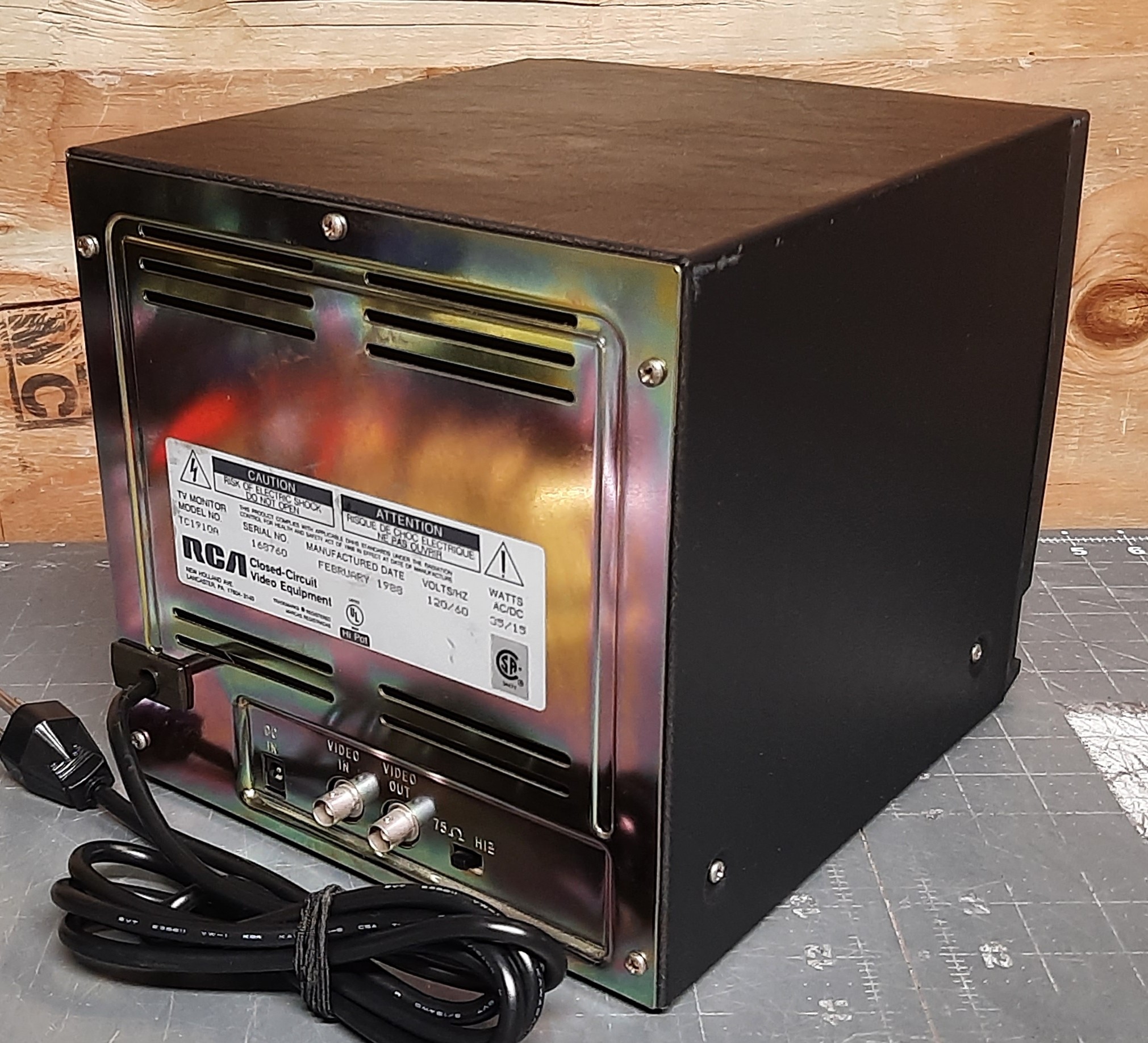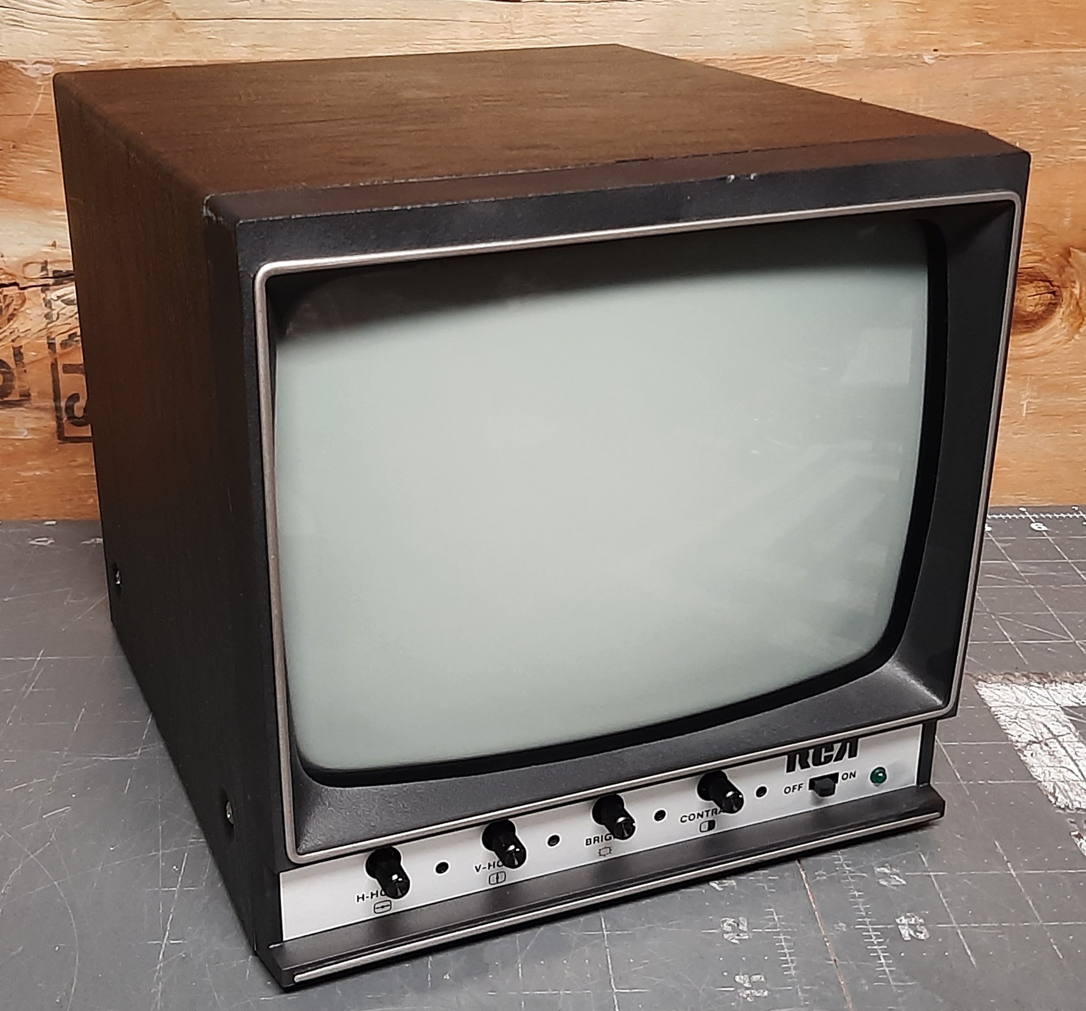 9" black 7 white CCTV monitor with a very sturdy metal frame and case. Among the last products manufactured by RCA before the trademark was sold to Thomson Electronics. As with most monochrome monitors, the picture is very sharp, with this model rated at 700 TVL.