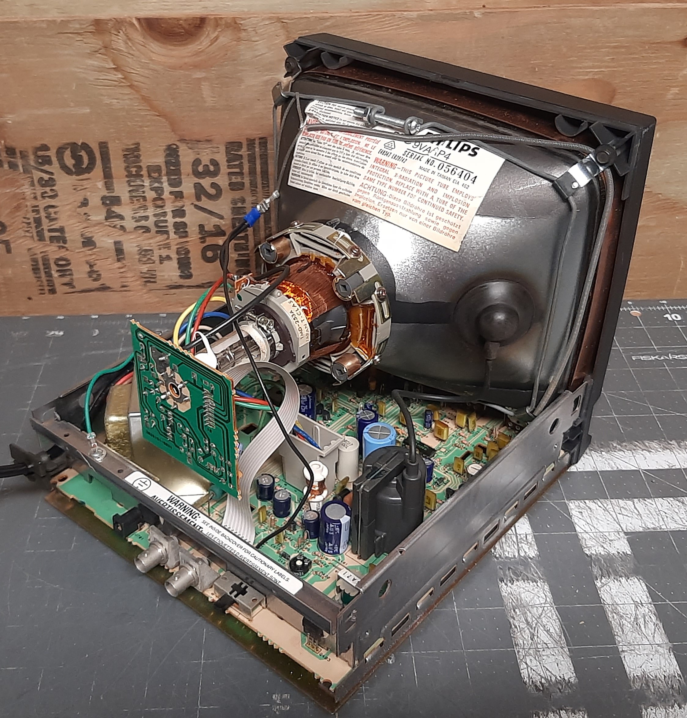 The small holes in the front panel contain adjustment pots for vertical height, vertical linearity, DC restoration, and video equalization.