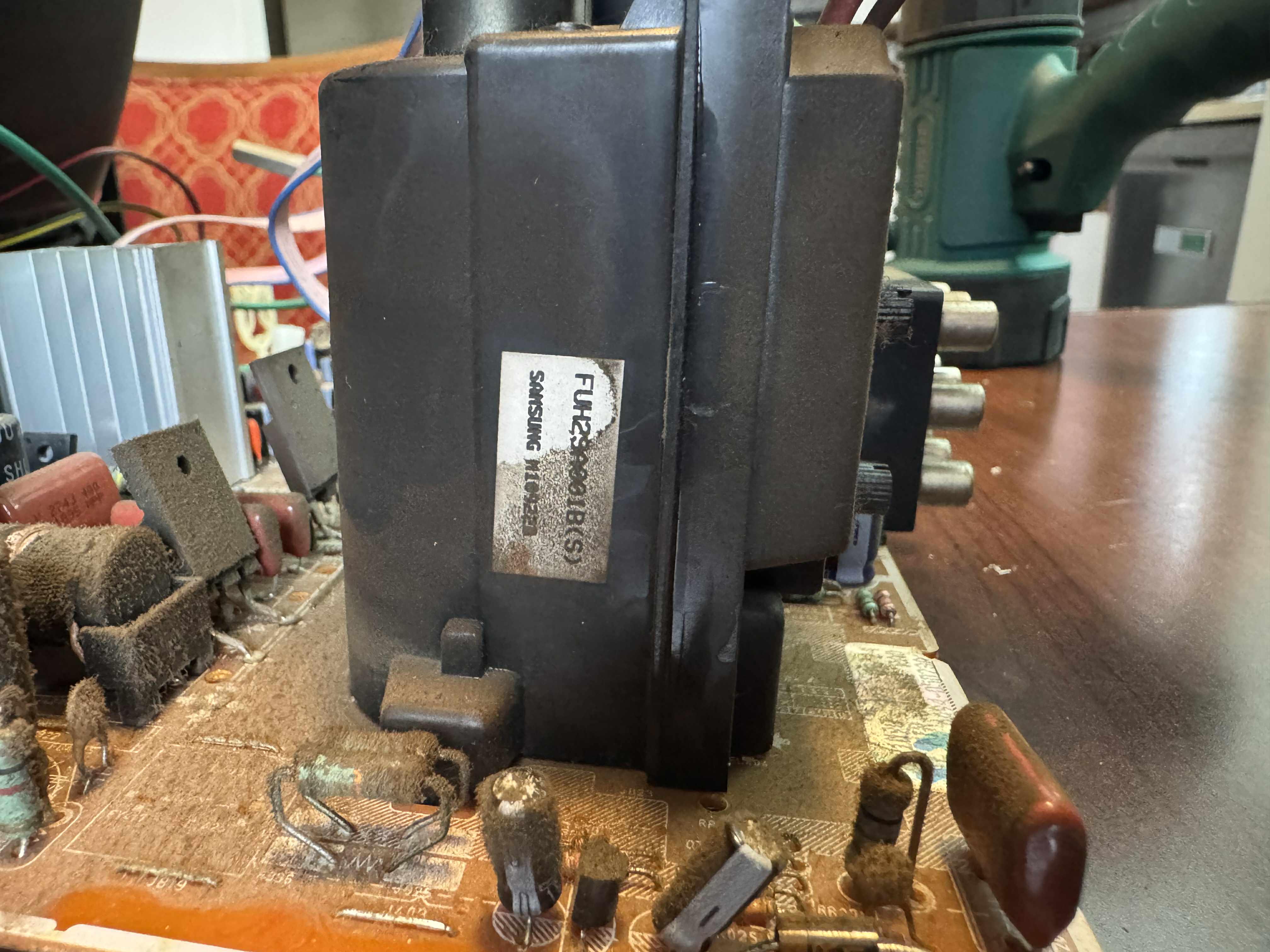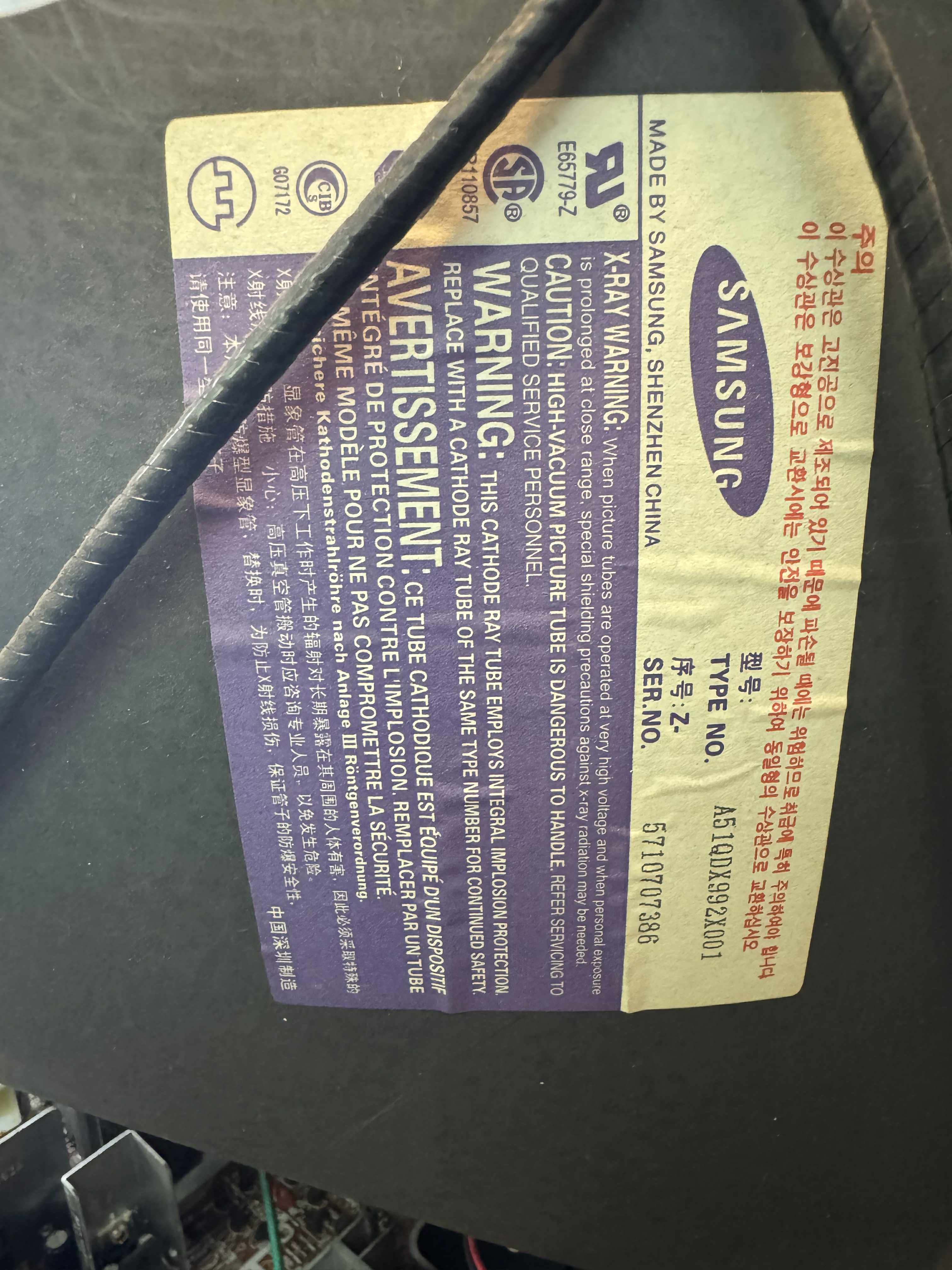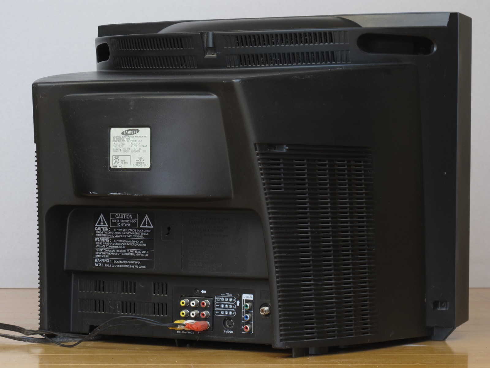 20" DynaFlat CRT by Samsung, made in Mexico in 2001. Has RF, composite, s-video, and component inputs with stereo sound.