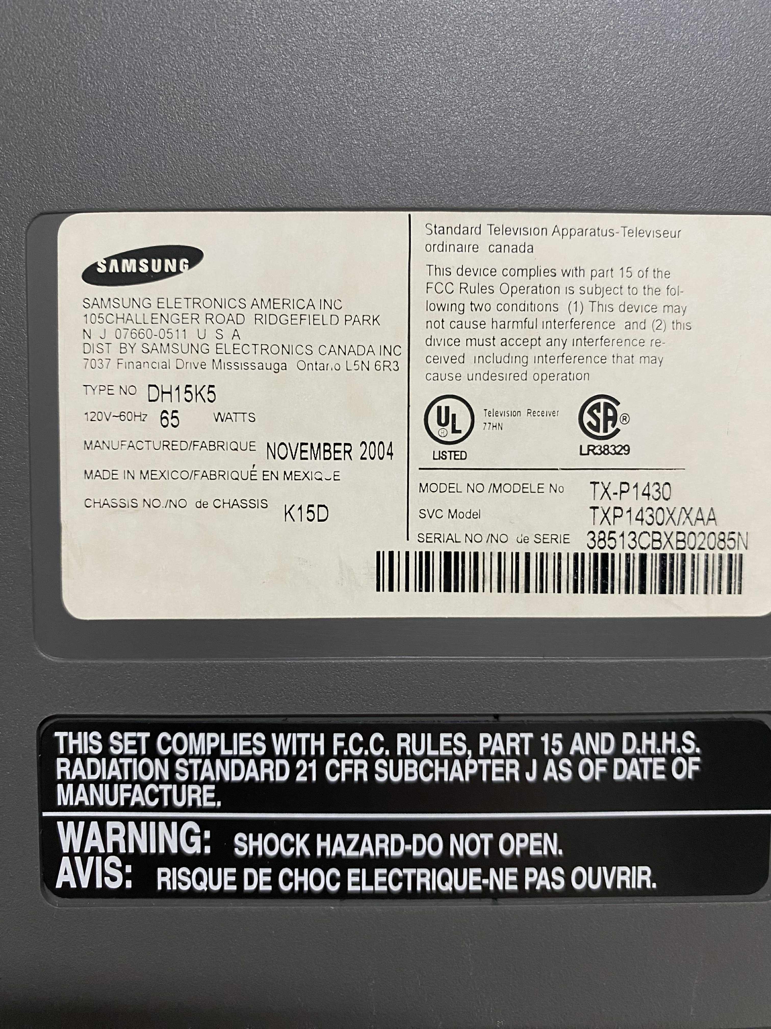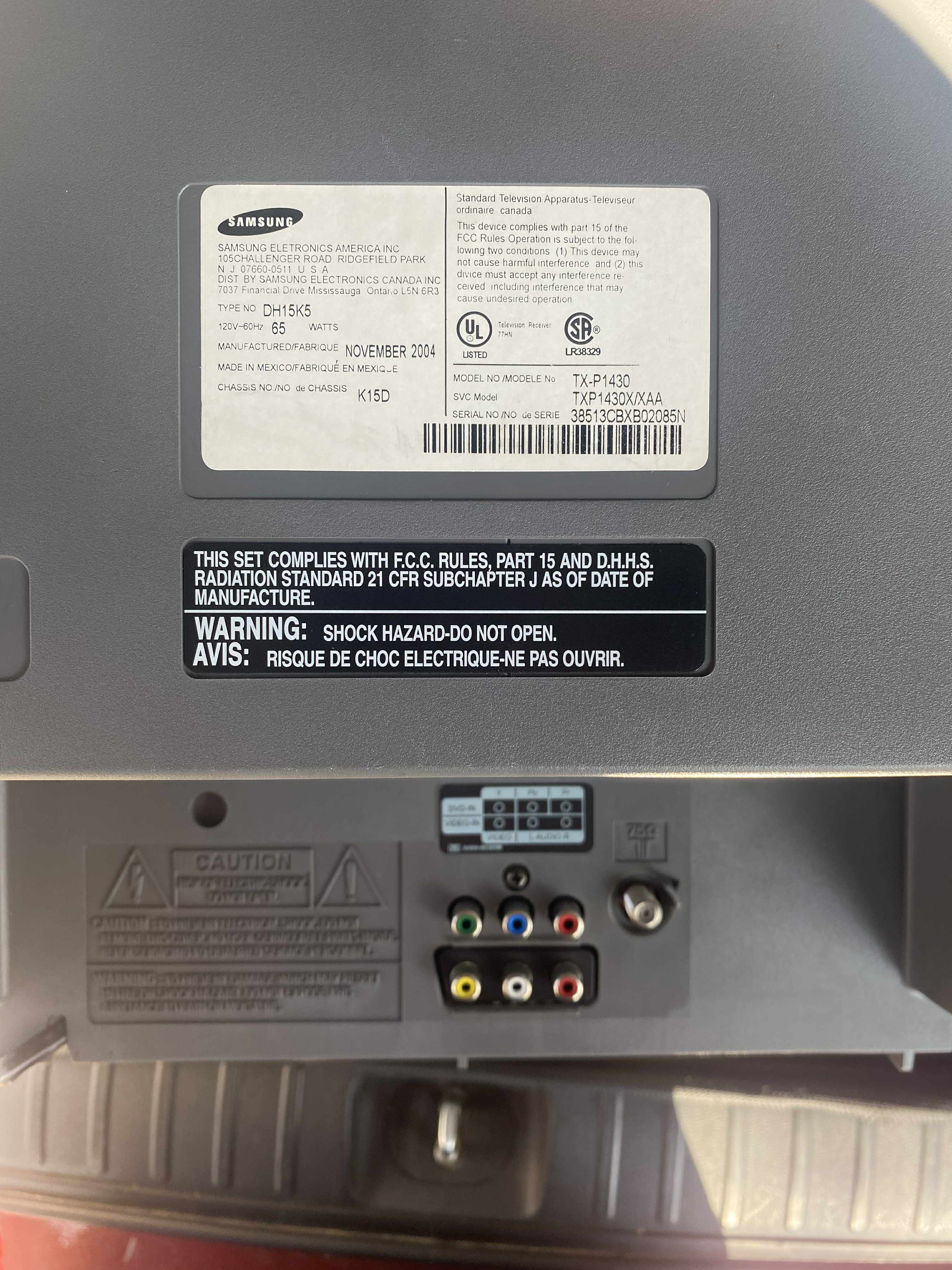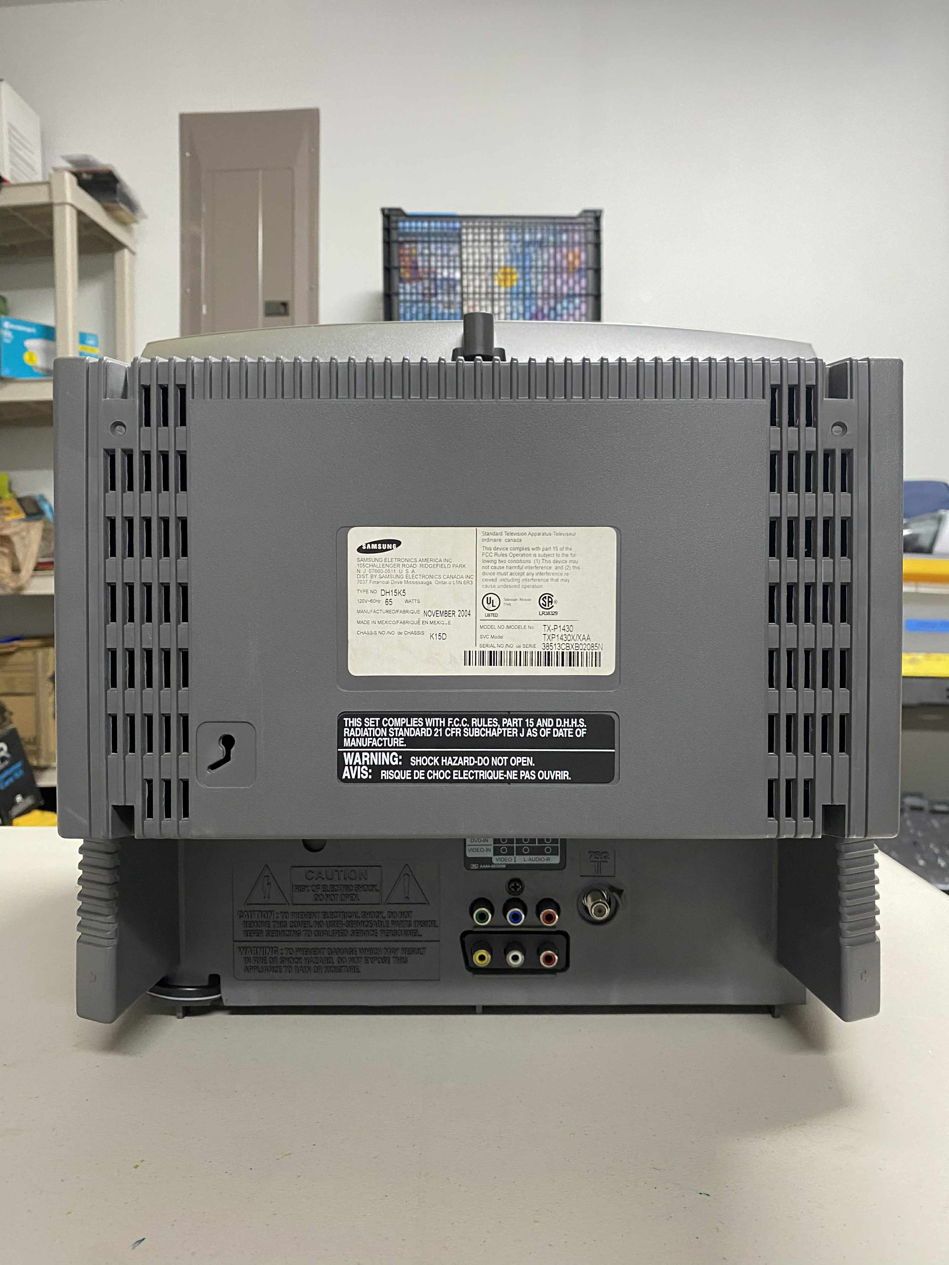 14" Samsung Dynaflat CRT, made in Mexico in 2004. Has RF, composite and component inputs with stereo sound, but lacks s-video.