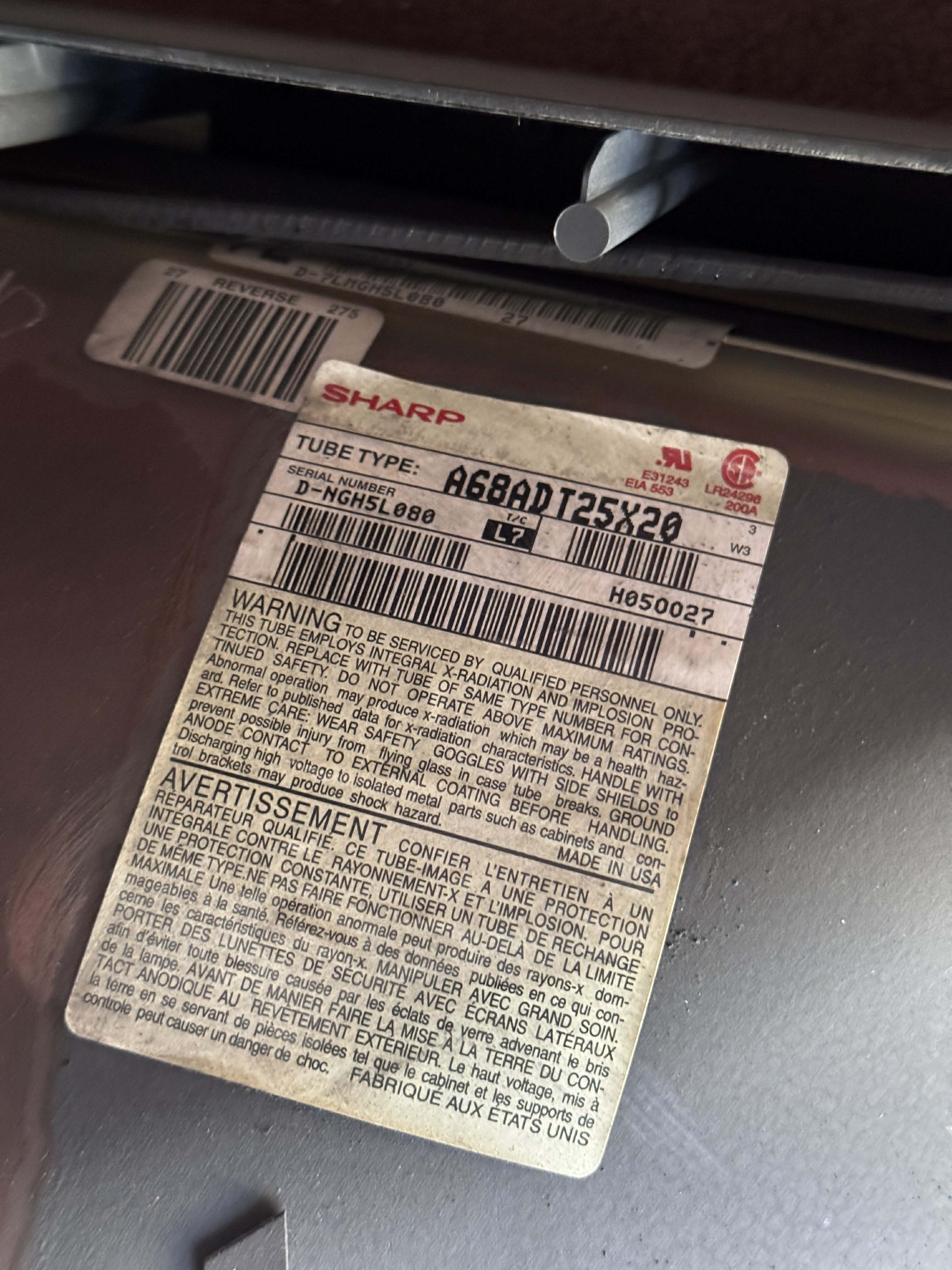 27" CRT by Sharp, made in Mexico in 2003. Has RF, composite, s-video, and component inputs with stereo sound.