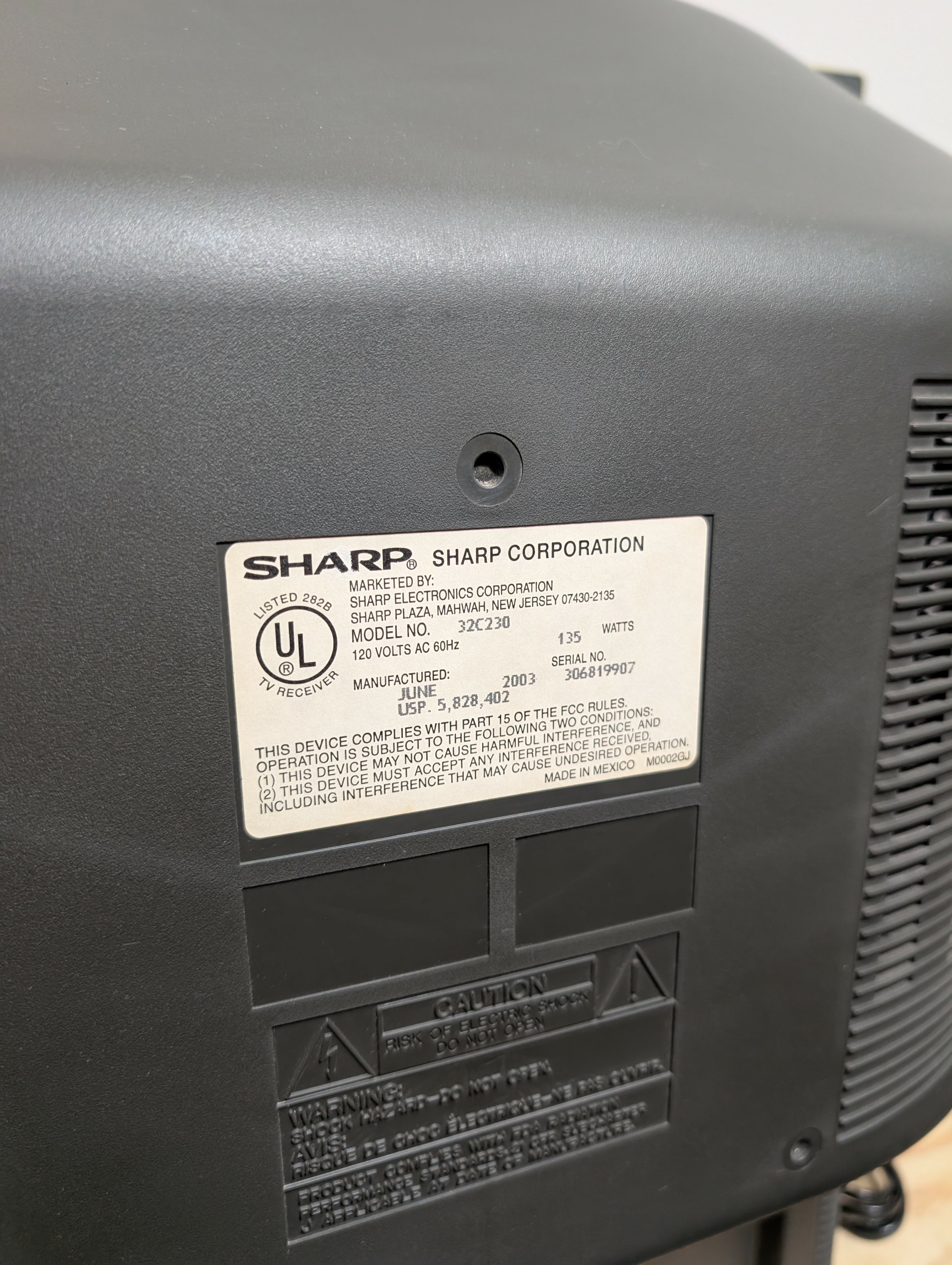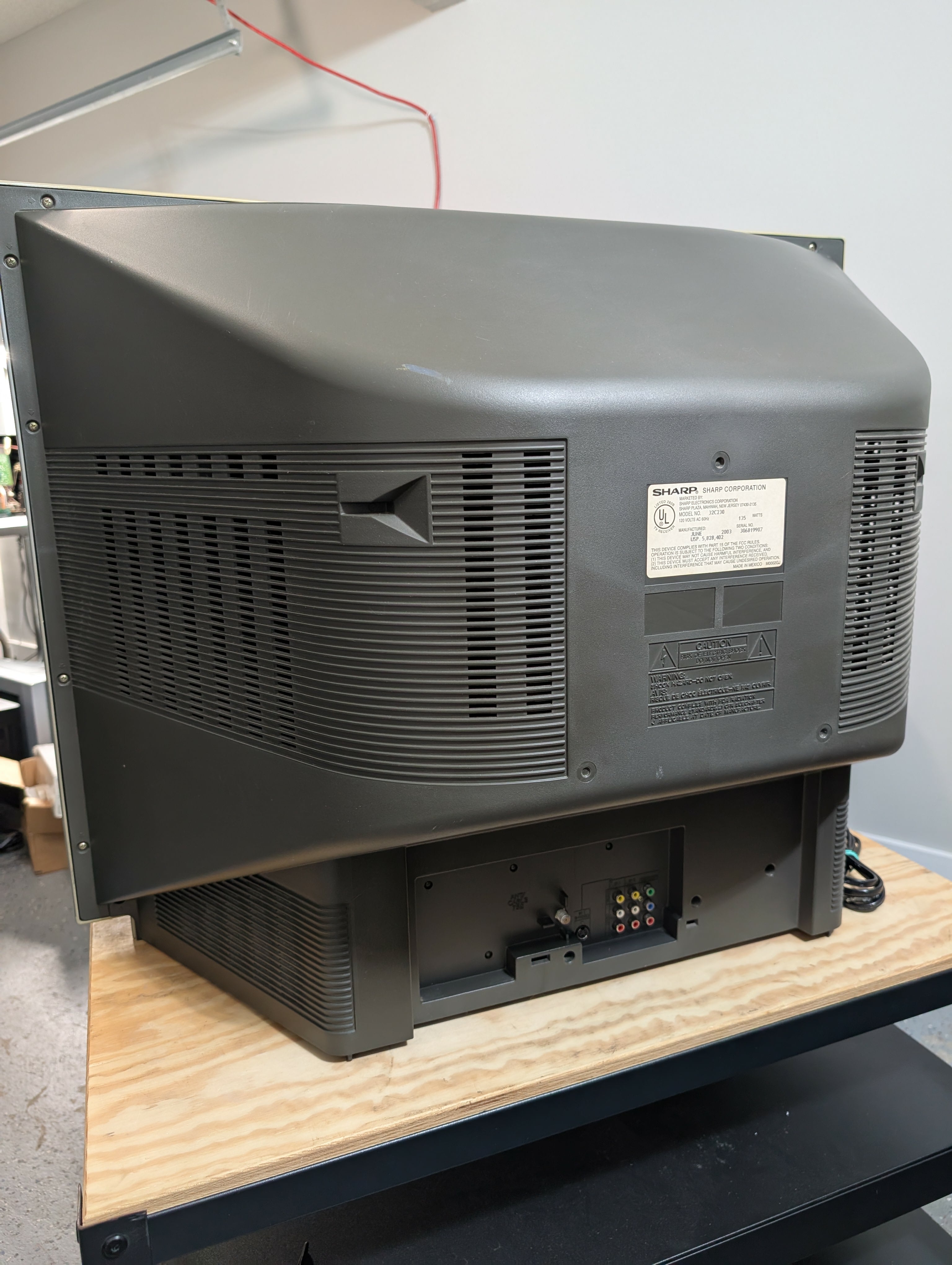 32" curved screen CRT by Sharp, originally manufactured in Mexico in 2003. Has a full set of inputs.