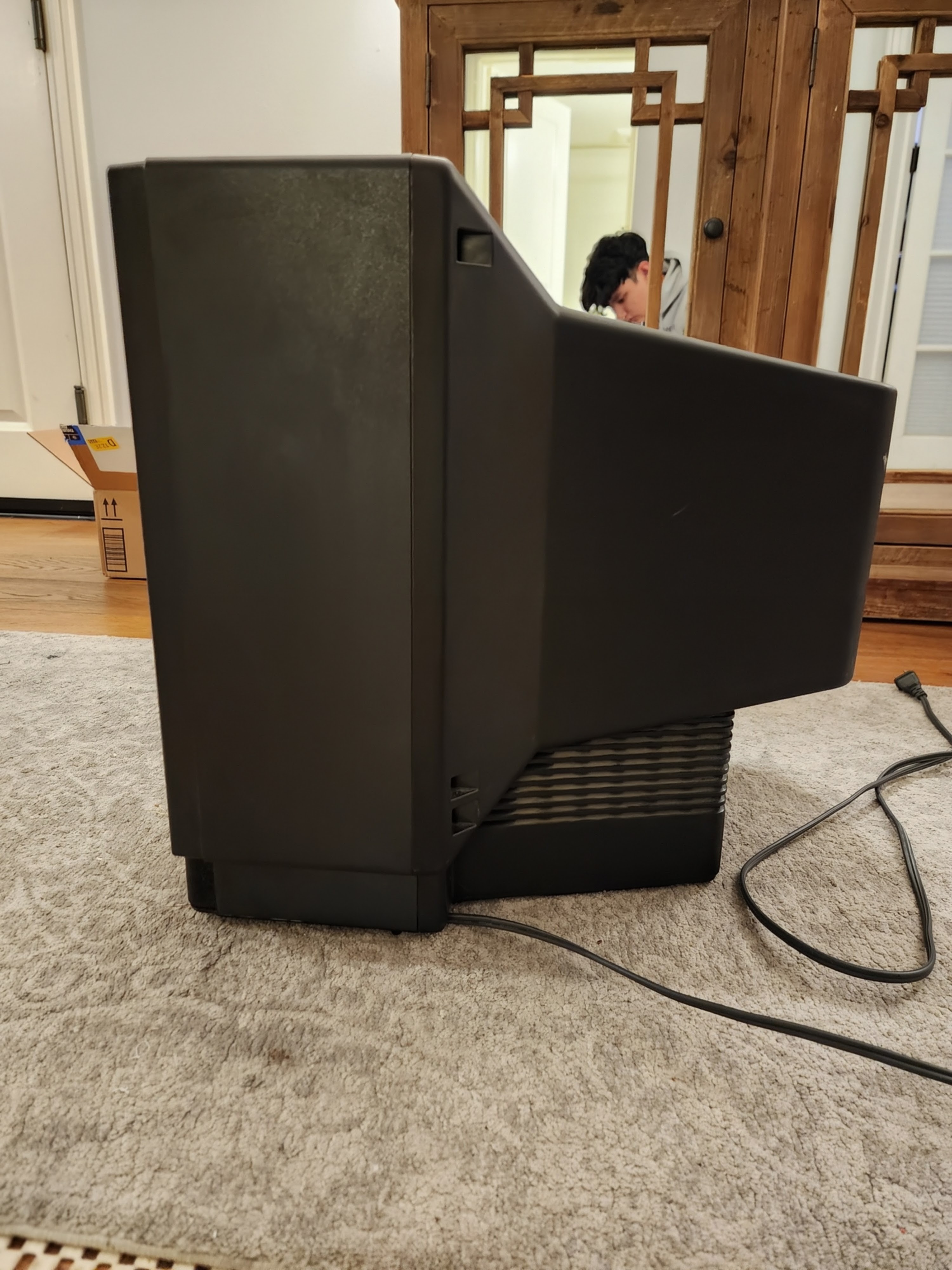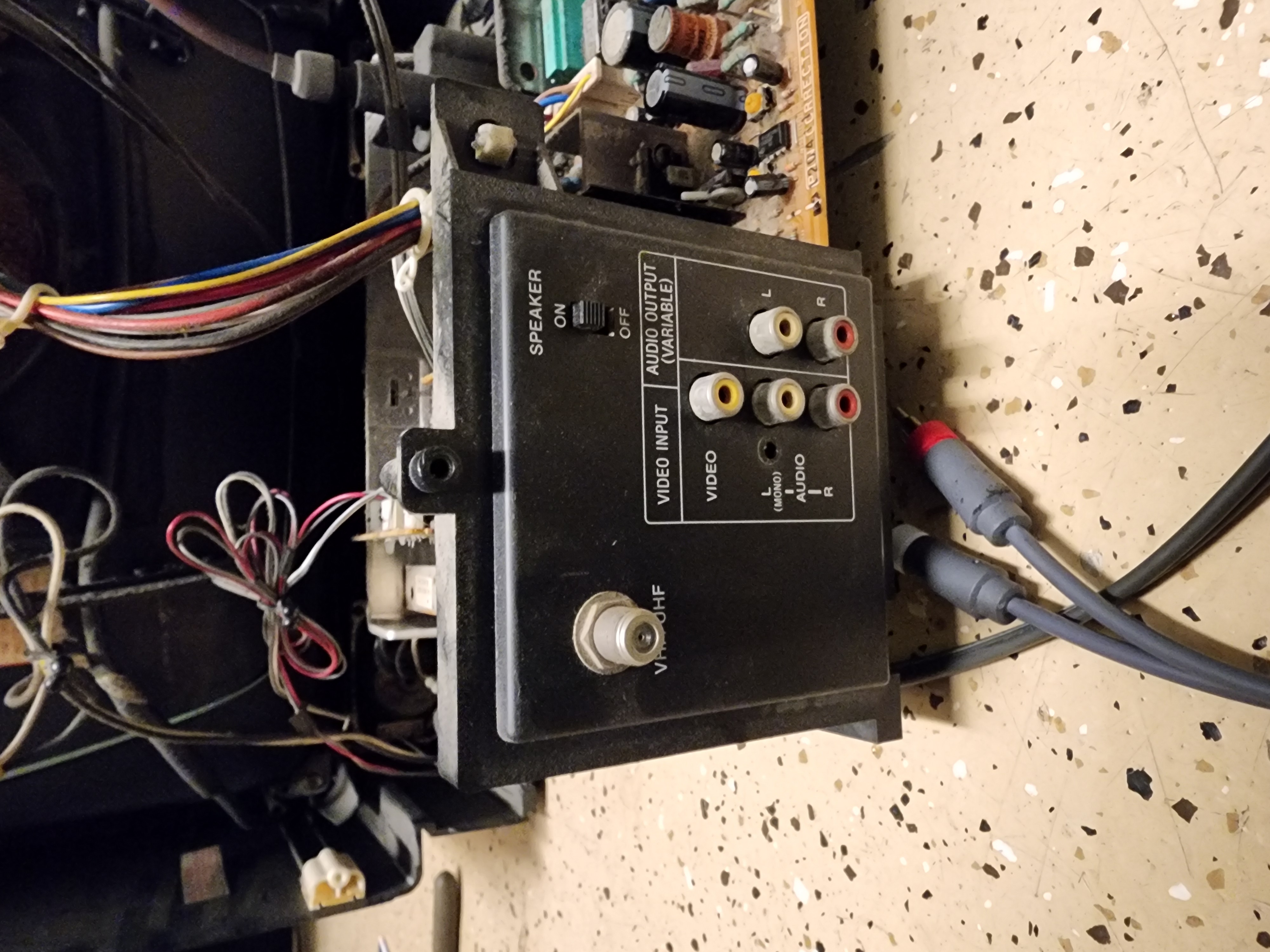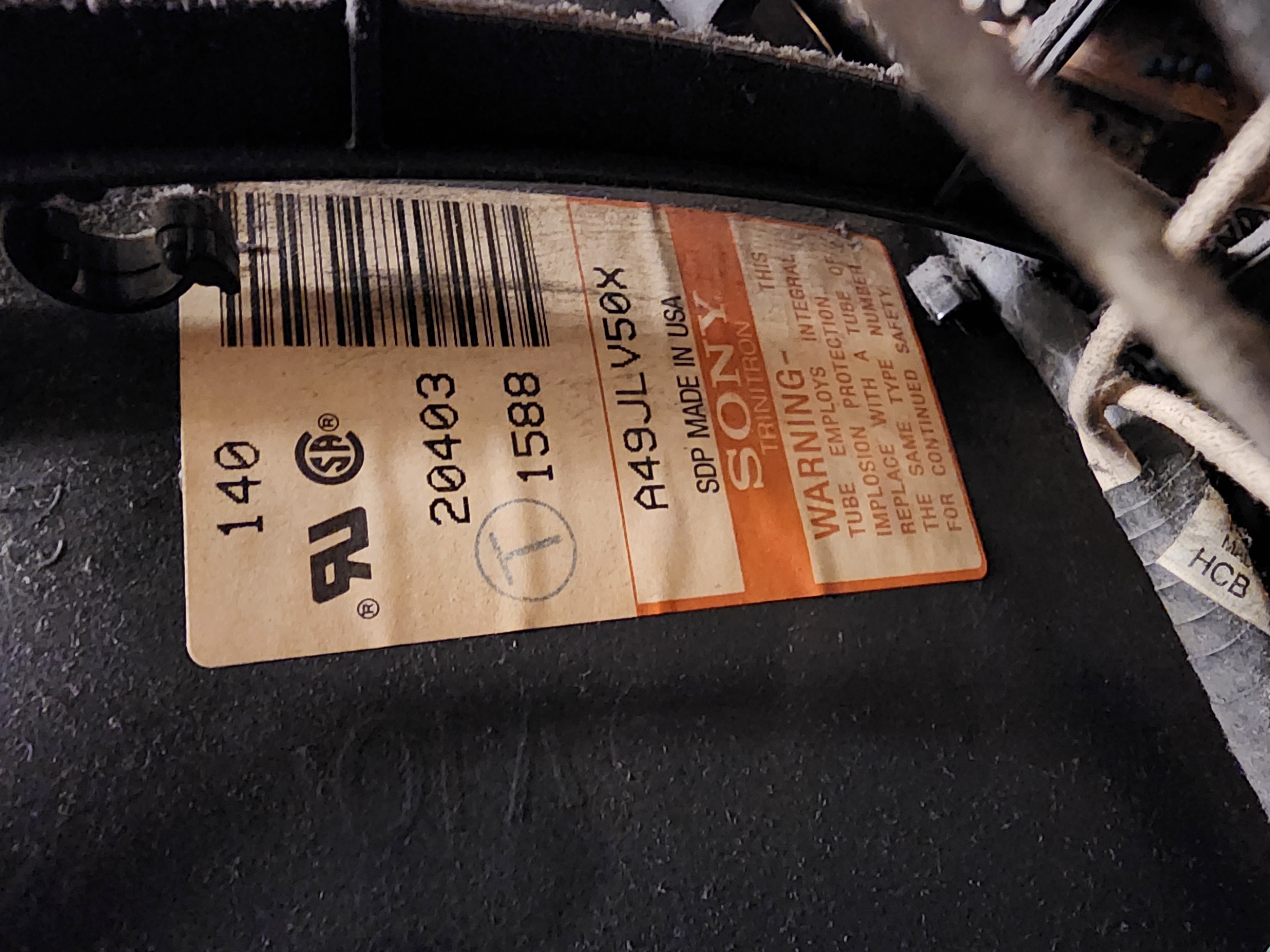 A standard 19" Sony Trinitron TV from 1989. Has 1 composite input with extra Left and Right audio jacks for external stereo. Also has a switch for enabling or disabling built-in speakers.