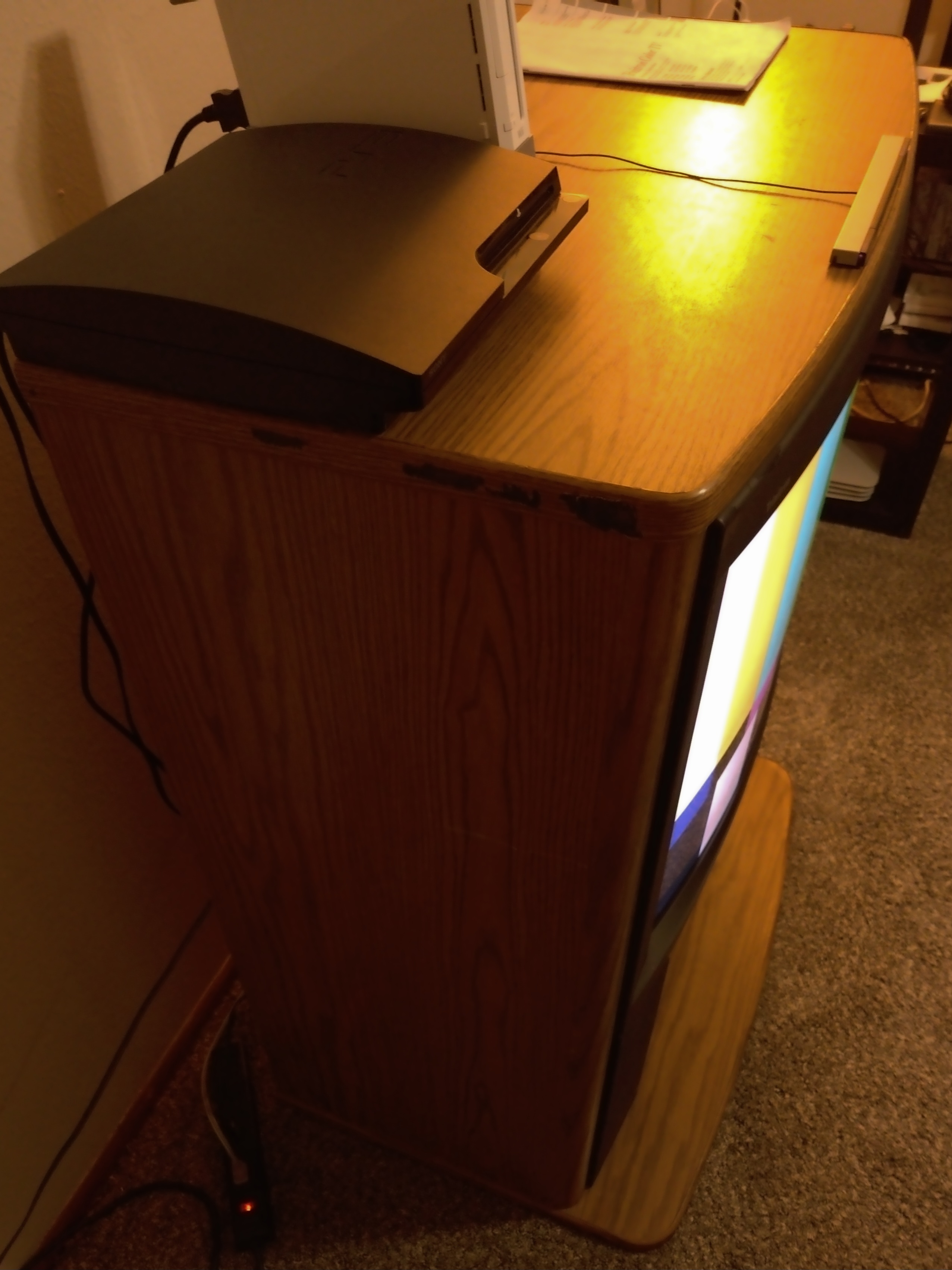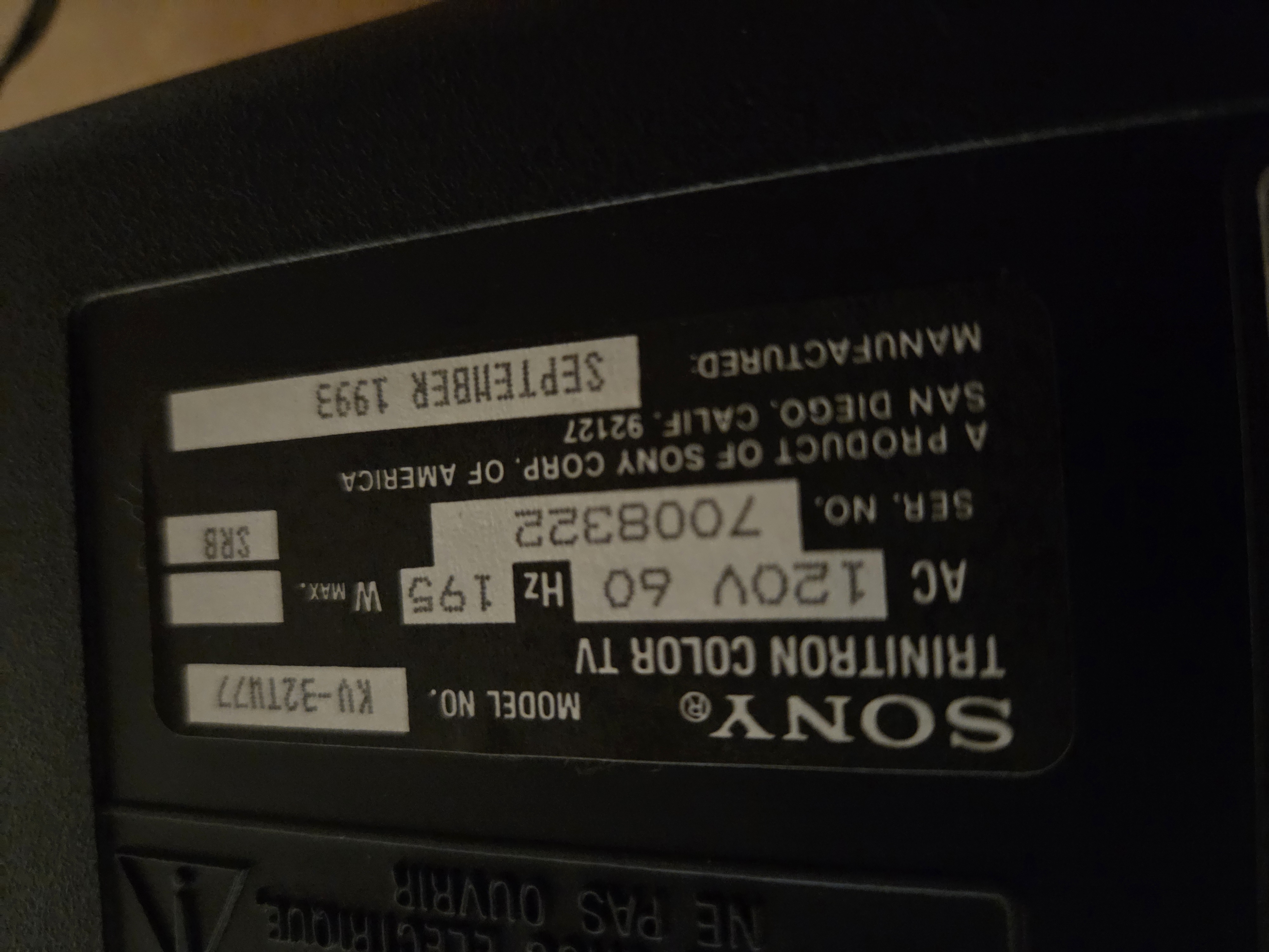 A cabinet-style standard definition Sony TV from the early 1990s. This particular 32-inch model came in two variants: a simulated woodgrain trim and an all black trim (KV-32TW78). Underneath the picture tube is a storage compartment for AV equipment covered by a hinged glass door.