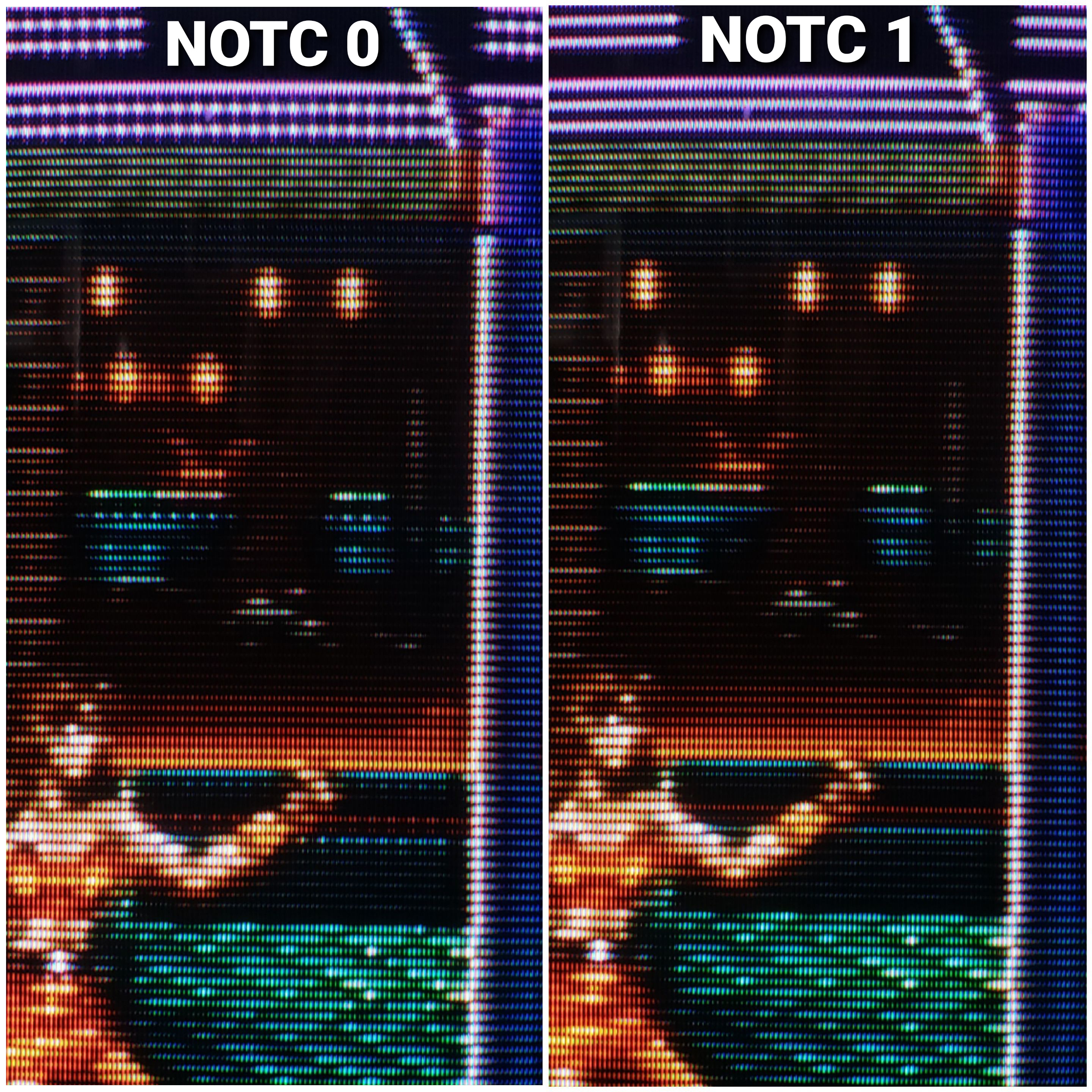 This set uses a 2-line digital comb filter which adds massive amounts of dot artifacts to composite 240p gaming content. All this extra comb filter-induced dot artifacting can be avoided by setting NOTC to 1 in the service menu when using composite. See the comparison photo in the gallery below. If using S-Video, set NOTC back to 0 to retain high frequency detail. Some manufacturers included a toggle for the notch filter in the user menu, but Sony hid it away in the service menu. Alternatively one could use an external notch filter - guide here - to avoid having to switch the toggle in the service menu when using composite.