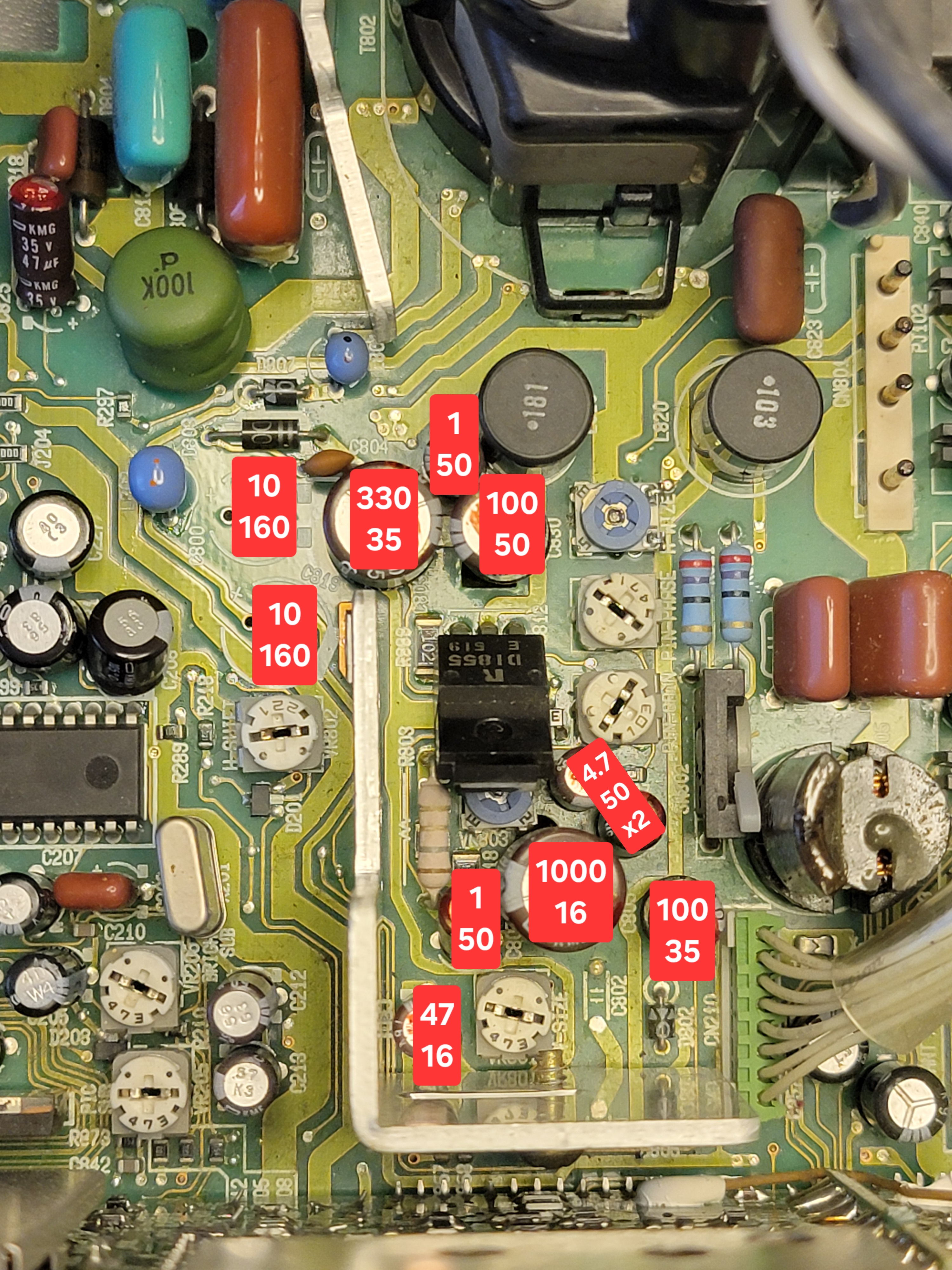 - No Power (red standby or green power light but otherwise dead) - Replace all power board caps including the two large 1800uF filter caps. Make sure to clean up any black residue off the board. BE VERY CAREFUL RECAPPING THE PCBS IN THE 6AD3. IT IS VERY EASY TO CAUSE TRACE DAMAGE OR RIP OUT VIAS. RECOMMEND SENDING TO A PROFESSIONAL.