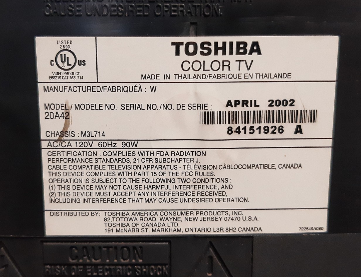 20" TV from Toshiba, manufactured by Orion. As their premium curved model, it features dual A/V inputs, stereo speakers, and a comb filter.