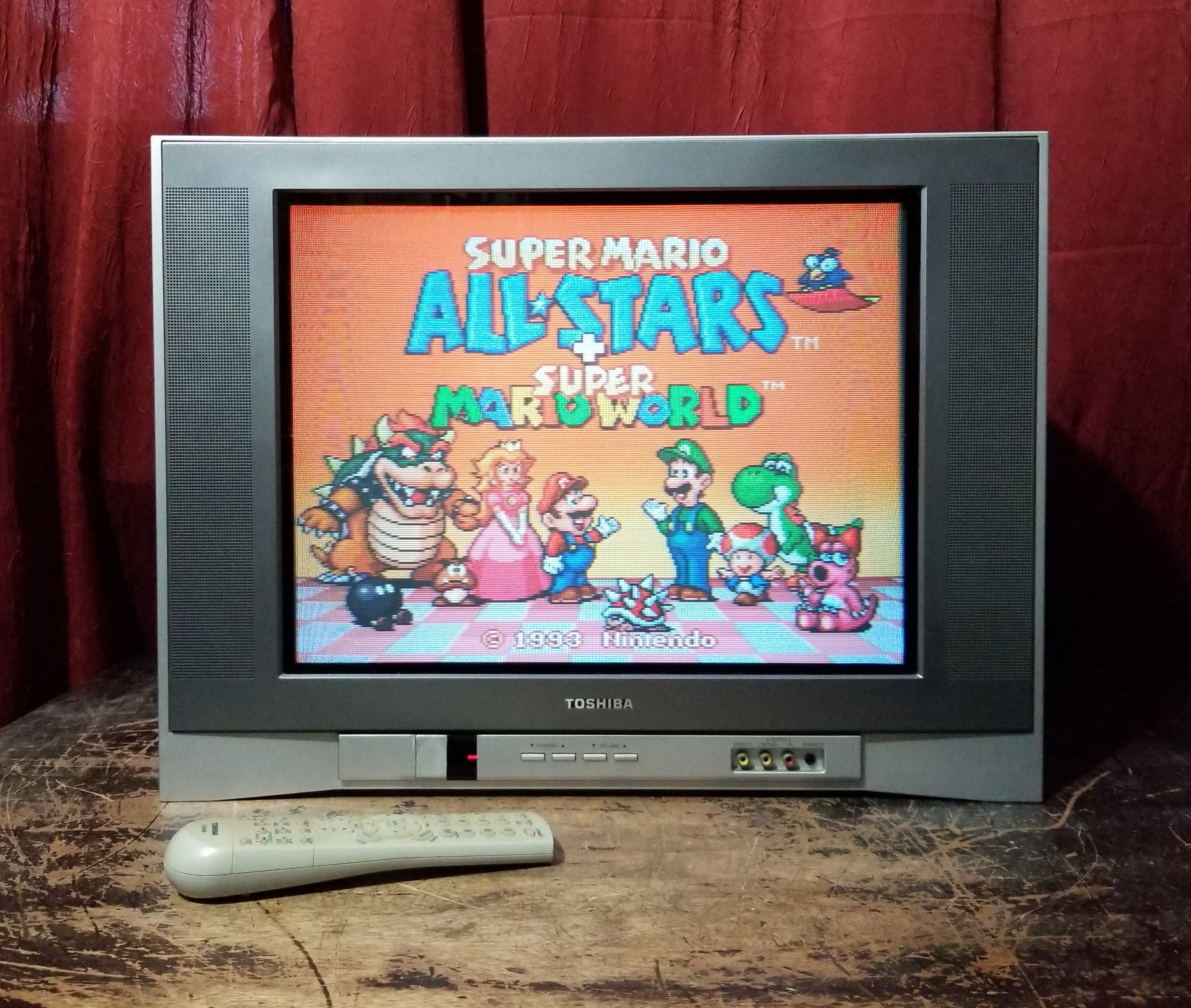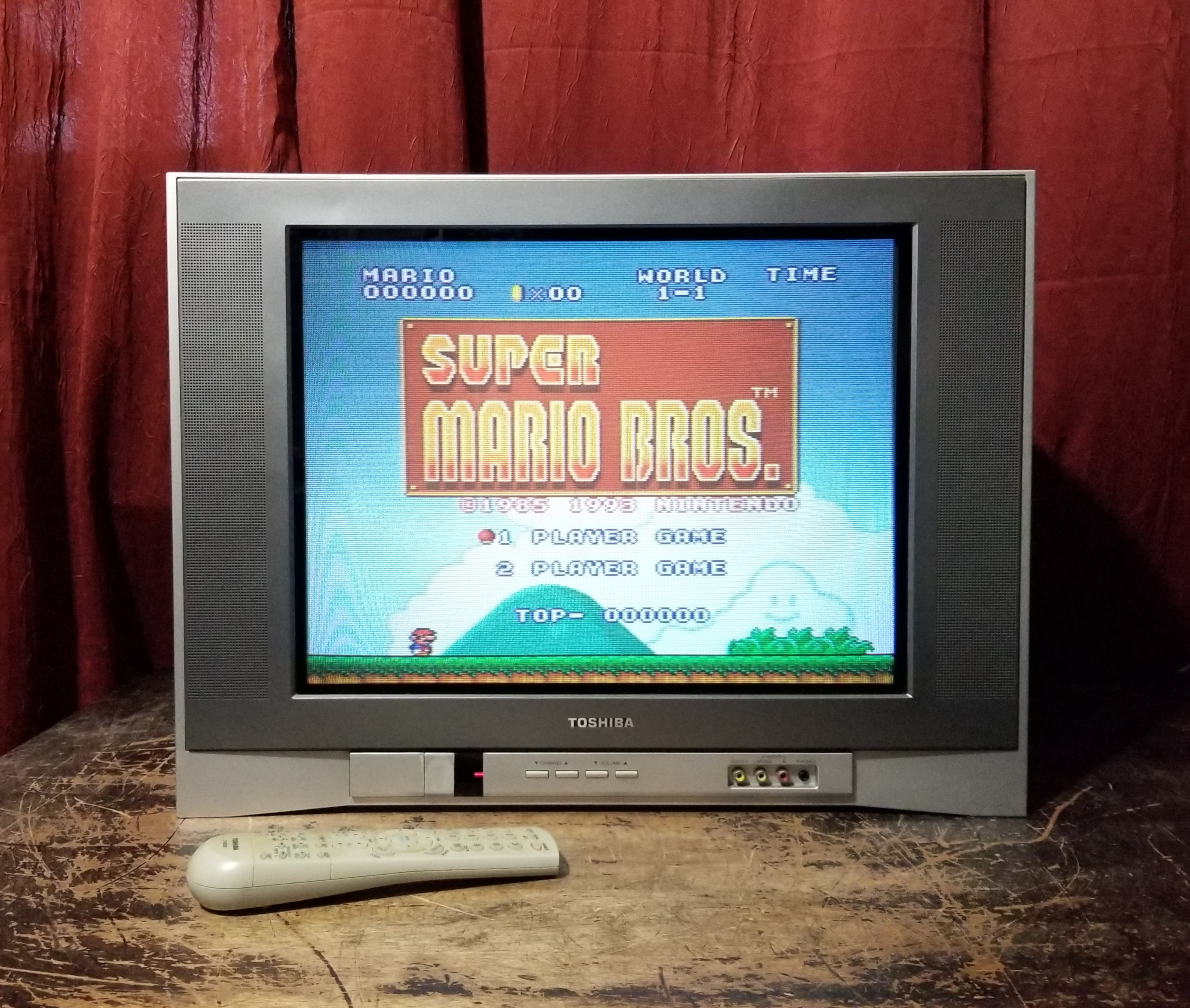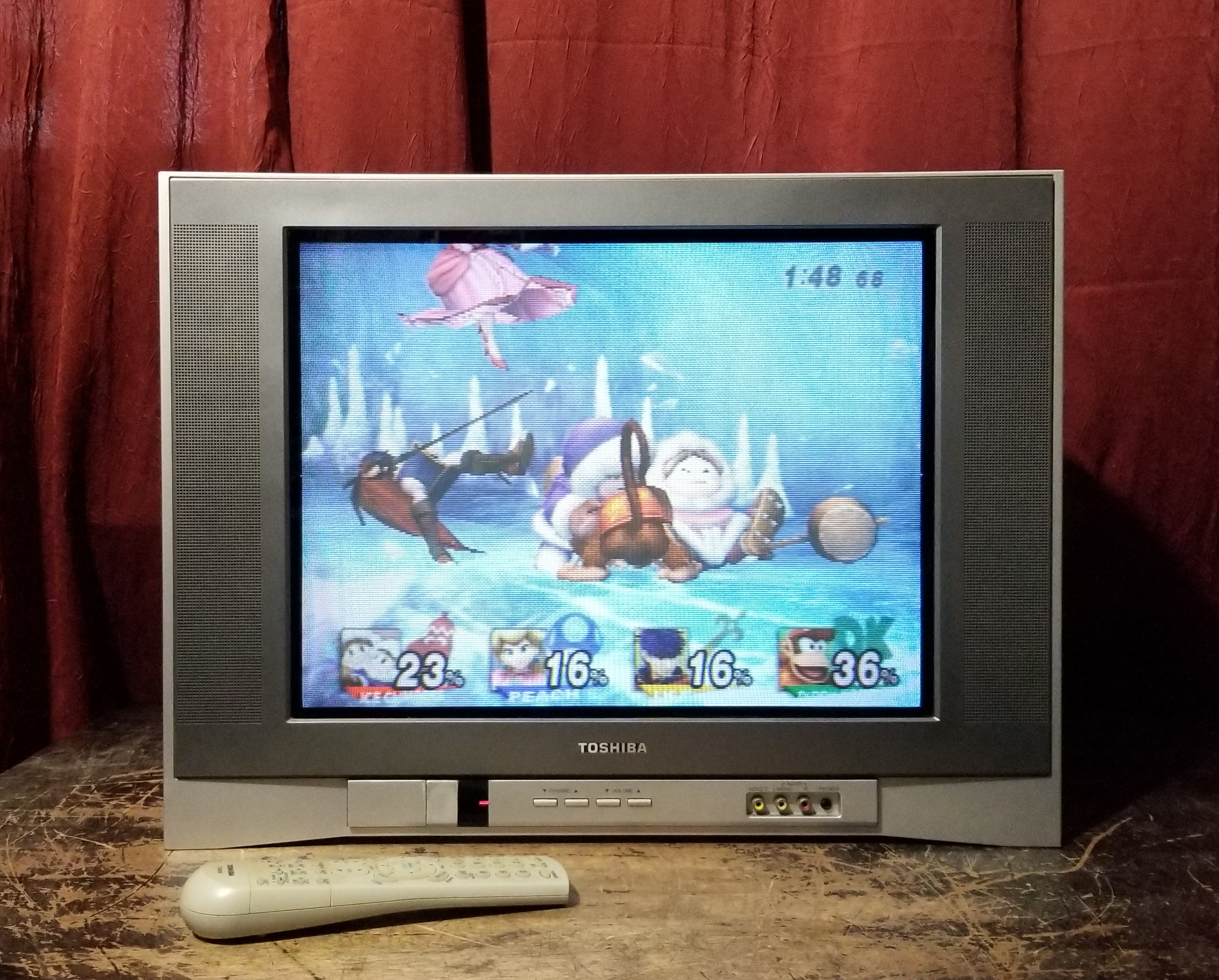 For composite decoding this set uses the Toshiba TC90A45FG, a 2-line digital comb filter introduced in 1997. Dot artifacting ranges from moderate to severe, blending effects may be broken, and edge artifacts are mostly moderate to severe. An example of the many dot artifacts are highlighted in the picture below in red. If the set has a higher bandwidth input such as s-video or component, then using an external notch filter to decode composite instead and sending that to the set would remove nearly all dot artifacts, blend all dithering patterns, and reduce edge artifacts (guide to using an external notch here).