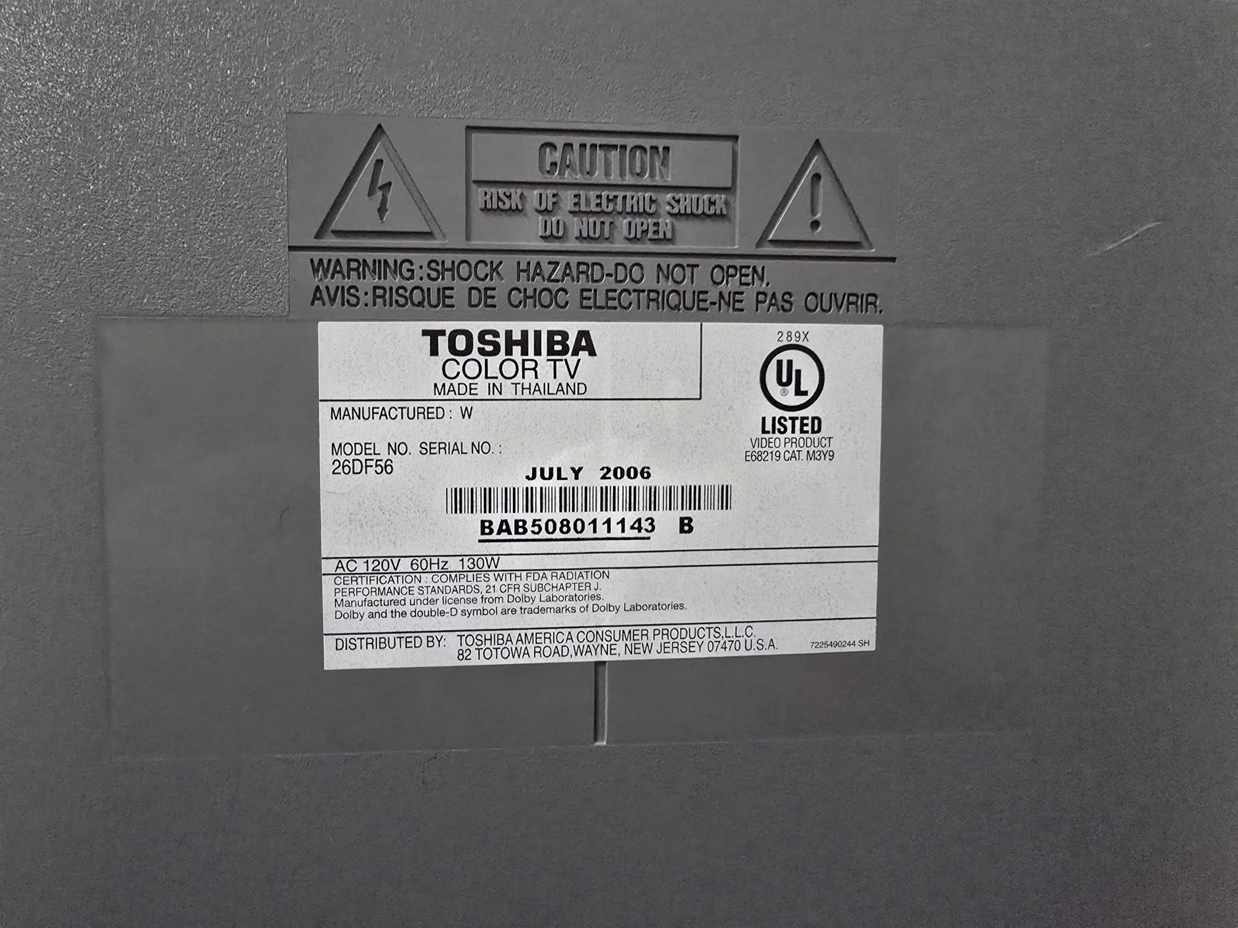 26" flat widescreen standard-definition CRT by Toshiba, one of the few of its kind released in North America. Has RF, composite, s-video and component input with analog and digital stereo sound. Features an ATSC tuner. Originally manufactured by Orion in Thailand.