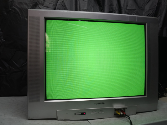 27" curved screen CRT TV, manufactured by Orion and sold by Toshiba. Features a full set of inputs including RF, composite, s-video, and component