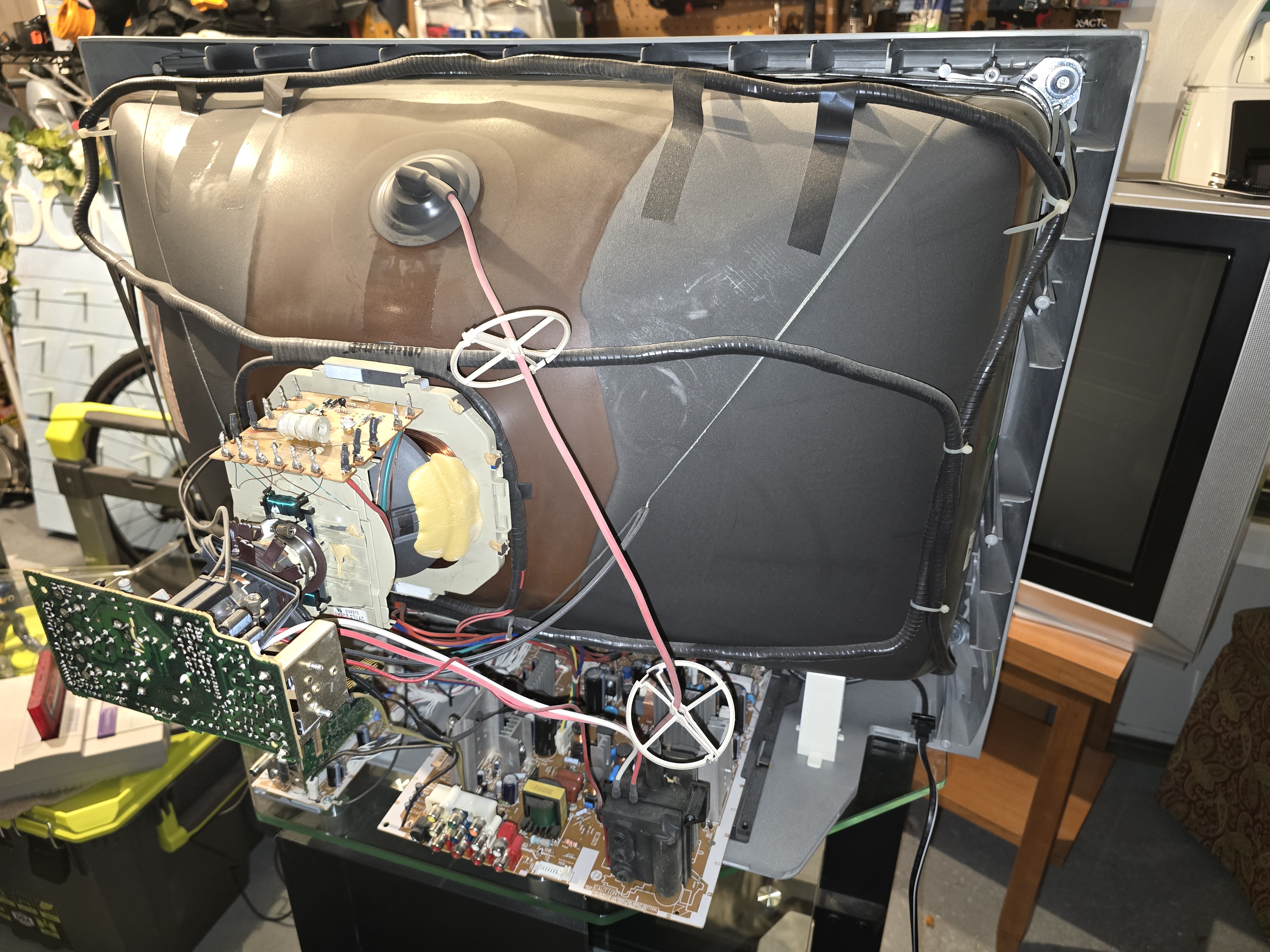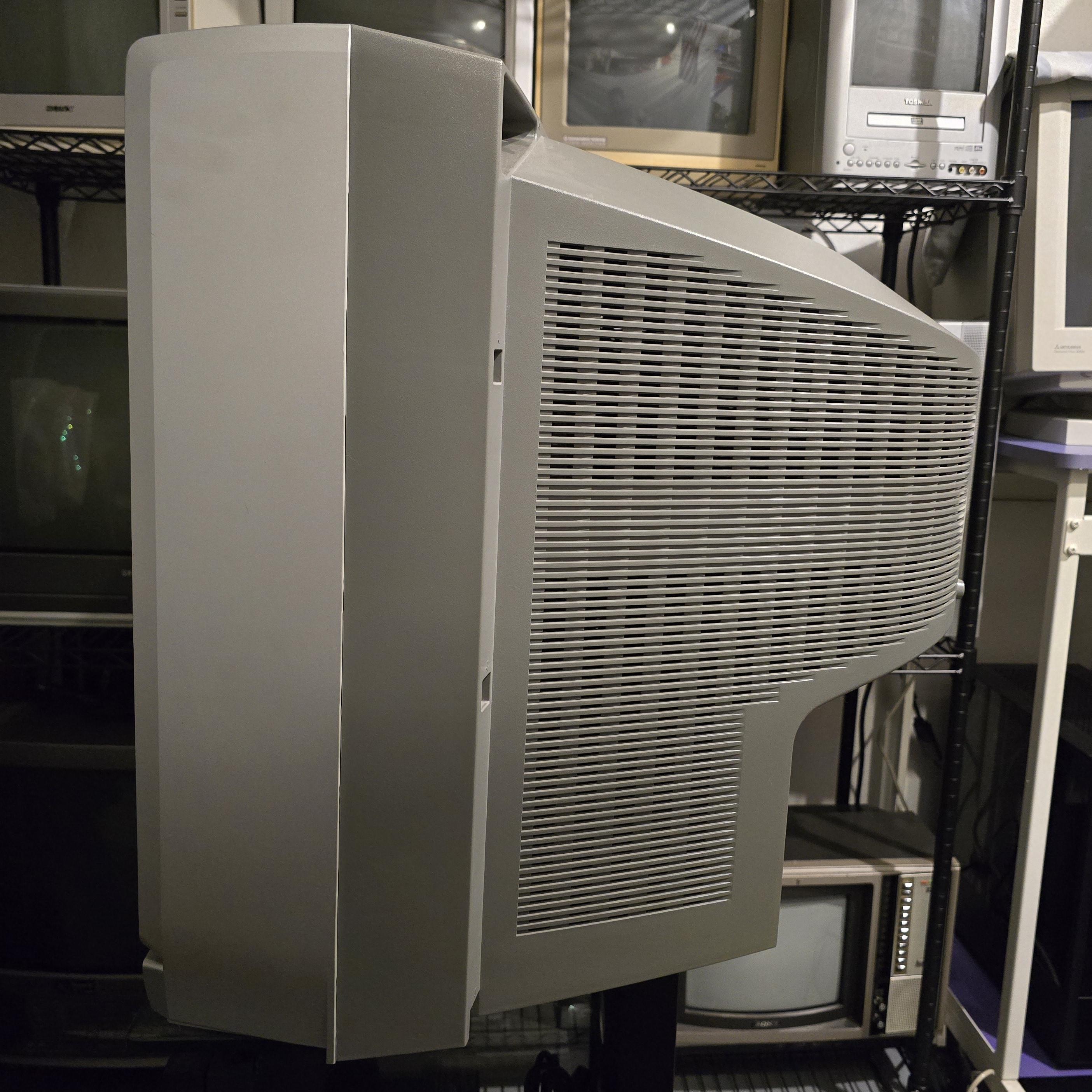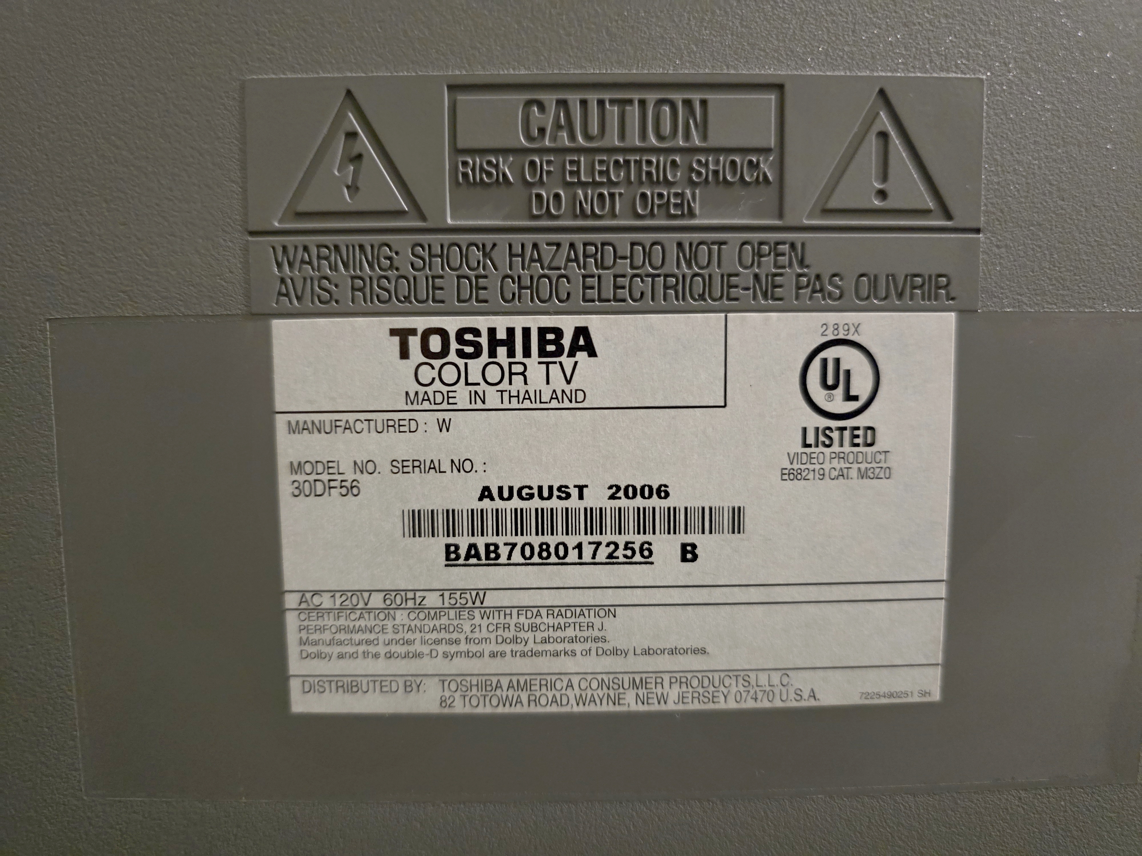 30" flat widescreen standard-definition CRT by Toshiba, one of the few of its kind released in North America. Has RF, composite, s-video and component input with analog and digital stereo sound. Features an ATSC tuner. Originally manufactured by Orion in Thailand.