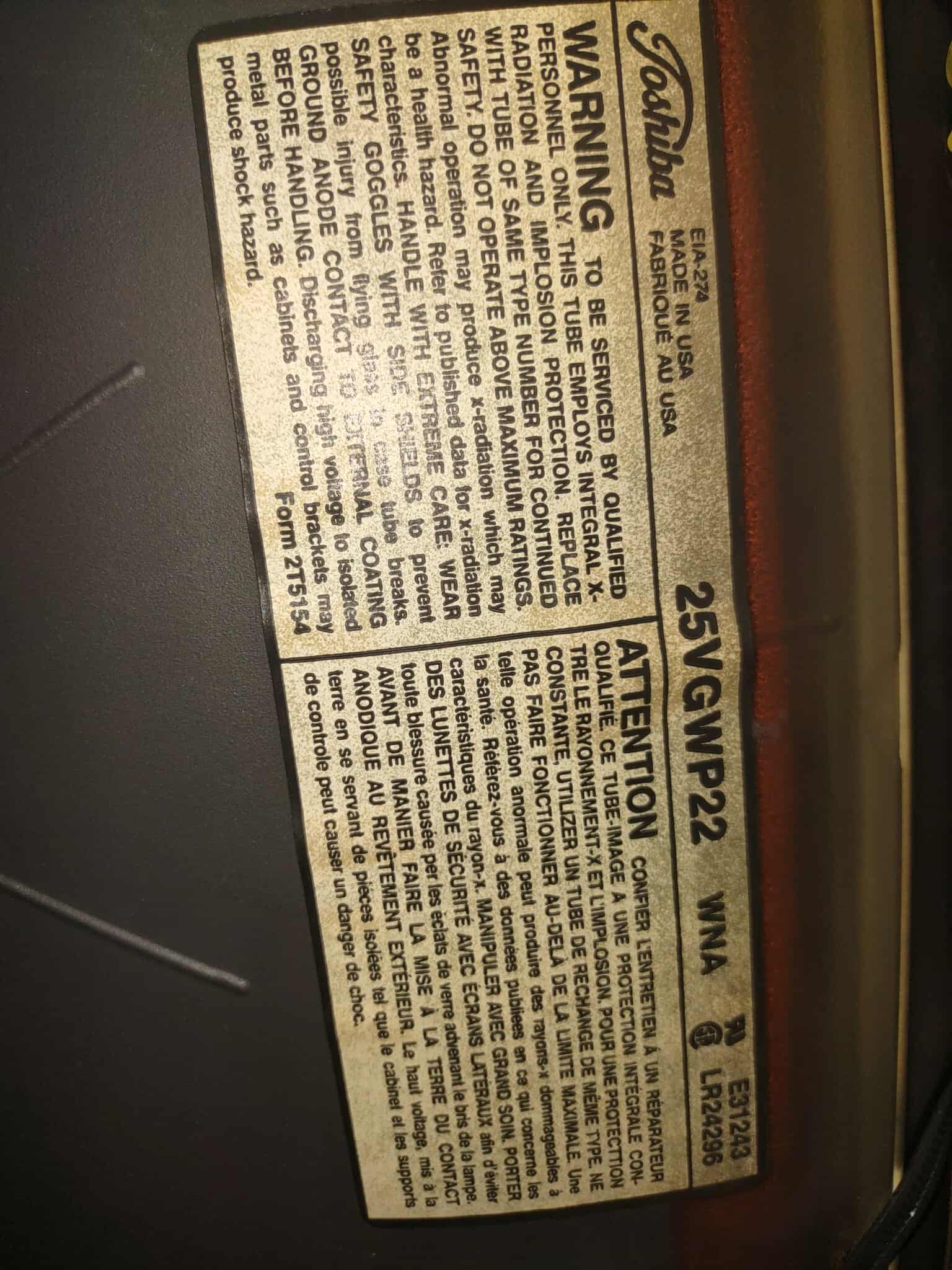 | Tube: | RCA , 25VGWP22 |