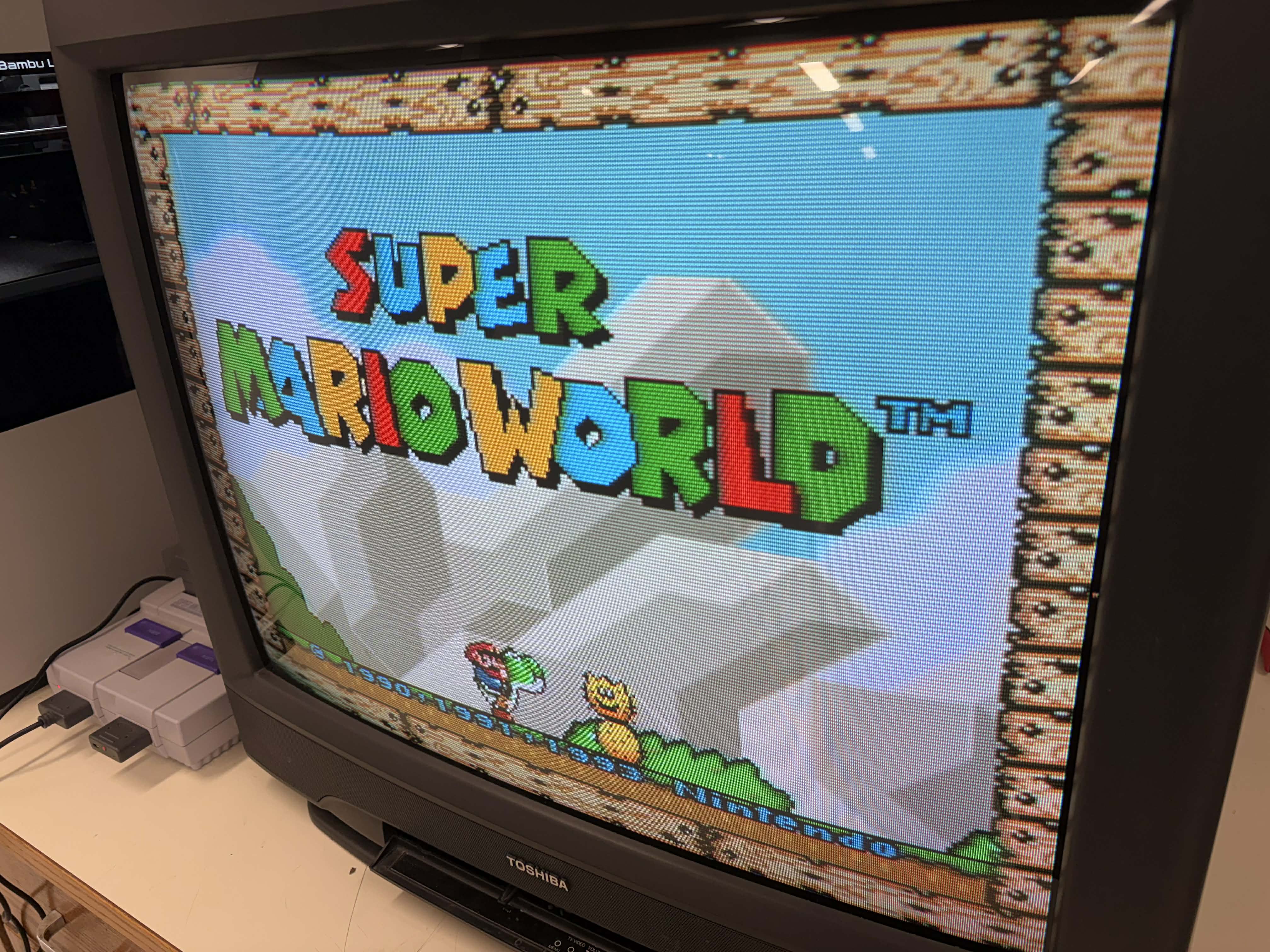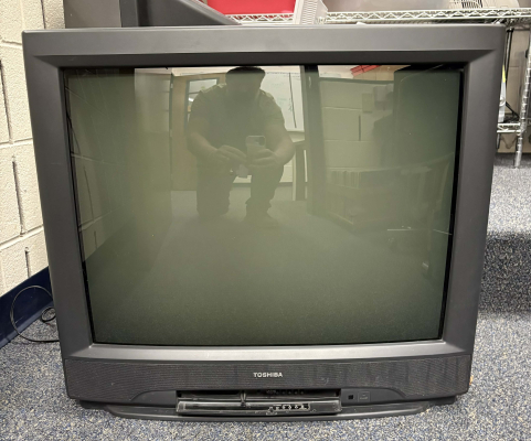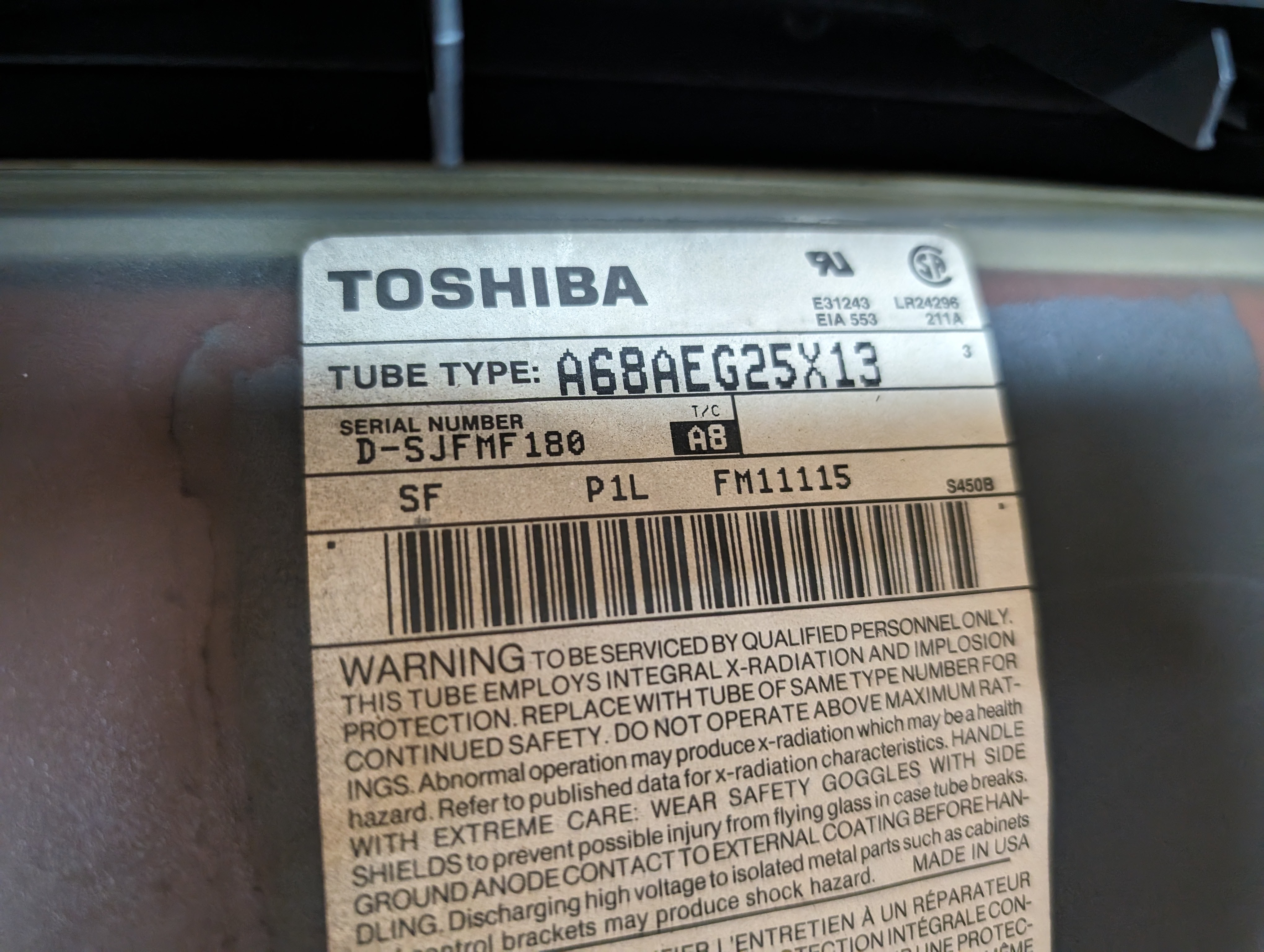 Midrange 27" CRT by Toshiba, made in the USA in 1995. Has RF, composite, and s-video inputs with stereo sound.