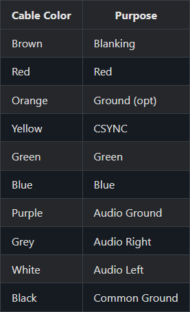 The OSD mux method uses Sunthar's color coding convention wired to a SCART connector: